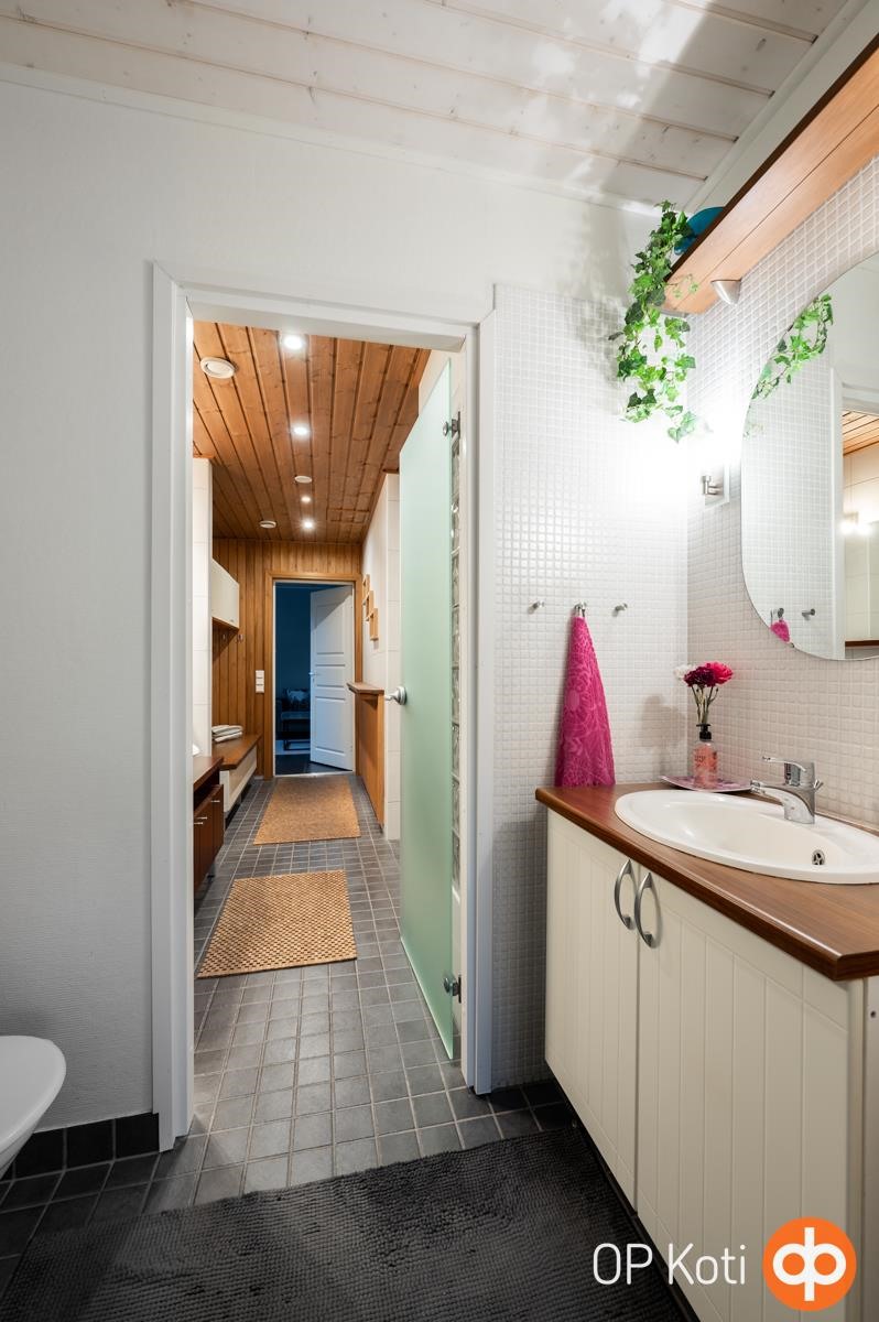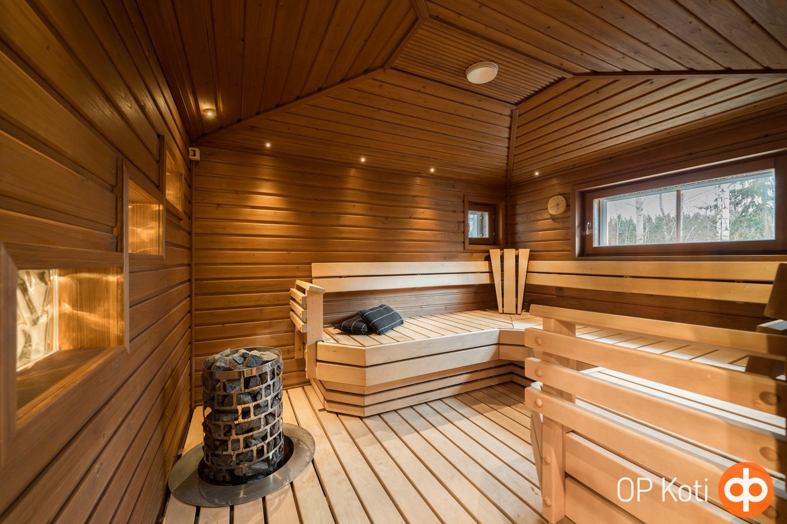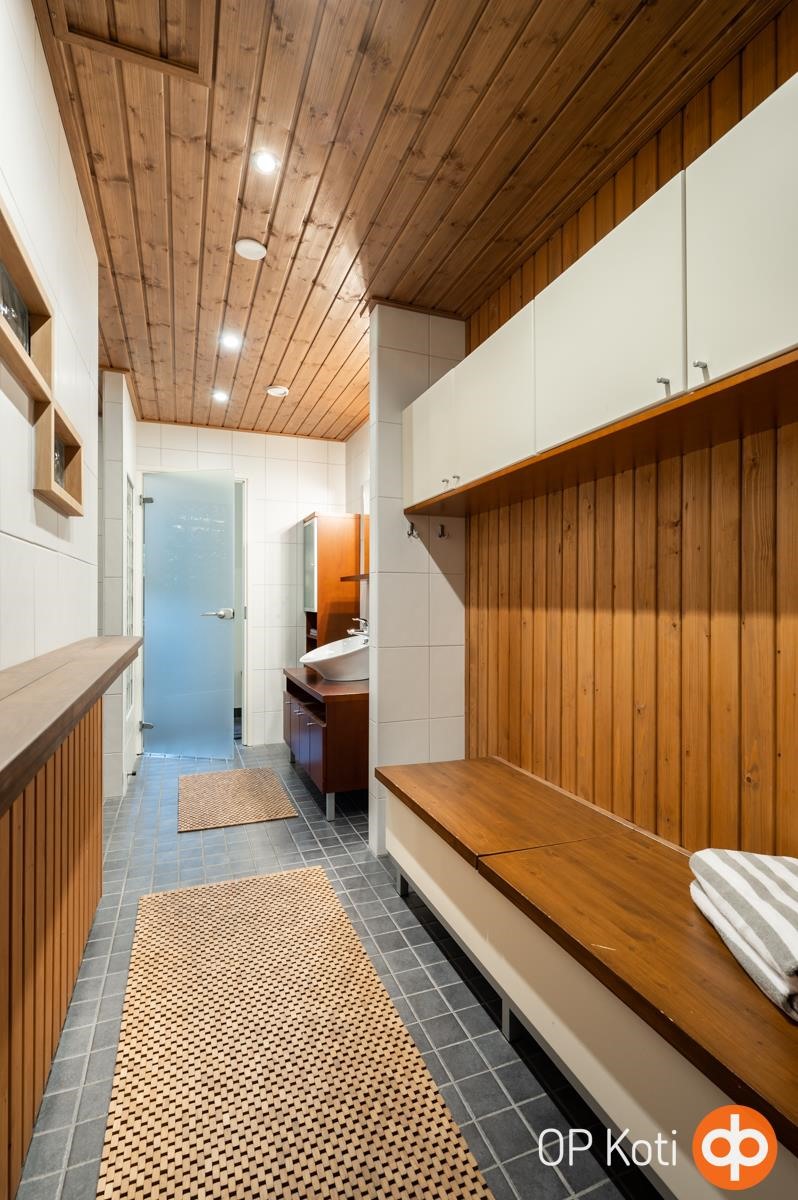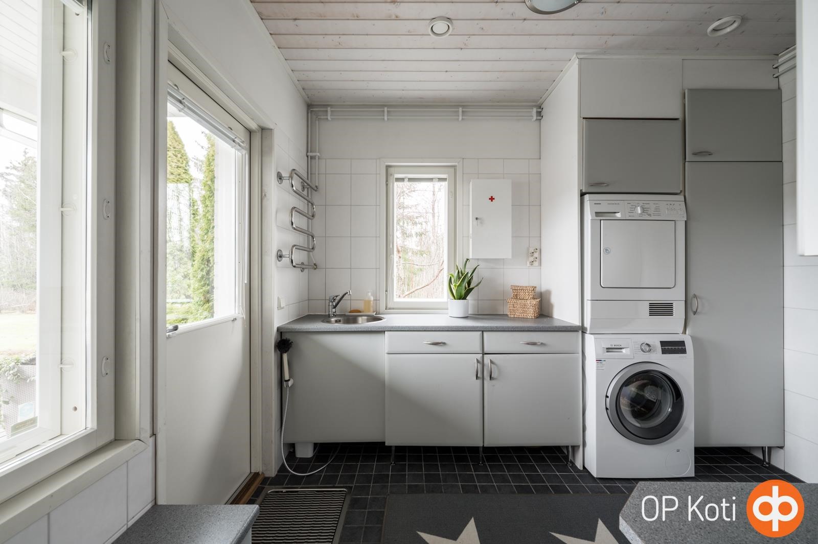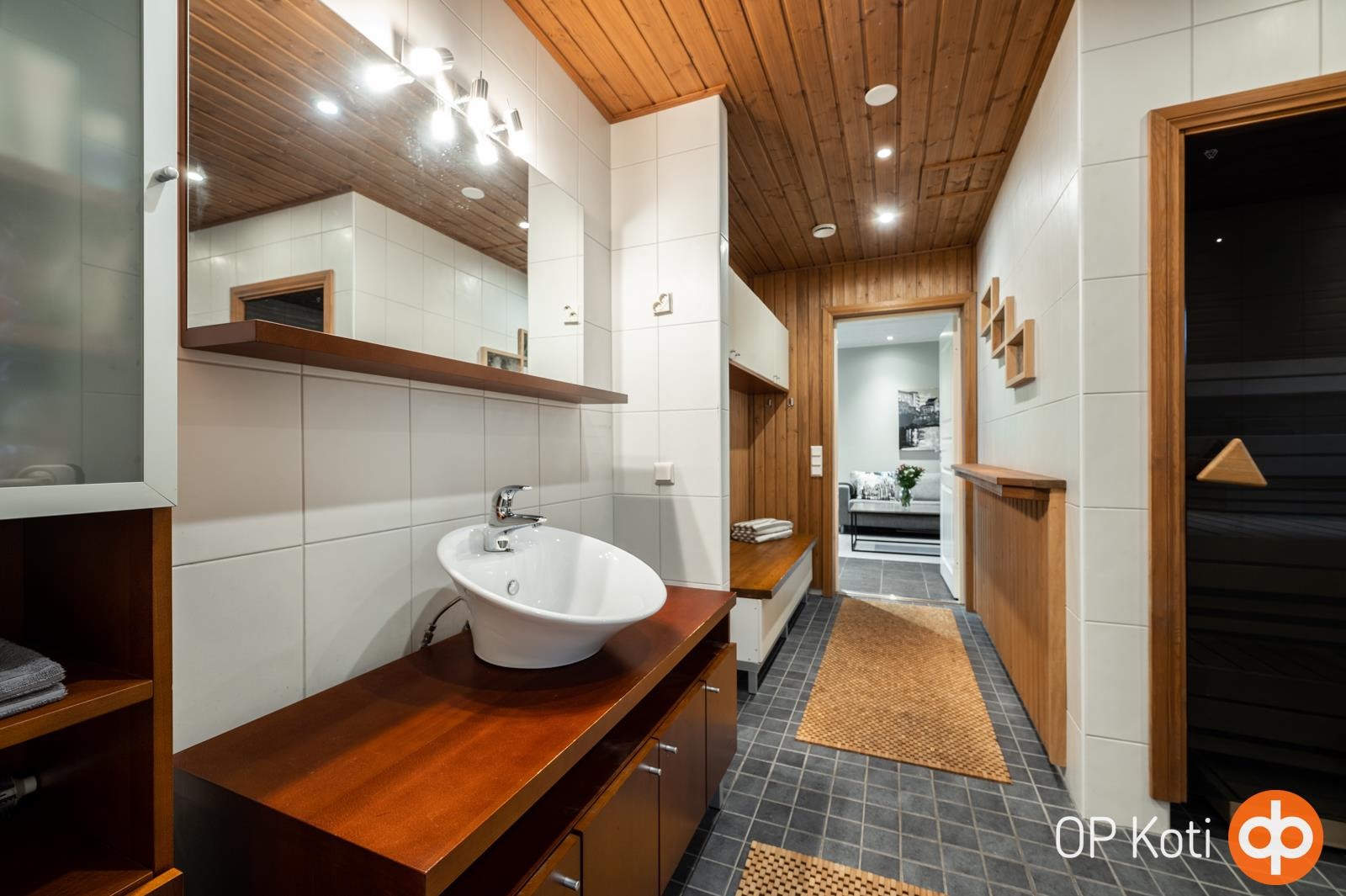 Kodissa on lisäksi erillinen pukuhuone, tilava kylpyhuone sekä sauna. Erillinen kodinhoitohuone omalla uloskäynnillä ja käytännöllisellä kurakolla helpottaa arkea erityisesti lapsi- ja lemmikkiperheissä.