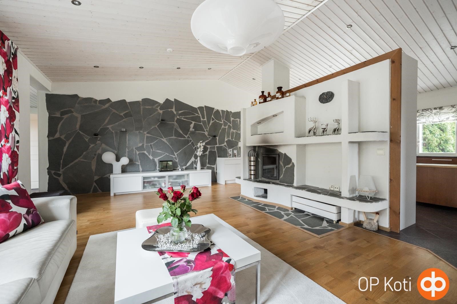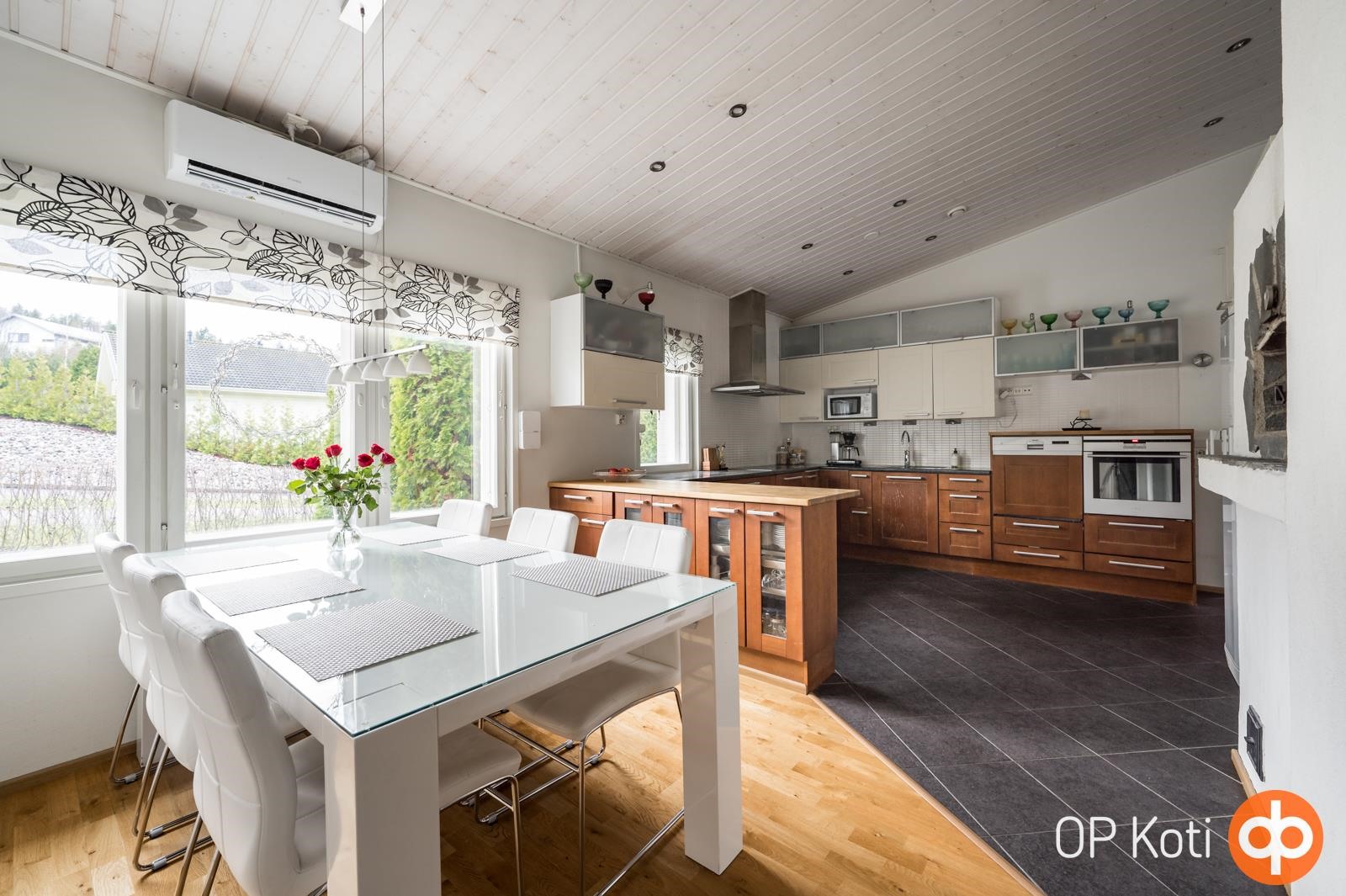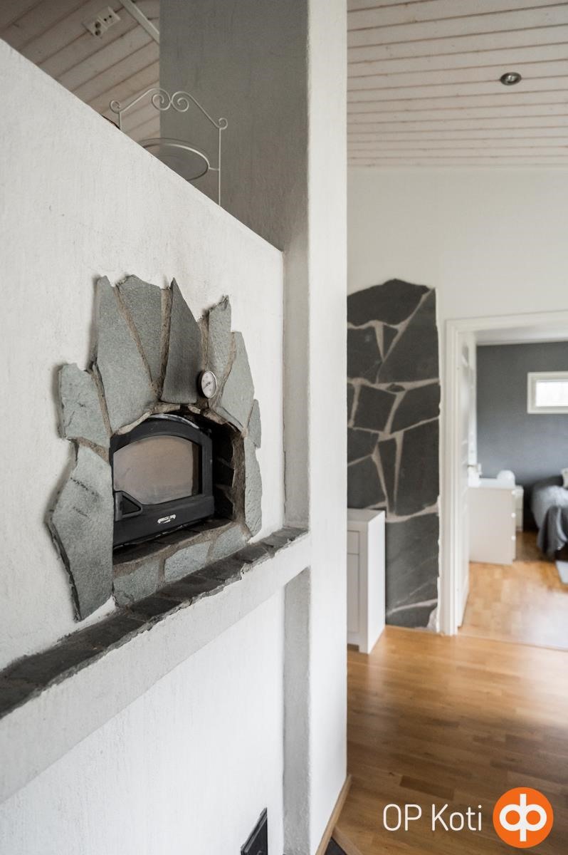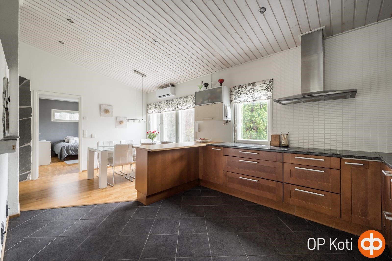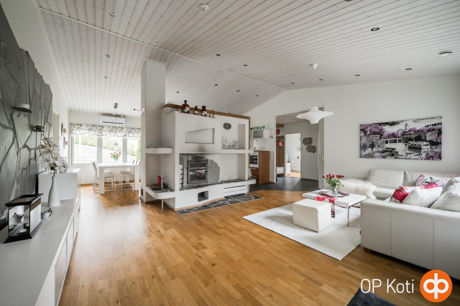 Avoin mutta selkeästi rajattu keittiö ja ruokailutila yhdistyvät olohuoneeseen, jota jakavat tunnelmaa ja lämpöä tuovat takka ja leivinuuni. Keittiössä on runsaasti työskentely- ja säilytystilaa. Päämakuuhuoneesta on käynti wc-tilaan ja edelleen kylpyhuoneeseen, mikä tuo arkeen sujuvuutta ja hotellimaista mukavuutta.