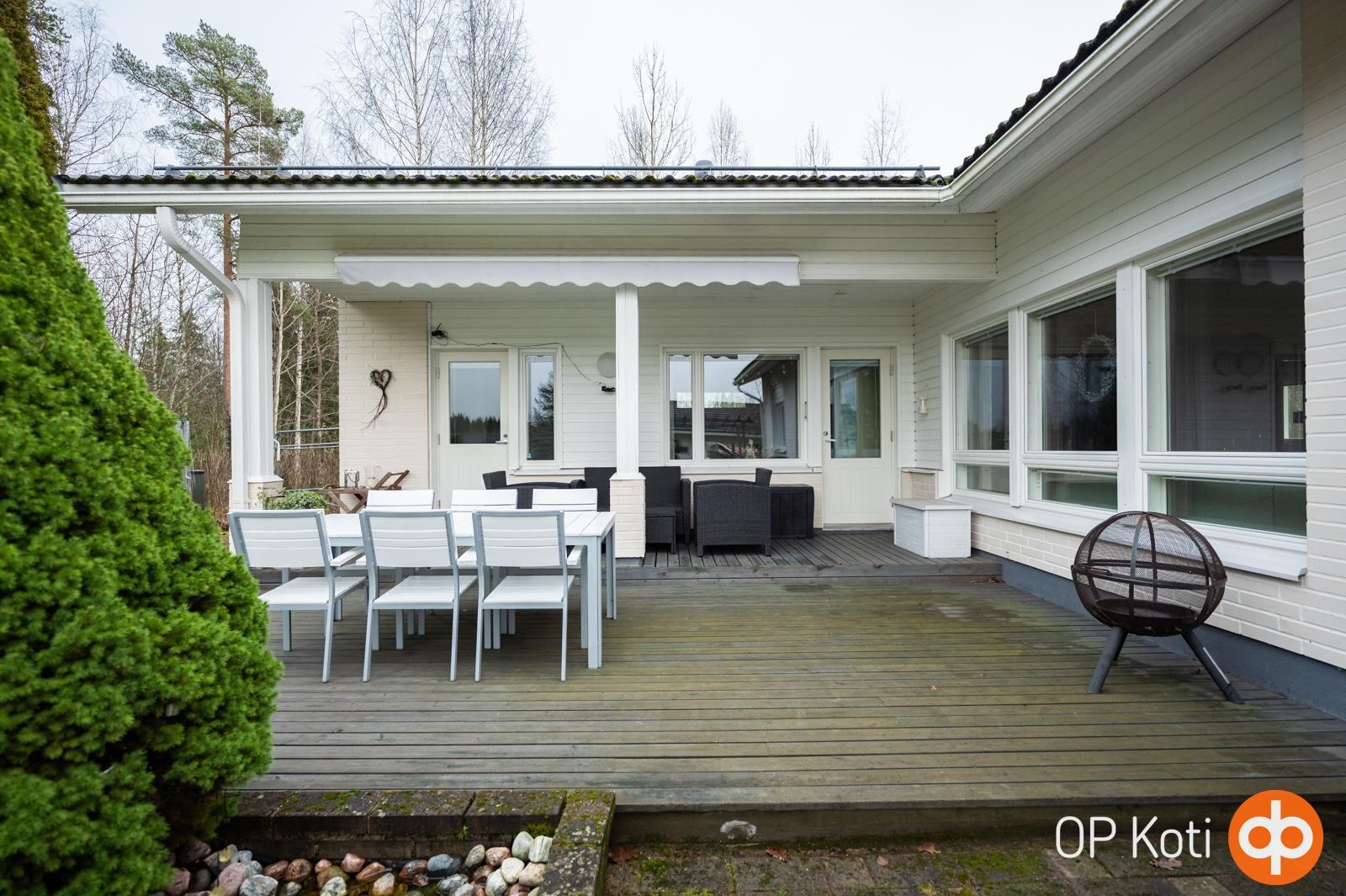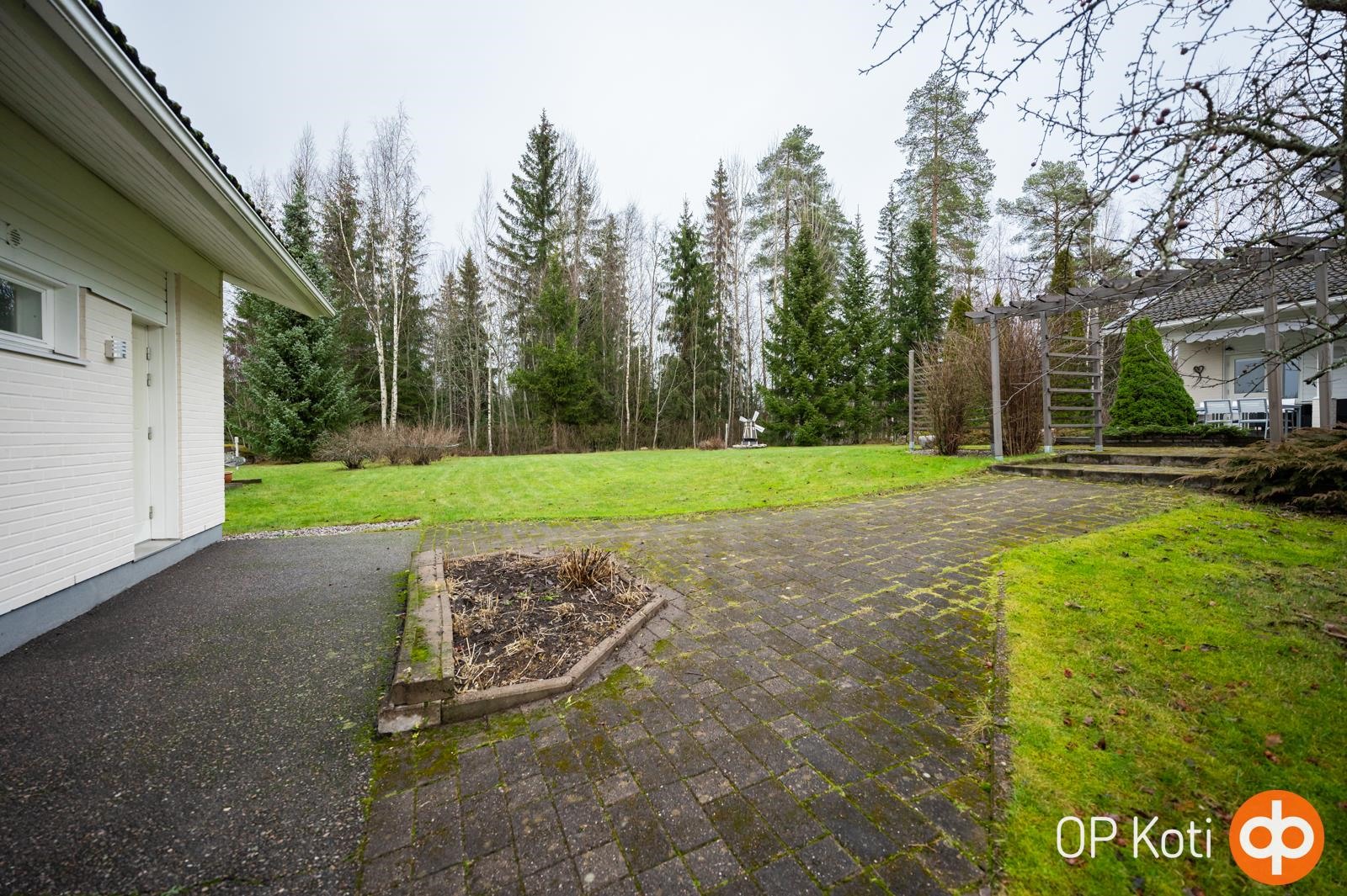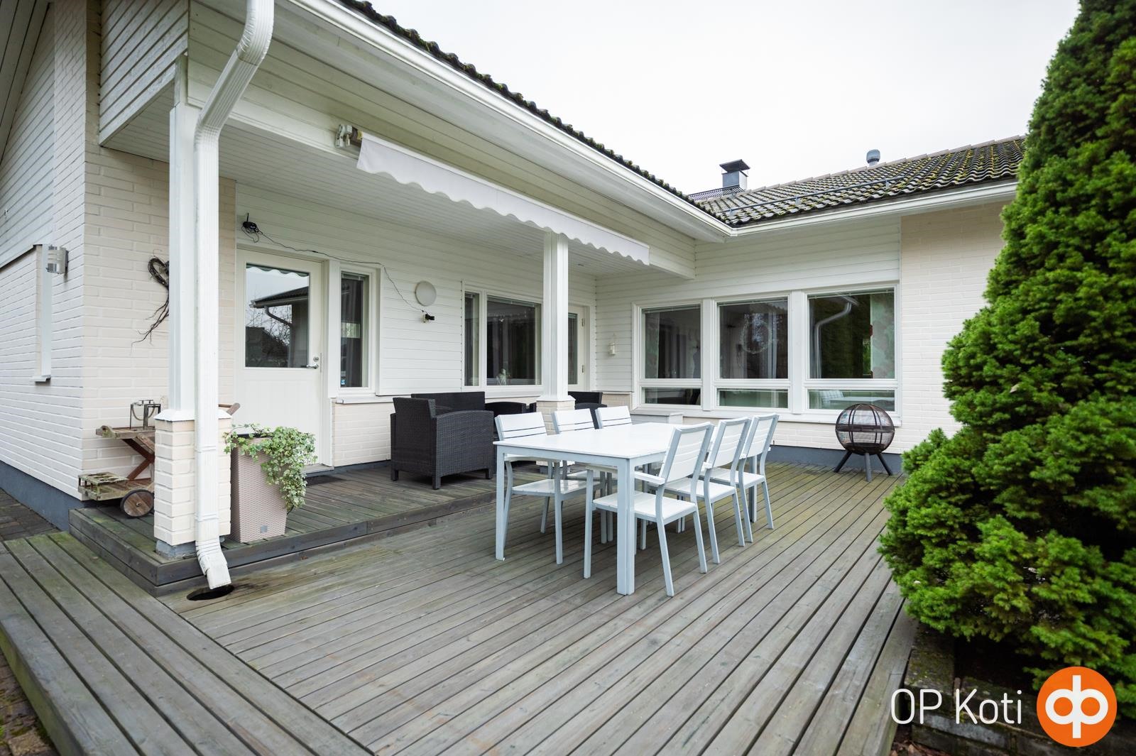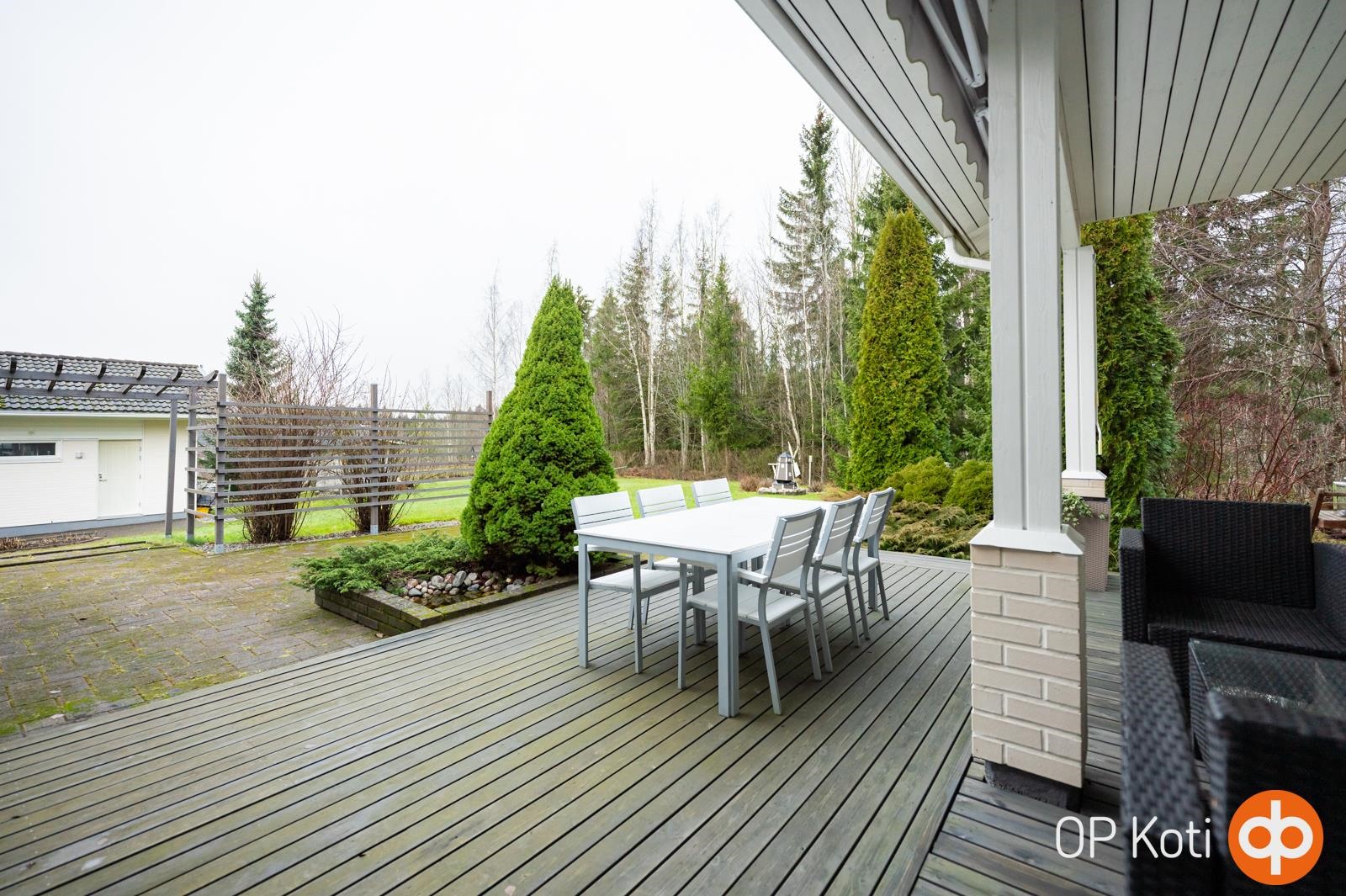 Suojaisa terassi takapihan puolella ja tasainen ja kaunis nurmikkopiha tarjoaa turvallisen ympäristön lasten leikeille ja vapaa-ajan viettoon. Pihapiirissä on erillinen kahden auton autokatos sekä lämmin varasto, jonka koko on noin 30 m².