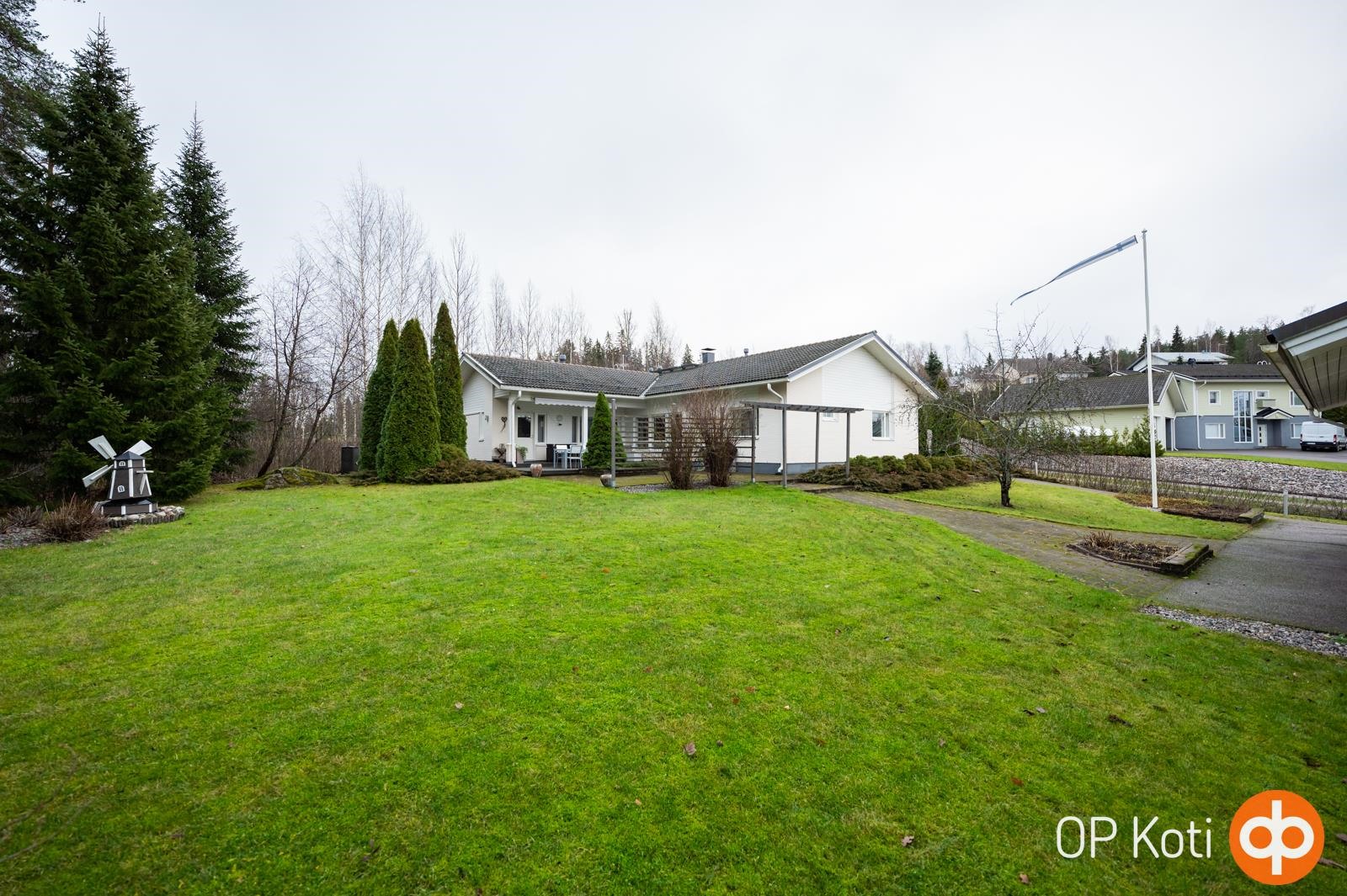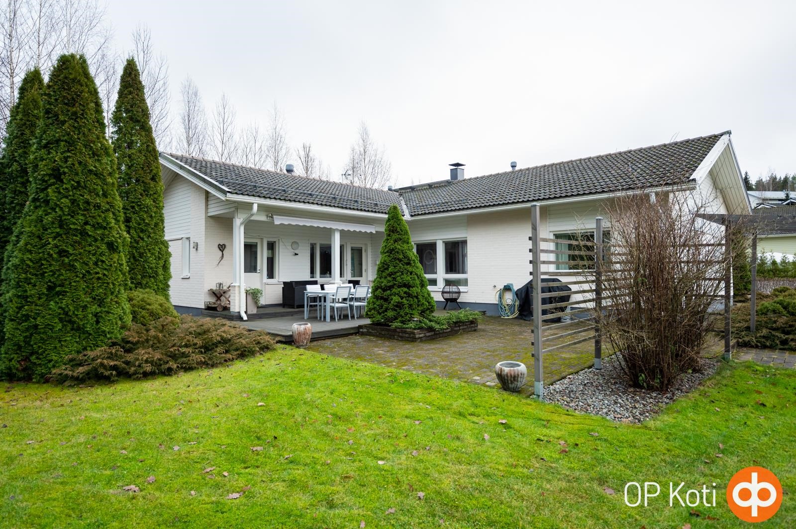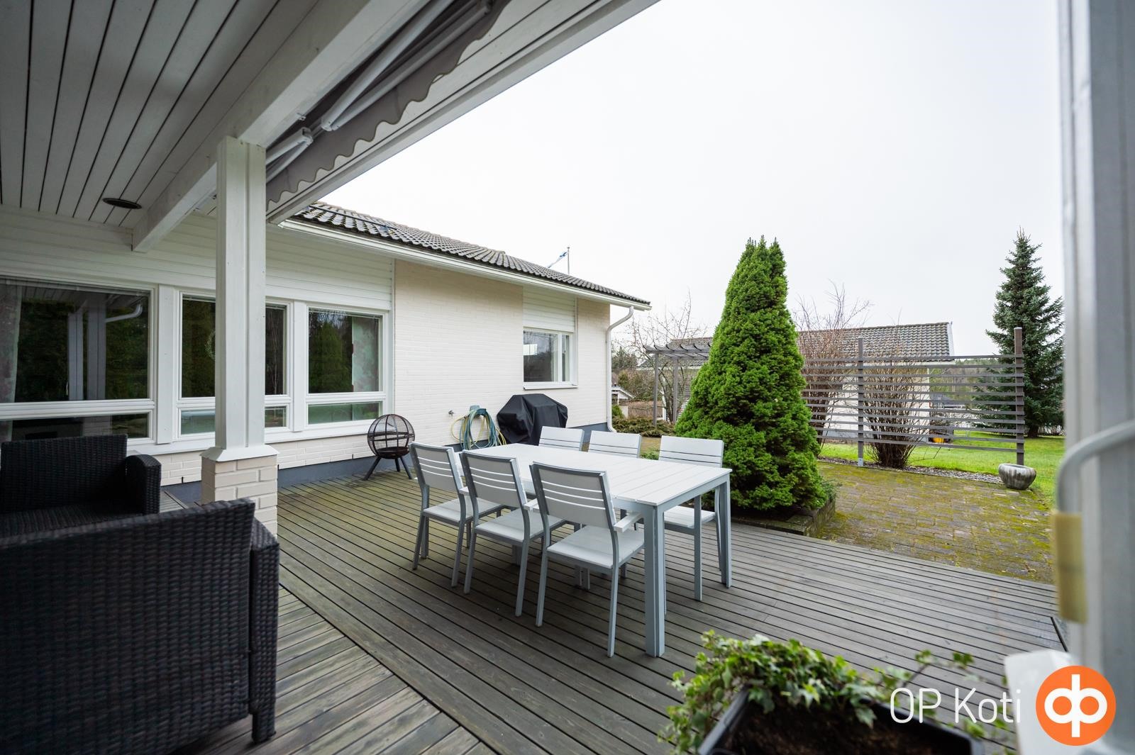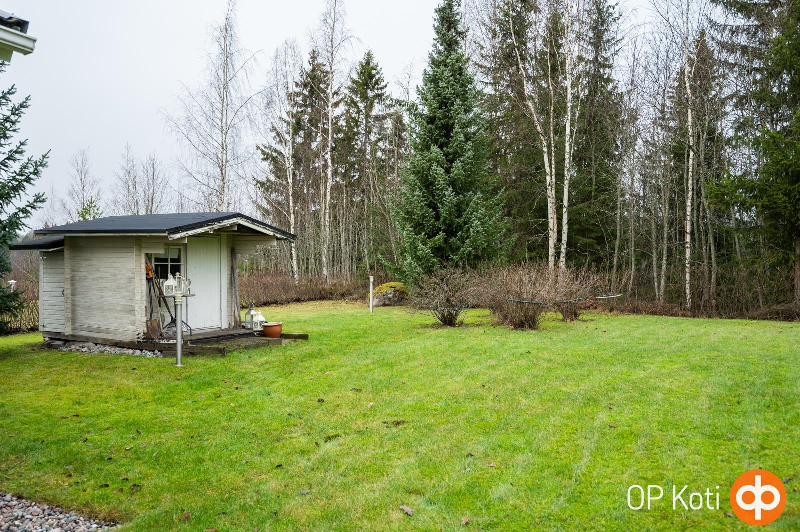 Suojaisa terassi takapihan puolella ja tasainen ja kaunis nurmikkopiha tarjoaa turvallisen ympäristön lasten leikeille ja vapaa-ajan viettoon. Pihapiirissä on erillinen kahden auton autokatos sekä lämmin varasto, jonka koko on noin 30 m².