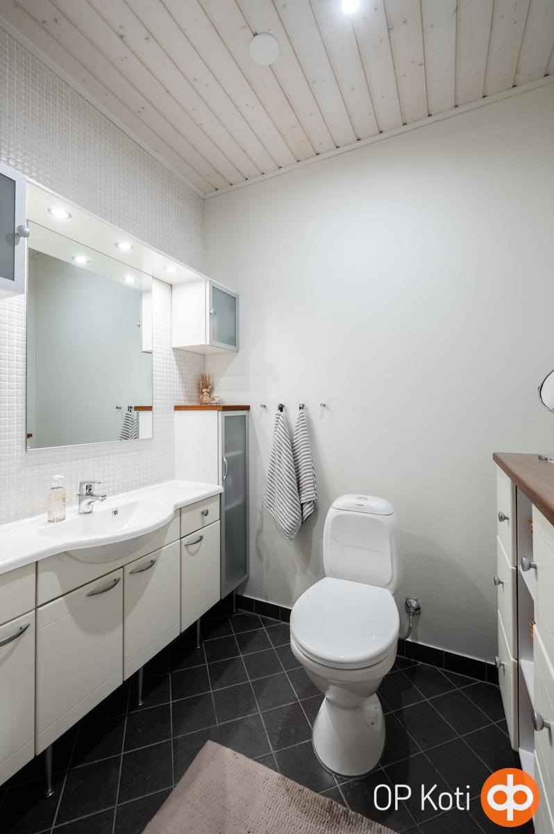 - Sauna, sähkökiuas, kylpyhuone, erillinen wc, suihku, peilit, kaapit, allaskaappi, pesukoneliitäntä, lattialämmitys, kiinteät valaisimet.