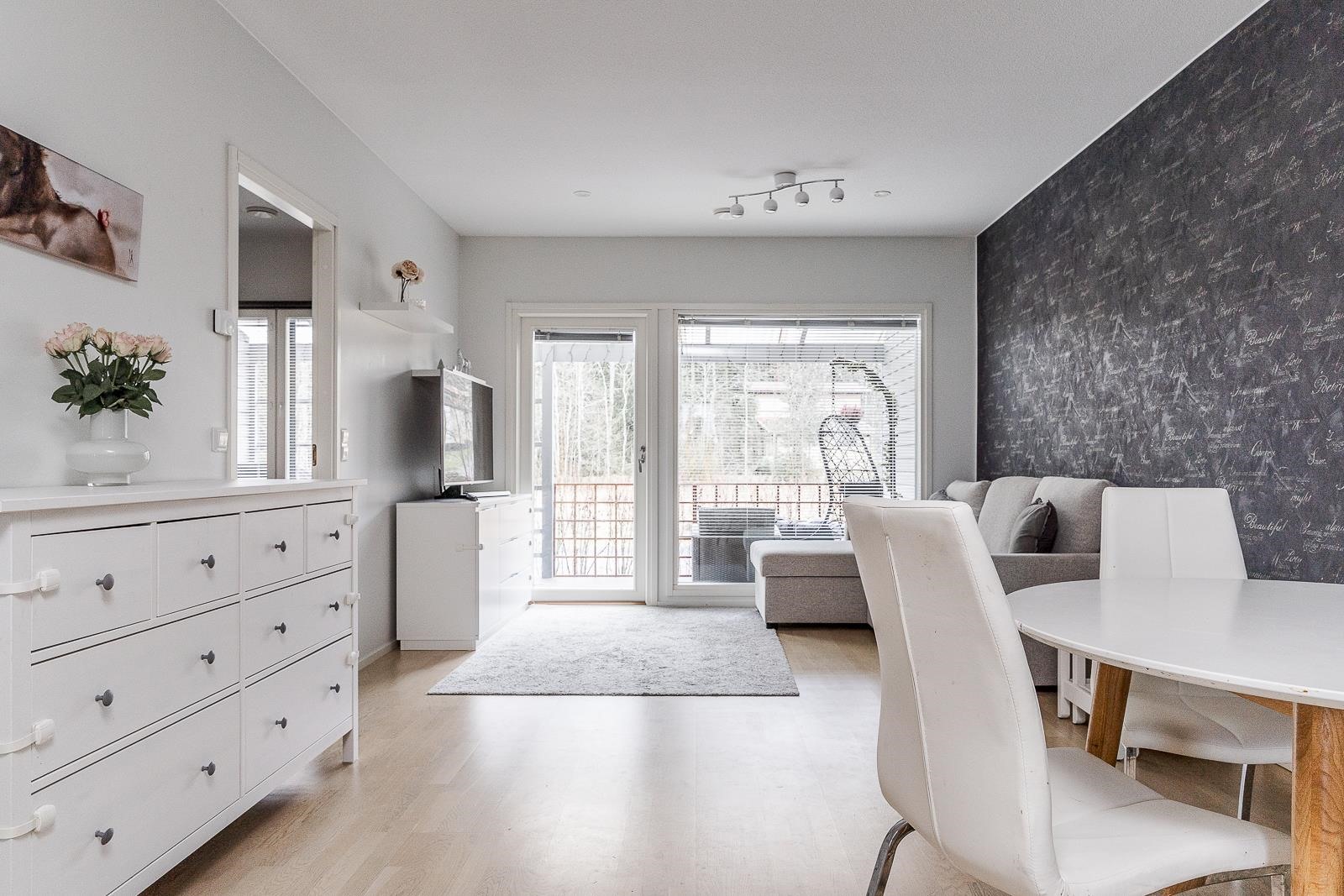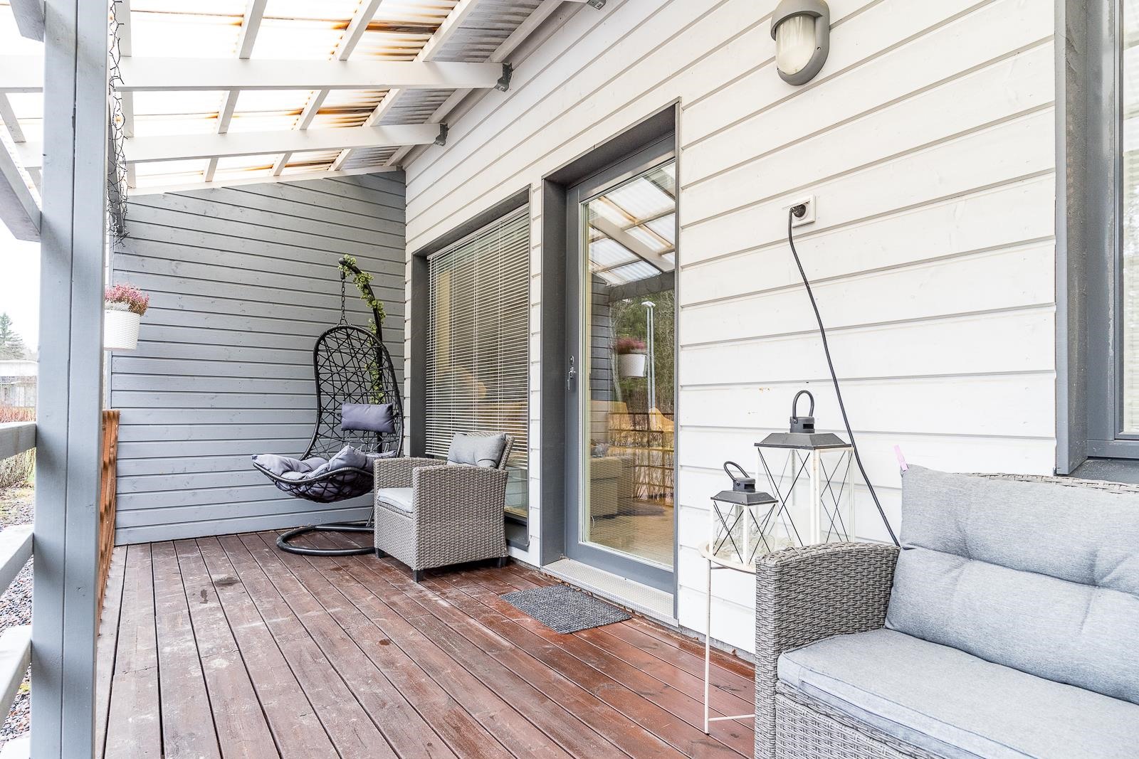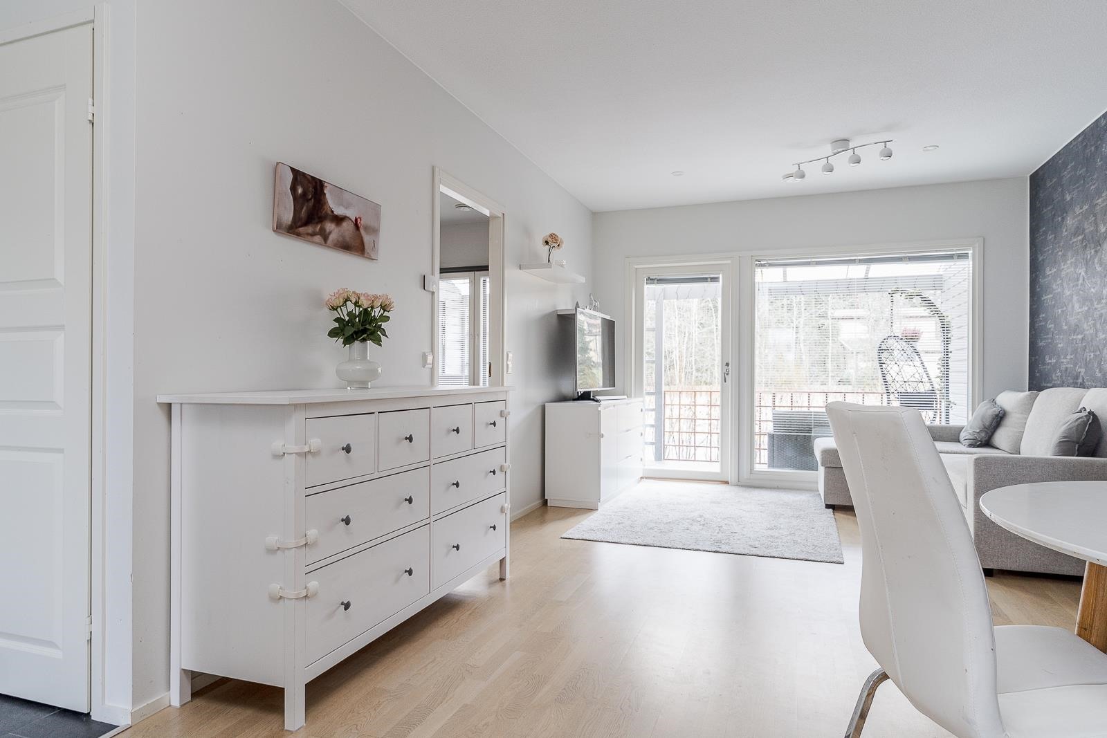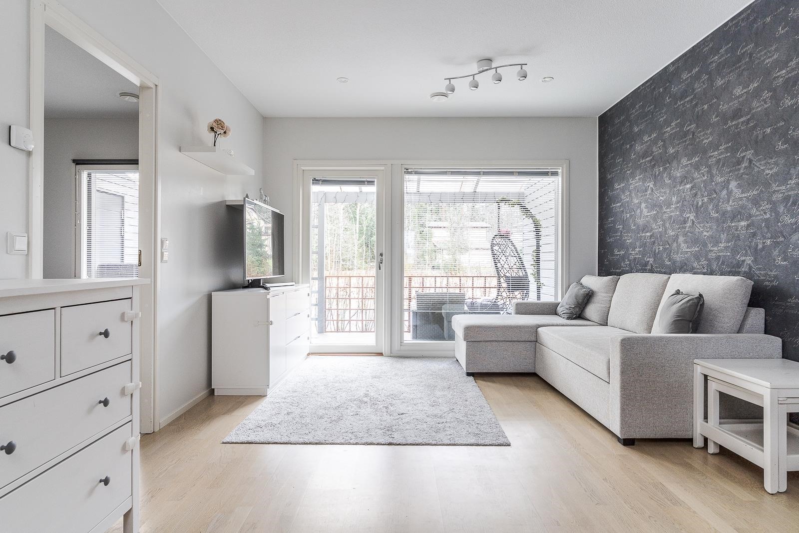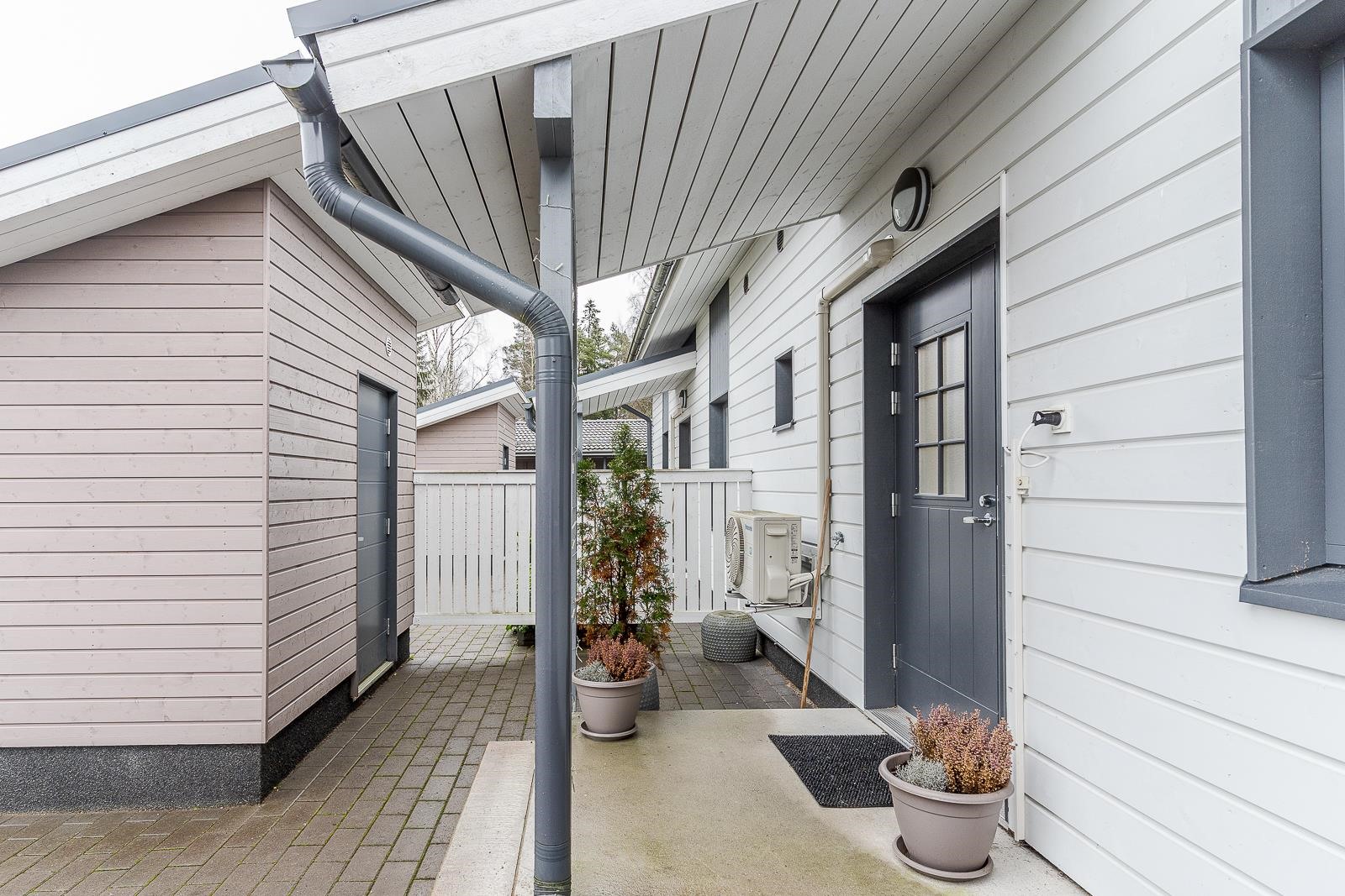 Uudella asuntoalueella miltei uutta vastaava rivitalohuoneisto, etelä-pohjoissuunnassa. Tilankäytöltään väljänoloinen asunto: ikkunallisessa keittiössä runsaat kaappitilat ja kivityötasot sekä laadukkaat kodinkoneet. Ikkunan suunta on etupihalle. Iso olohuone on helppo sisustaa - pitkää seinätilaa on kalustukselle tai isolle tv:lle. Olohuoneesta on käynti katetulle takaterassille, joka aukeaa aamupäivään ja siellä on hyvät tilat kalustukselle. Terassilla on myös huoneiston kylmä varastotila pihatavaroille. Makuuhuoneen yhteydessä on tilava vaatehuone. Sisustus on moderni ja nuorekas, pääosin vaaleasävyinen. Lattiassa on asuintiloissa aito parketti, keittiössä ja eteisessä kosteutta kestävä laatta. Kalustetussa pesuhuoneessa on tilat myös pyykkihuollolle, ja löylyhuoneseen valoa tuo ikkuna. Kalustettu wc on erillinen. Eteistilaa avartaa peililiukuovi kaapisto, joka on myös tehokas säilytystila. Lämmityksenä on huoleton kaukolämpö, lämmönjako lattialämmityksenä. Hellekesän varalle on huoneistoon asennettu myös ilmalämpöpumppu. Huoneistokohtainen ja lämmin ulkovarasto on ikkunallinen ja tilava, ja sijaitsee lähellä asunnon sisäänkäyntiä. Autolle on tietenkin oma katospaikka, jossa on lisävarusteena sähköpistoke sähköauton latauslaitetta varten. Tämä asunto vapautuu sopimuksen mukaan - sovi oma esittelysi Heli Harteela p. 050 9185364 tai heli.harteela@op.fi.