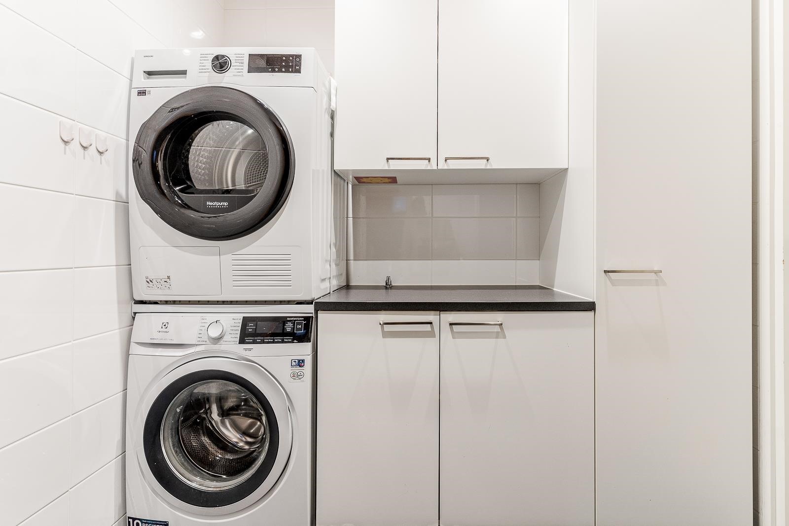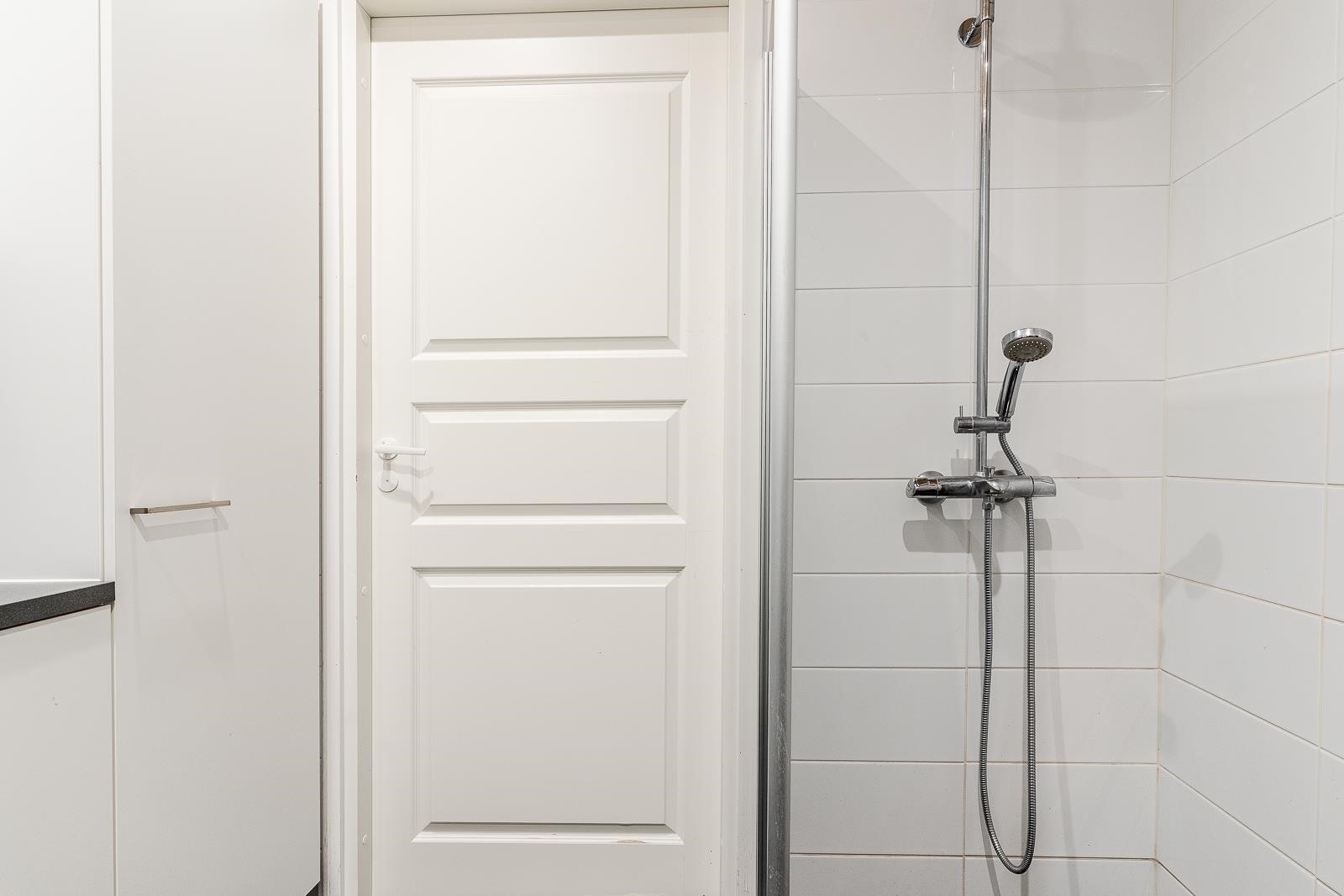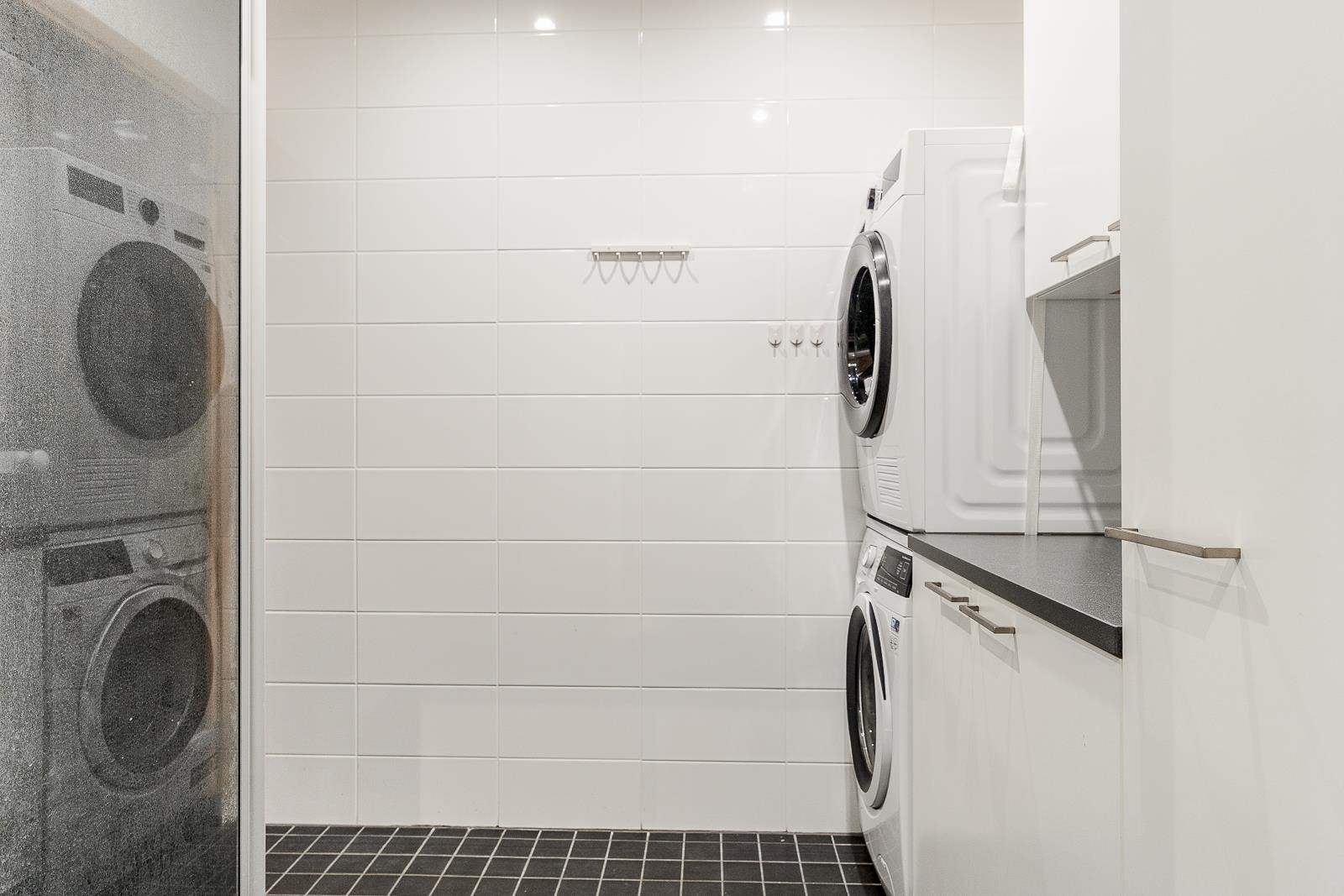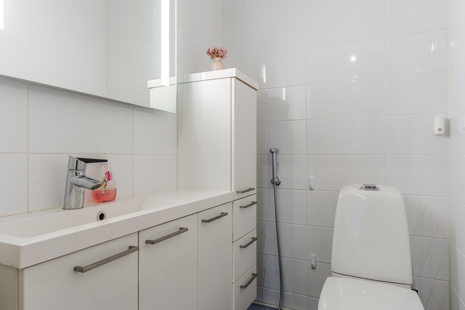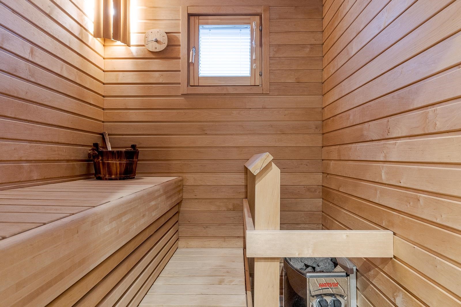 - Sauna: ikkunallinen, sähkökiuas. Pesuhuone: suihku, suihkuseinä, liitännät pesutornille, kiintokalustus, lattialämmitys, kiinteät valaisimet. Erillinen wc: peilikaappi, allaskaappi.