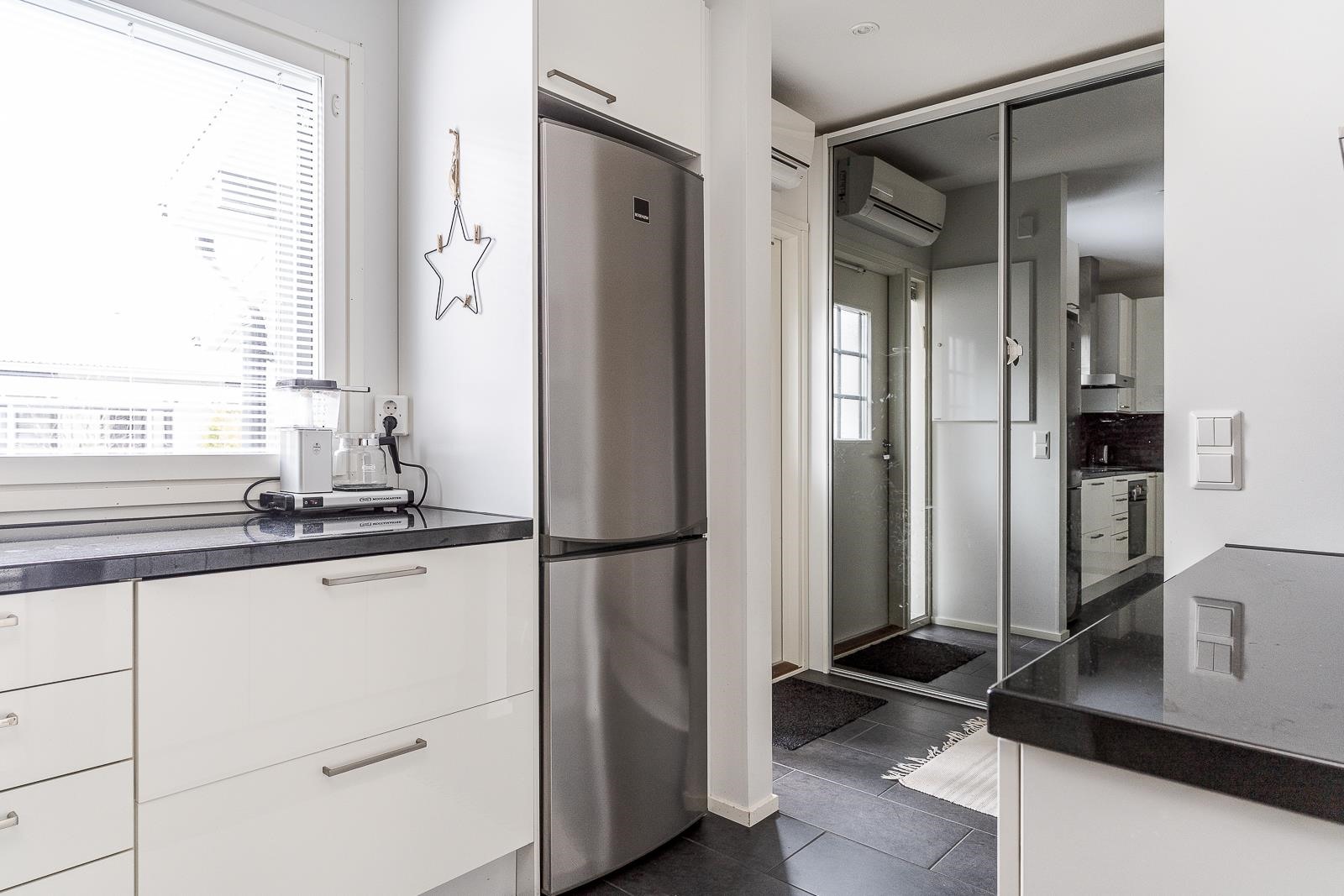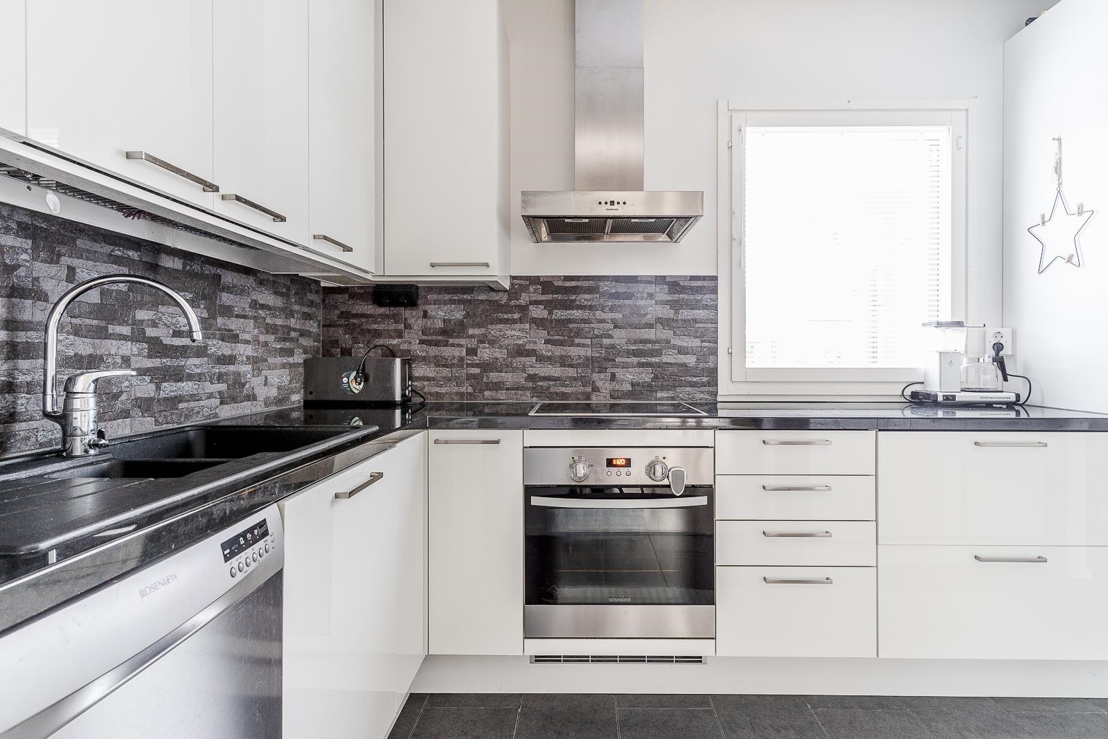 - Jääkaappipakastin, erillisuuni, liesitaso, induktioliesi, liesituuletin, astianpesukone, kaapistot, kiinteät valaisimet, kivitasot.
