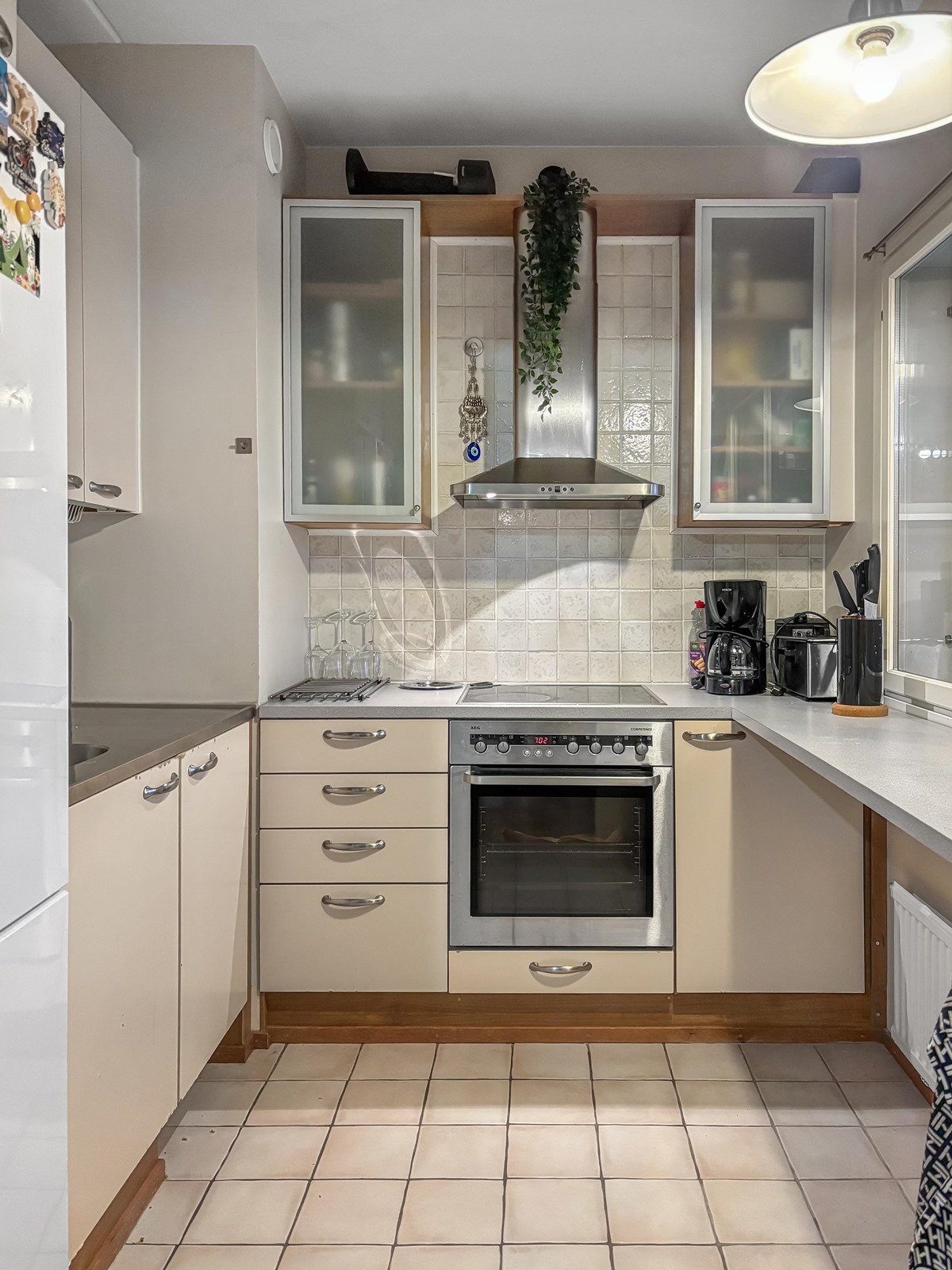 - Jääkaappipakastin, erillisuuni, keraaminen liesi, liesituuletin, astianpesukone, kaapistot, kiinteät valaisimet.