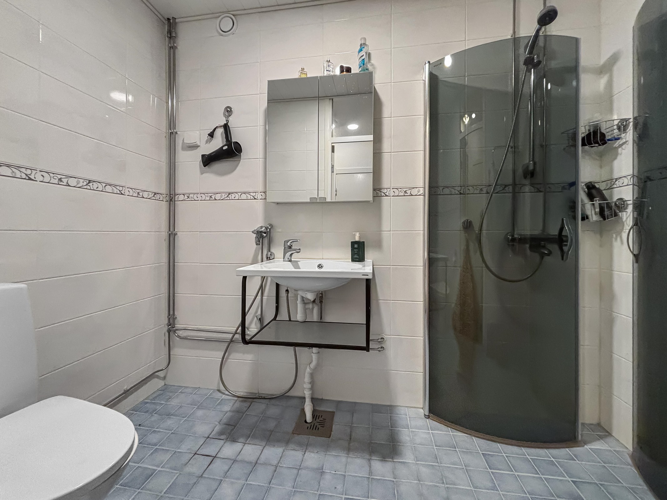- Kylpyhuone, suihku, suihkuseinä, peilikaappi, pesukoneliitäntä, lattialämmitys, kiinteät valaisimet.