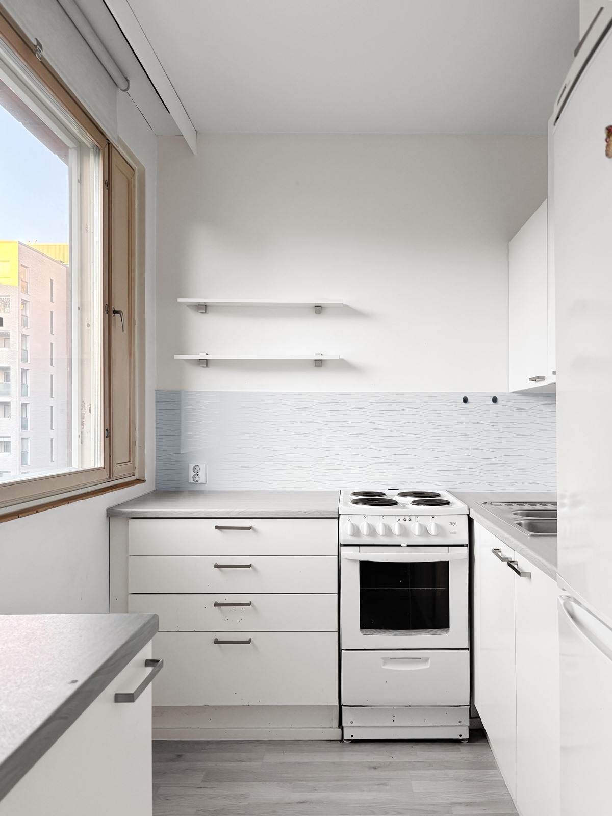 - Jääkaappipakastin, sähköliesi, kaapistot, kiinteät valaisimet.