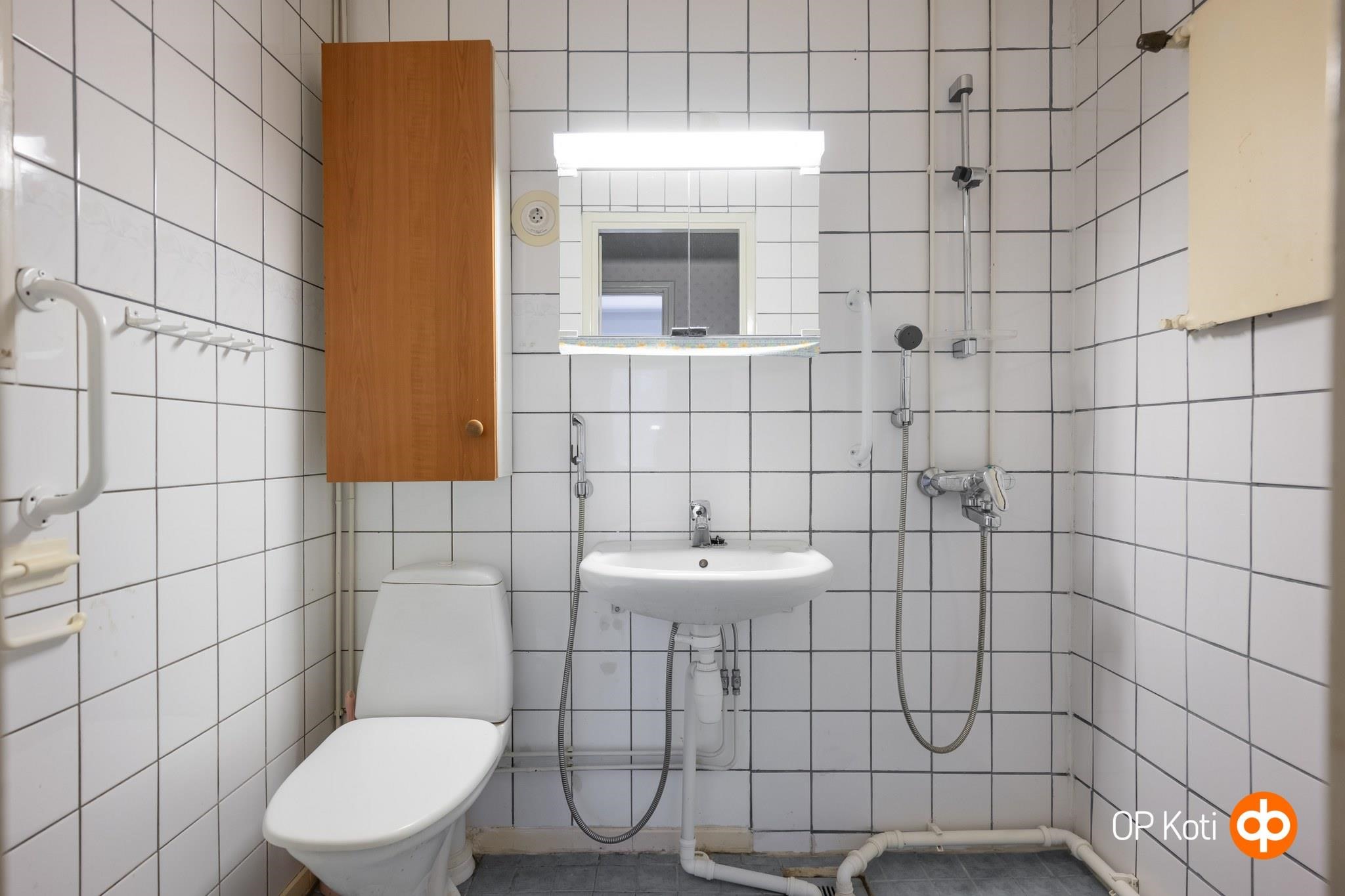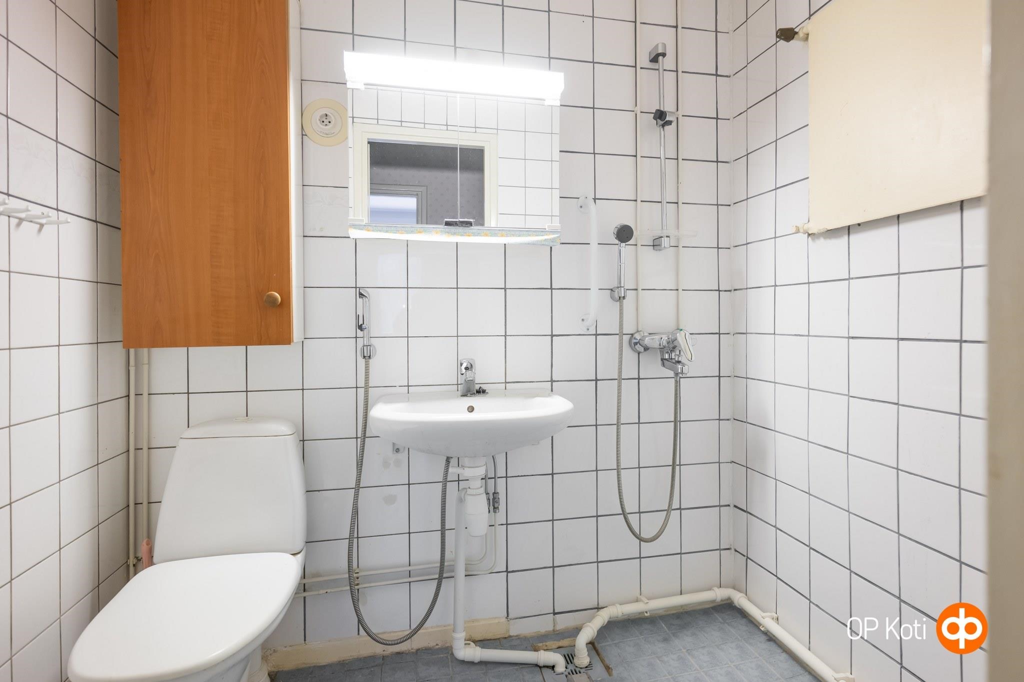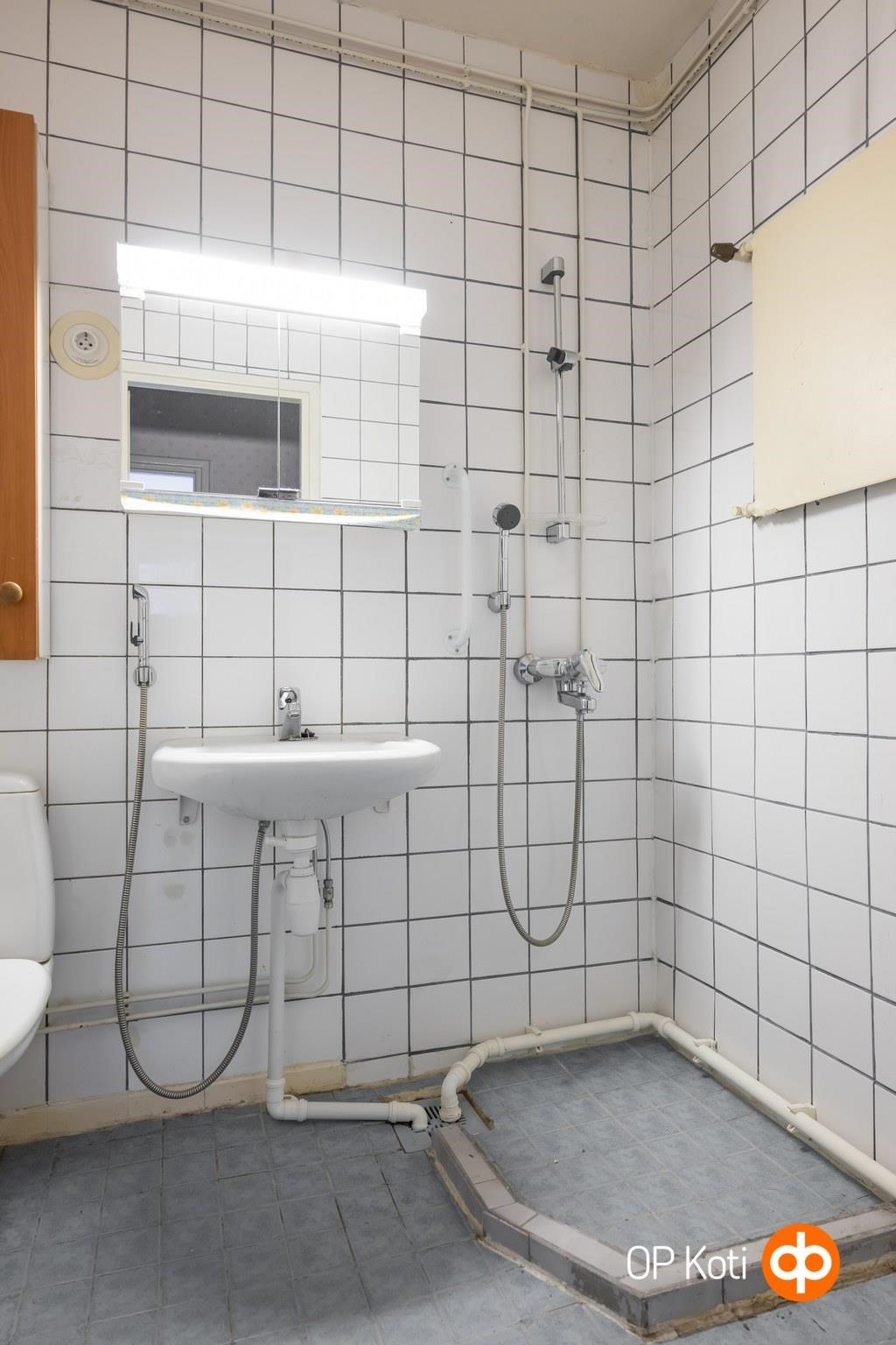 - Kylpyhuone, suihku, peilikaappi, kaapit, pesukoneliitäntä, kiinteät valaisimet. Amme poistettu arviolta 90-luvulla, tilalle lattialle asennettu jonkinlainen vesieriste, jonka päälle laatta. Suihkutilassa laatan päällä laatta.