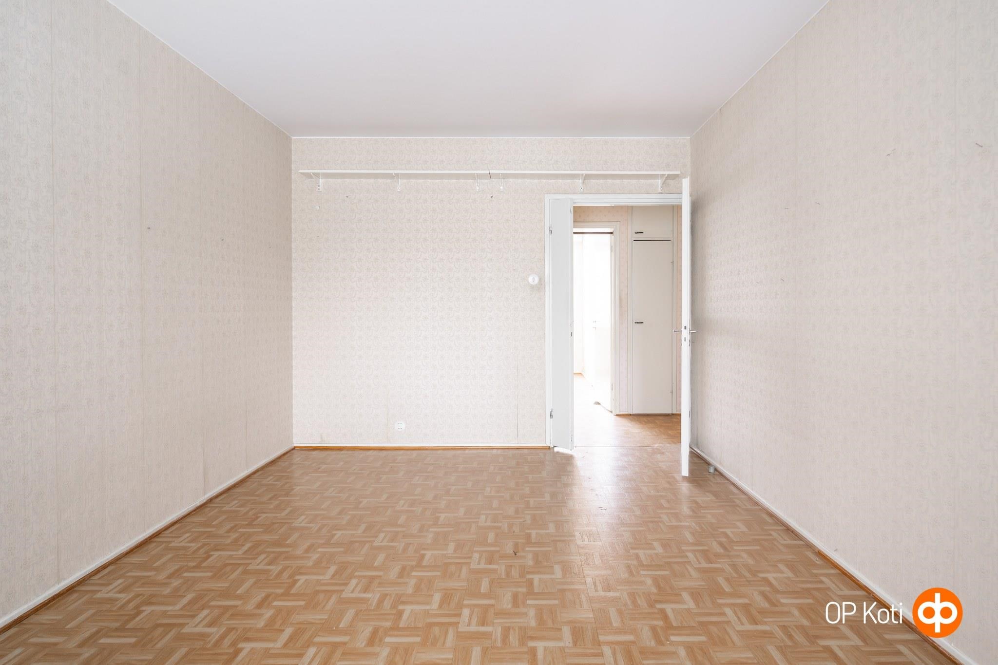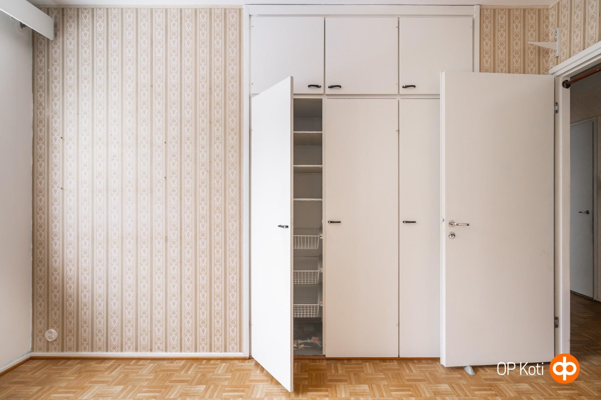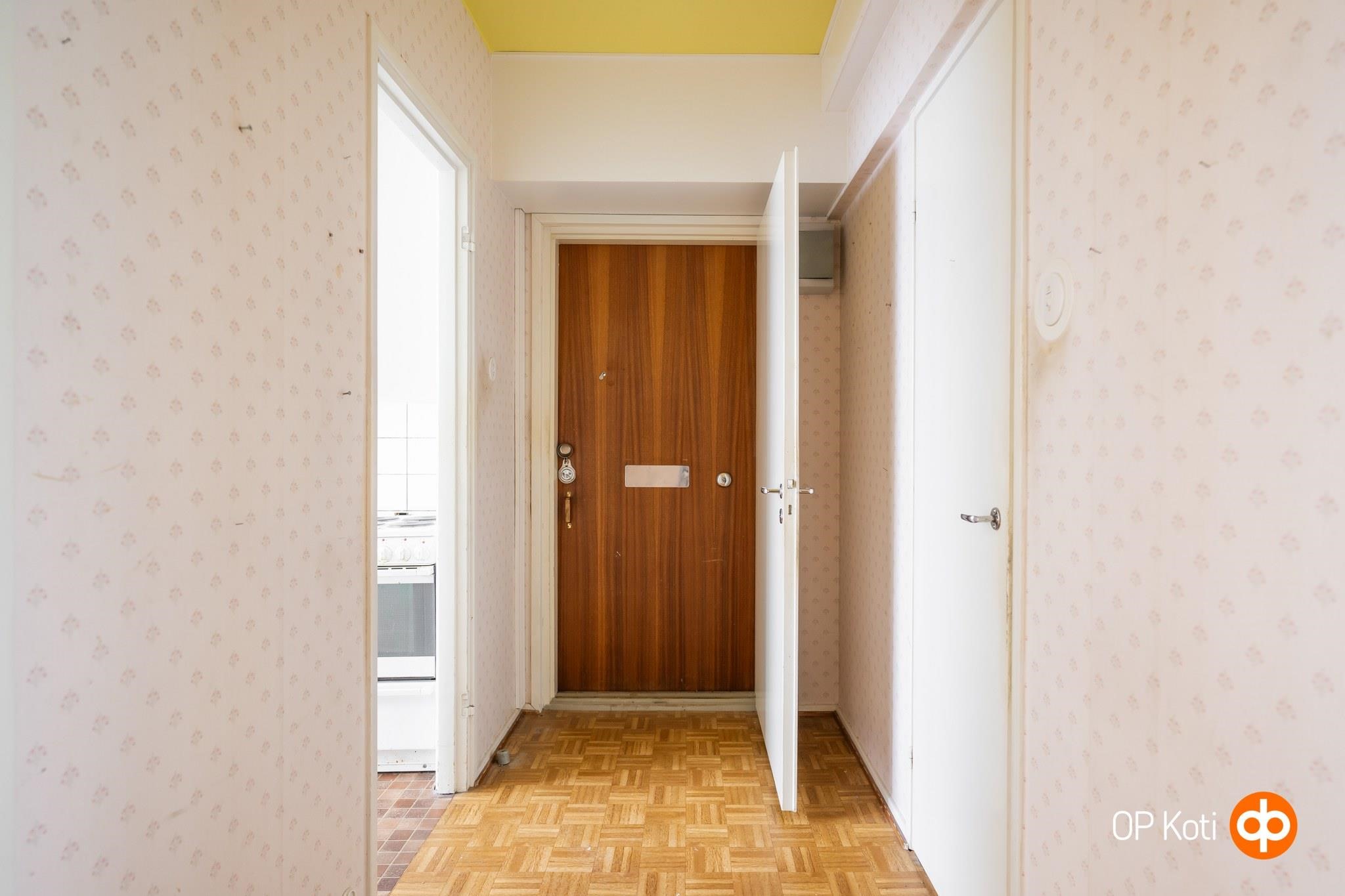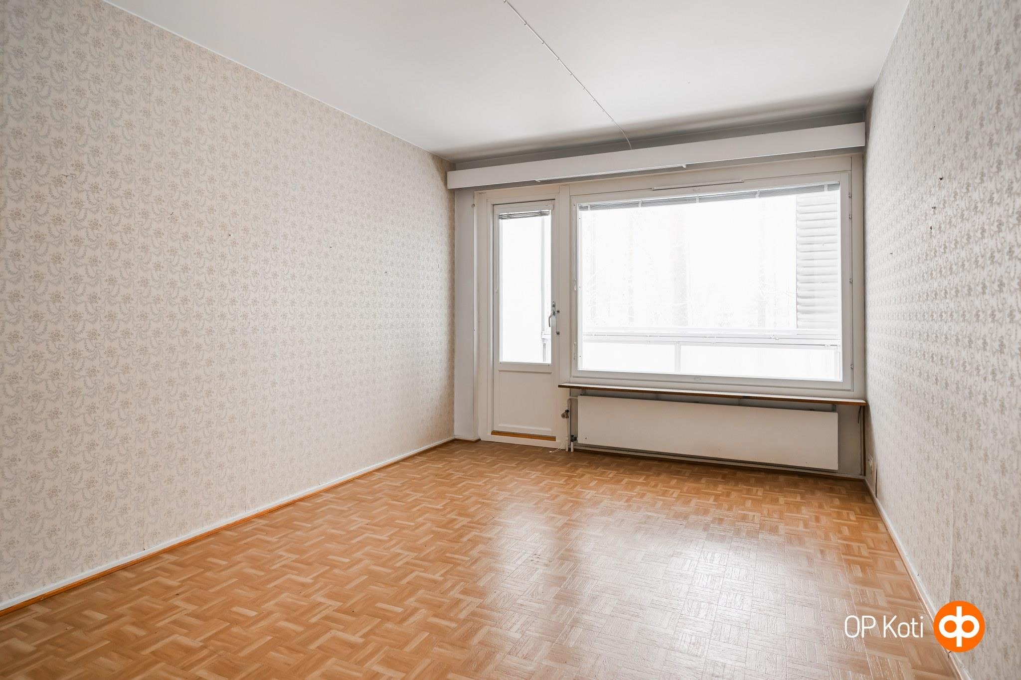 Makuuhuone on tilava ja siellä on kolme kaappia, sekä pieni vaatehuone. Keittiö on saanut uudet kaapinovet arviolta 1980-luvulla. Kylpyhuoneen amme poistettiin 1990-luvulla ja korvattiin suihkulla. Asunto on kauttaaltaan muovimatolla. Valoisa olohuone kätkeytyy kauniiden, alkuperäisten pariovien taakse ja sieltä on kulku tilavalle, lasitetulle parvekkeelle.