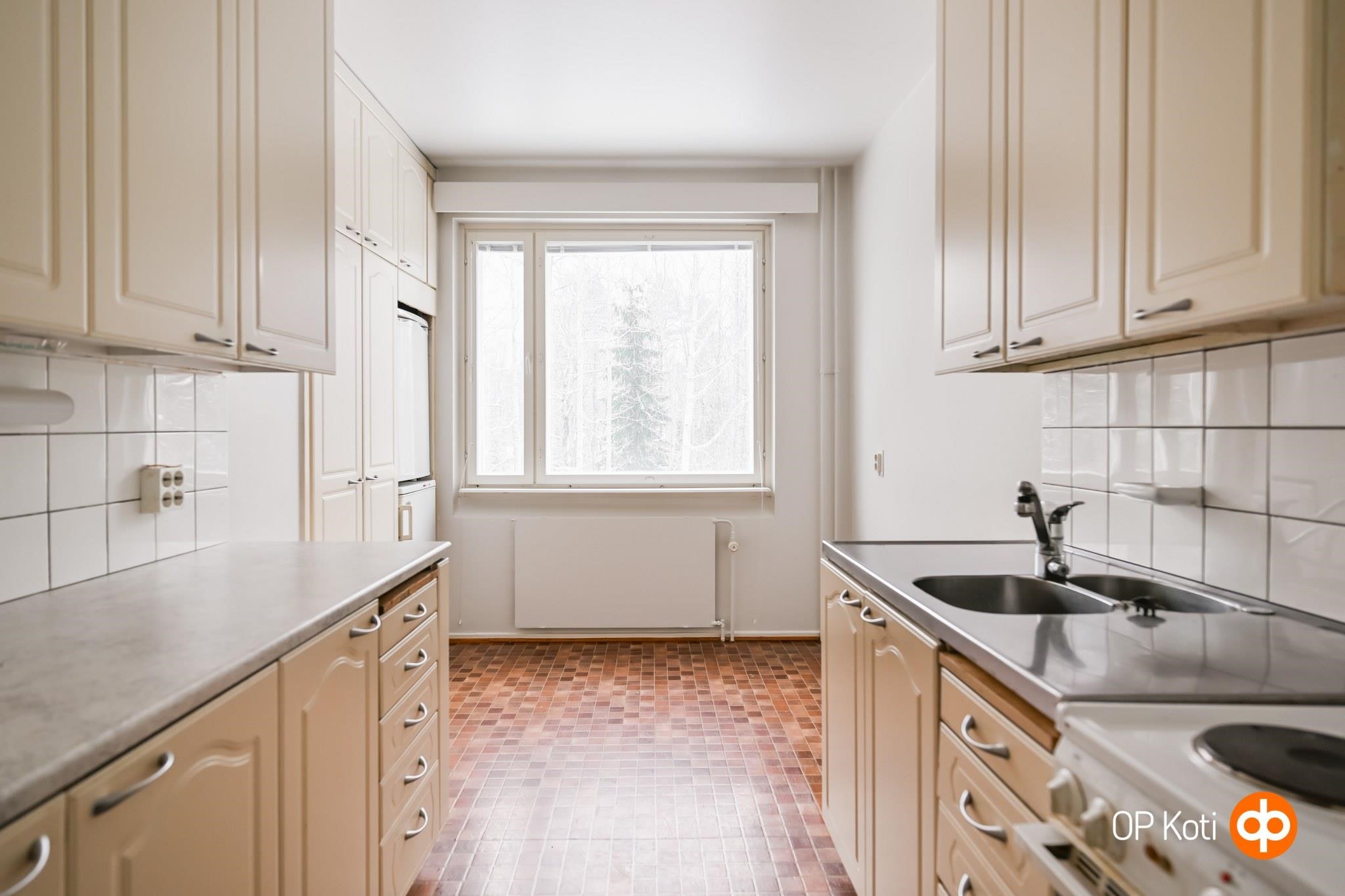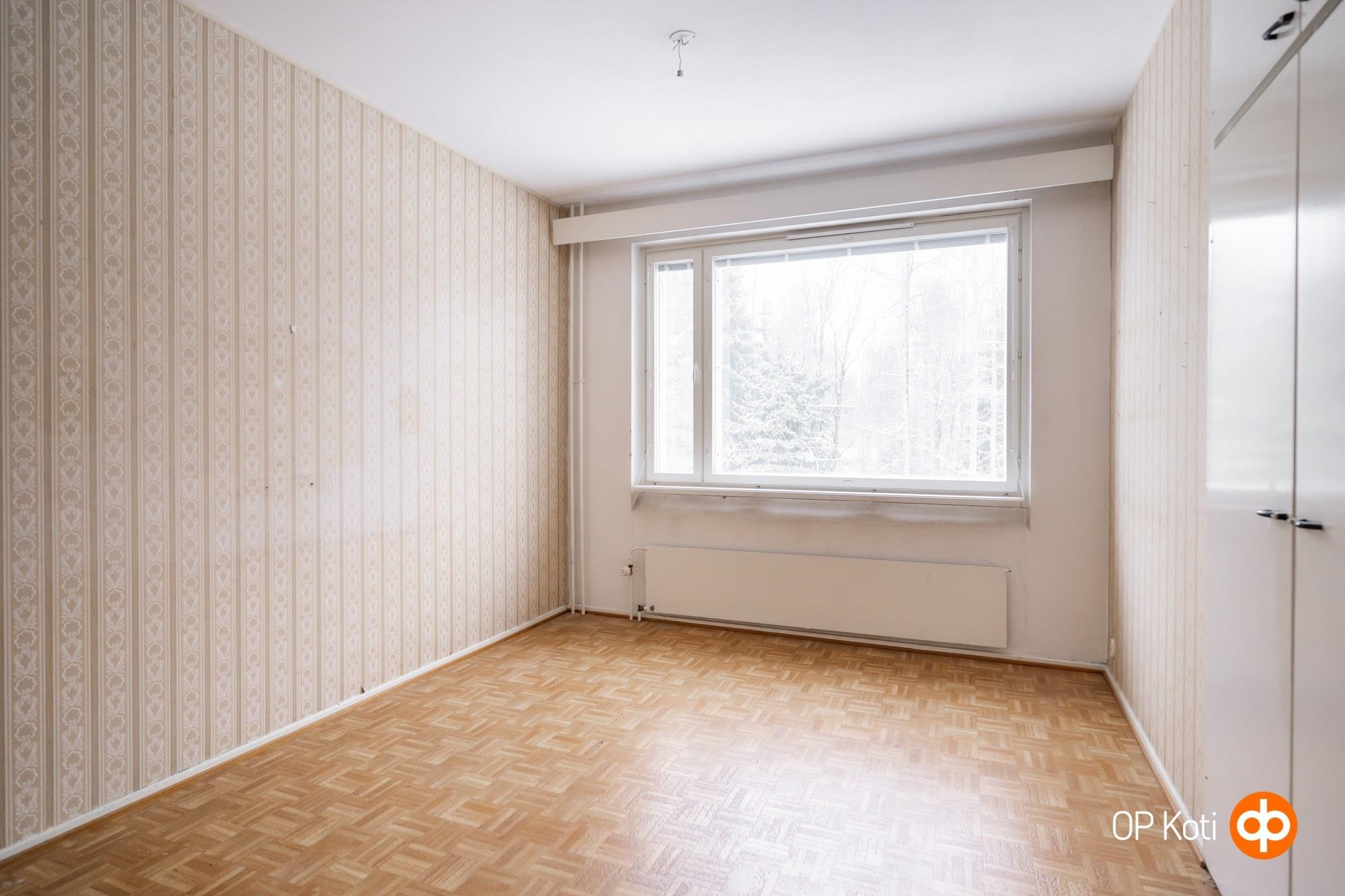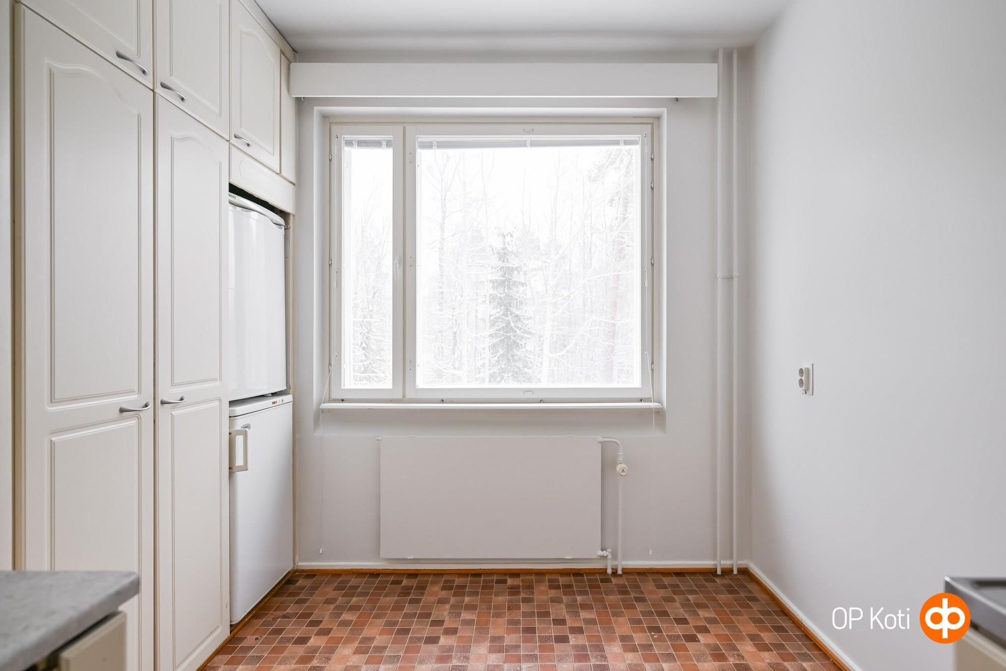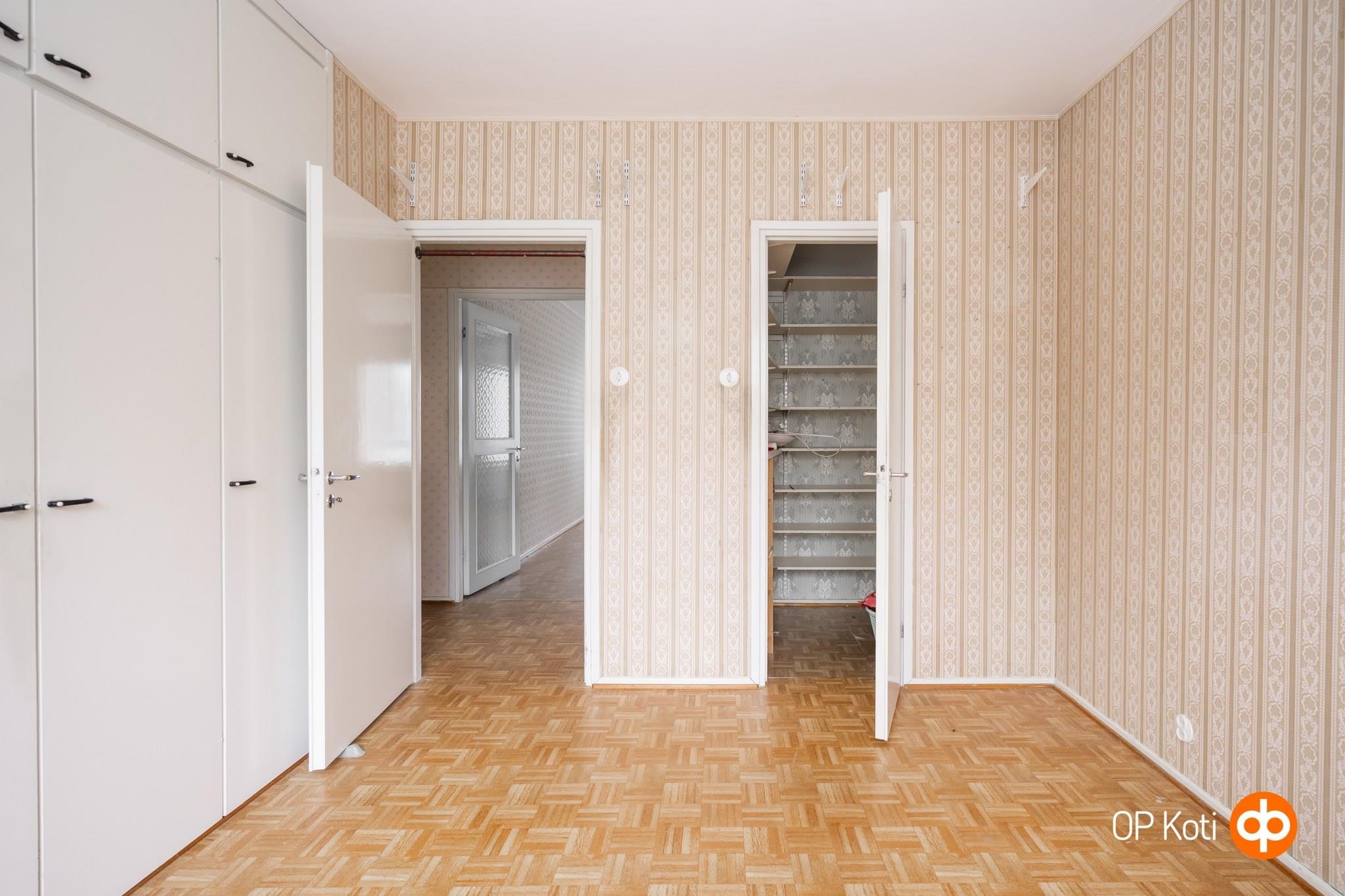 Makuuhuone on tilava ja siellä on kolme kaappia, sekä pieni vaatehuone. Keittiö on saanut uudet kaapinovet arviolta 1980-luvulla. Kylpyhuoneen amme poistettiin 1990-luvulla ja korvattiin suihkulla. Asunto on kauttaaltaan muovimatolla. Valoisa olohuone kätkeytyy kauniiden, alkuperäisten pariovien taakse ja sieltä on kulku tilavalle, lasitetulle parvekkeelle.