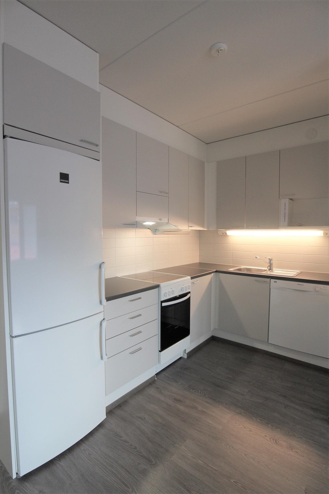 - Jääkaappipakastin, keraaminen liesi, liesikupu, astianpesukone, kaapistot.