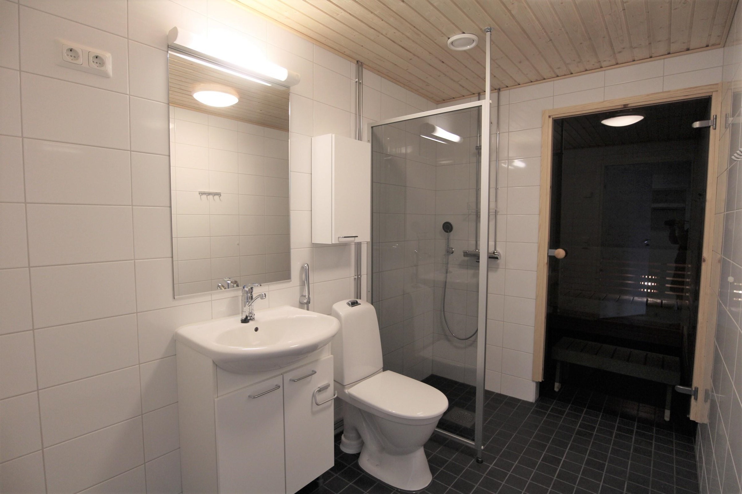 - Sauna, kylpyhuone, suihku, peilit, pesukoneliitäntä, lattialämmitys. Seinät laatoitettu, lattiat keraamista laattaa.