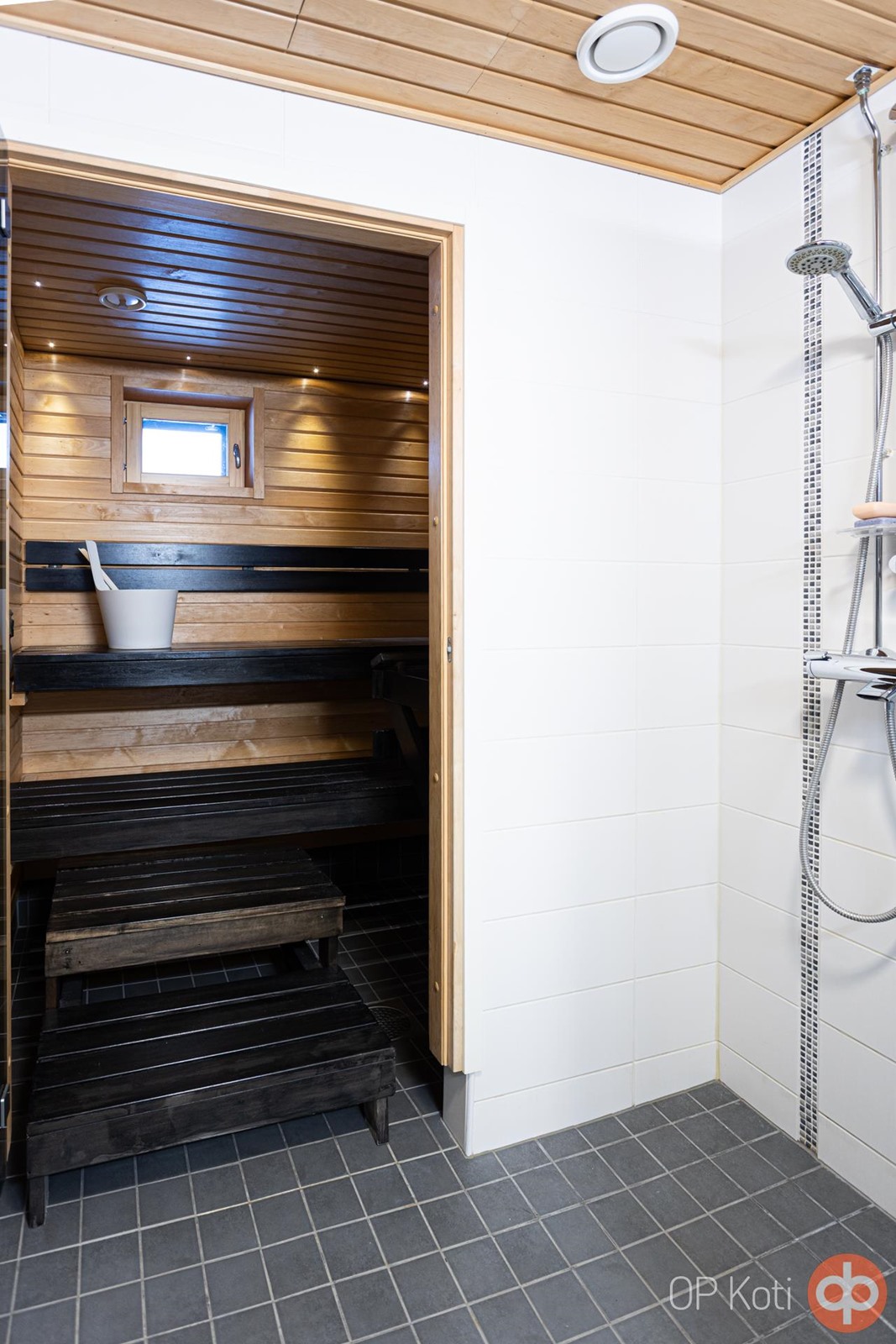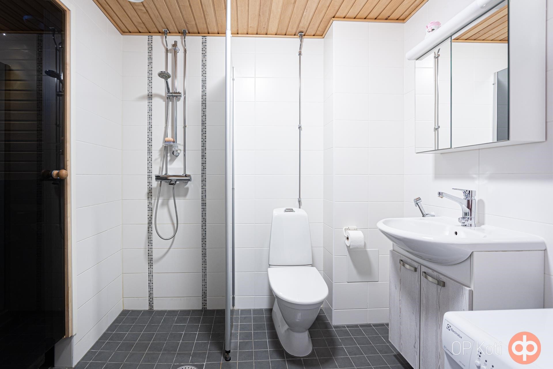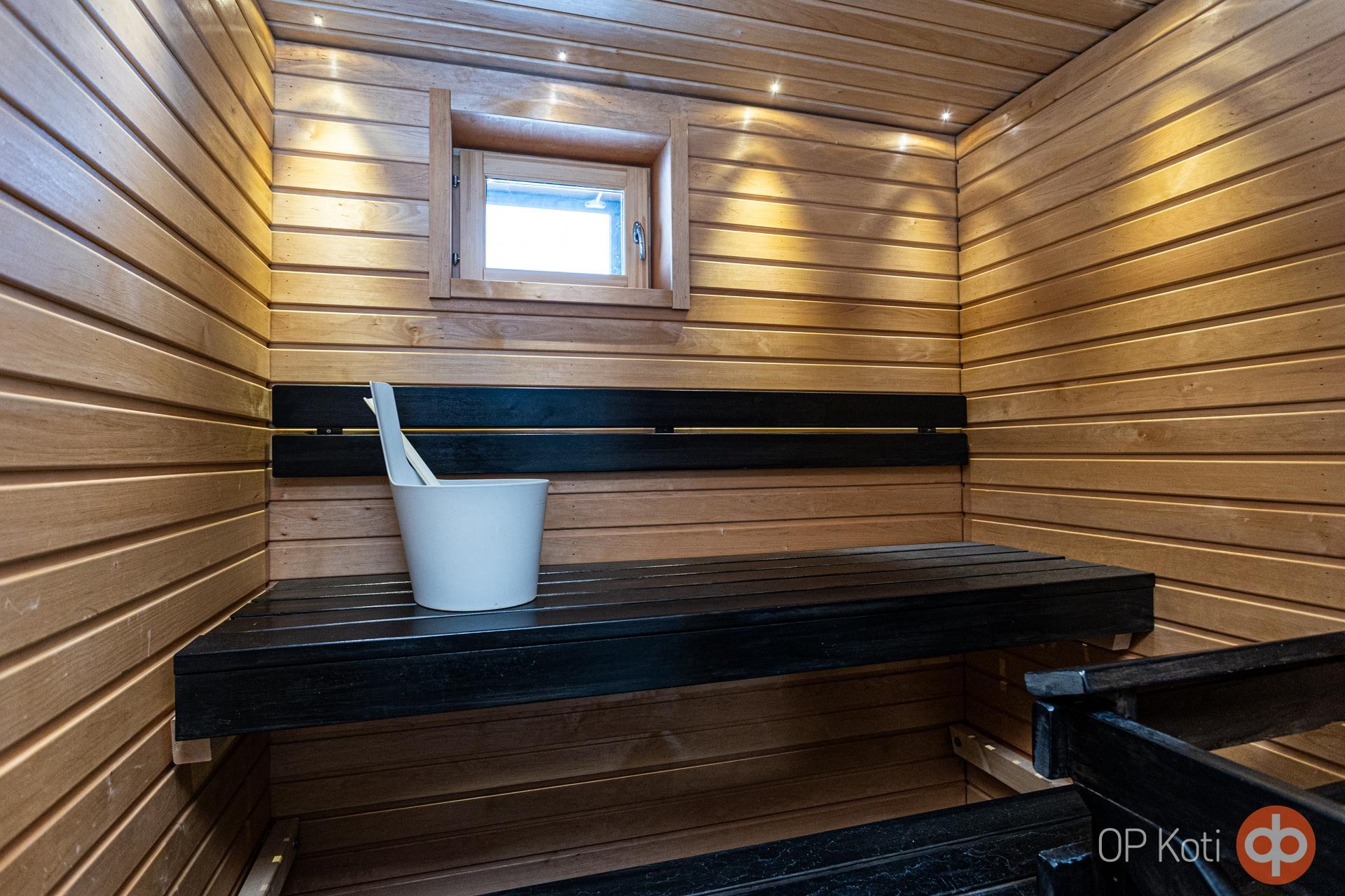 - Sauna, sähkökiuas, kylpyhuone, suihku, suihkuseinä, peilikaappi, allaskaappi, pesukoneliitäntä, lattialämmitys, kiinteät valaisimet.
