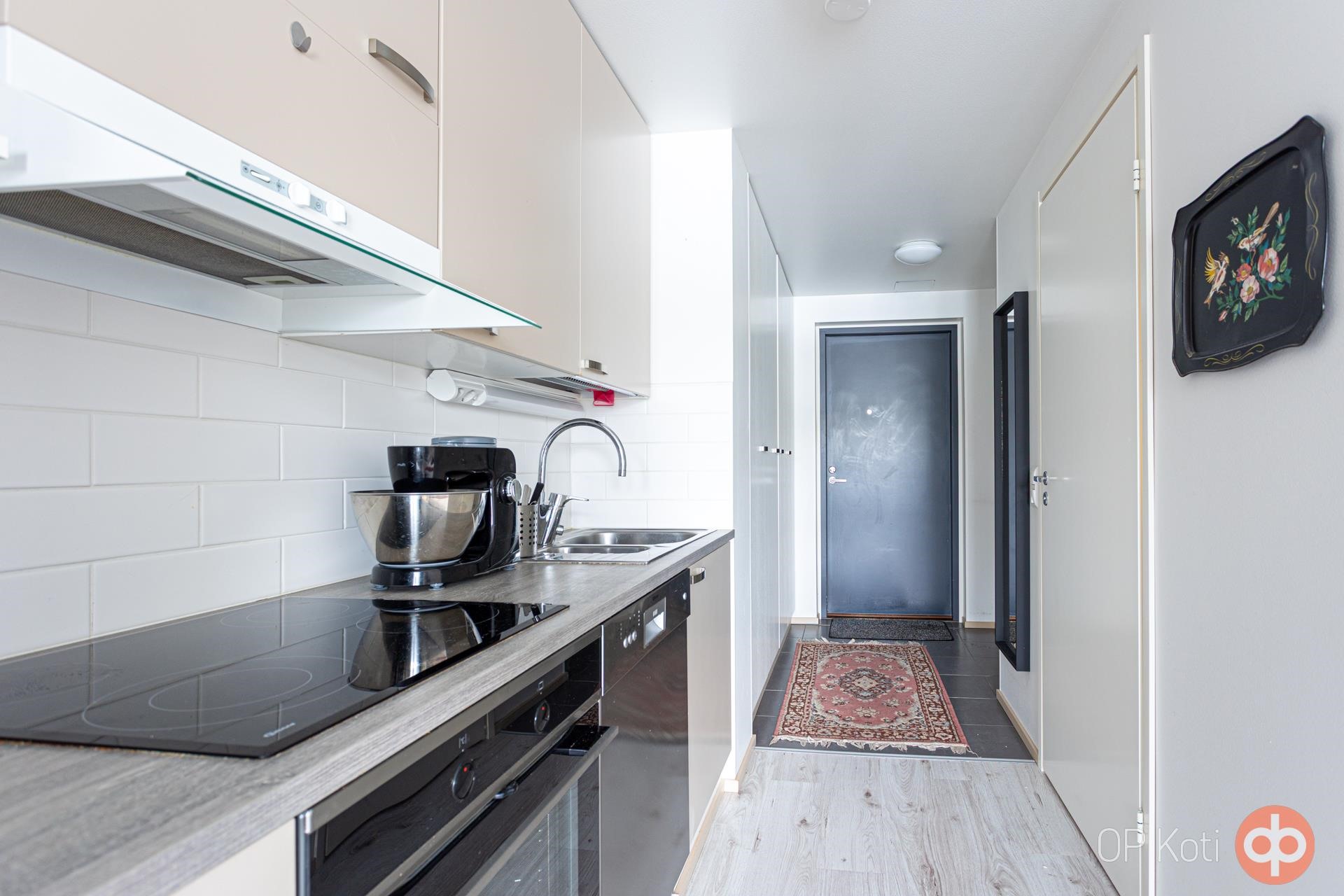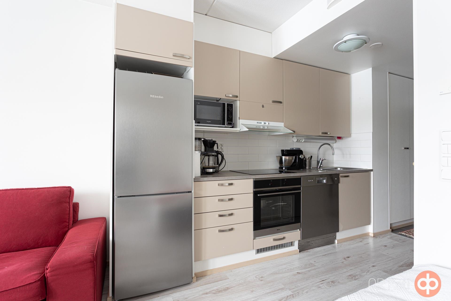 Yksiön pohjaratkaisu on suunniteltu tehokkaasti, keittiö on kompakti mutta hyvin varusteltu, ja se tarjoaa kaikki tarvittavat mukavuudet ruoanlaittoon.