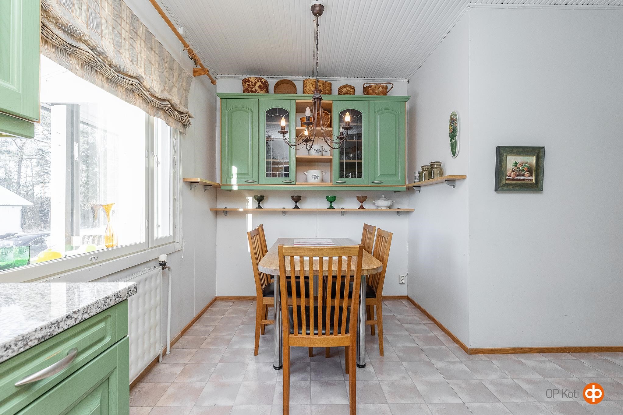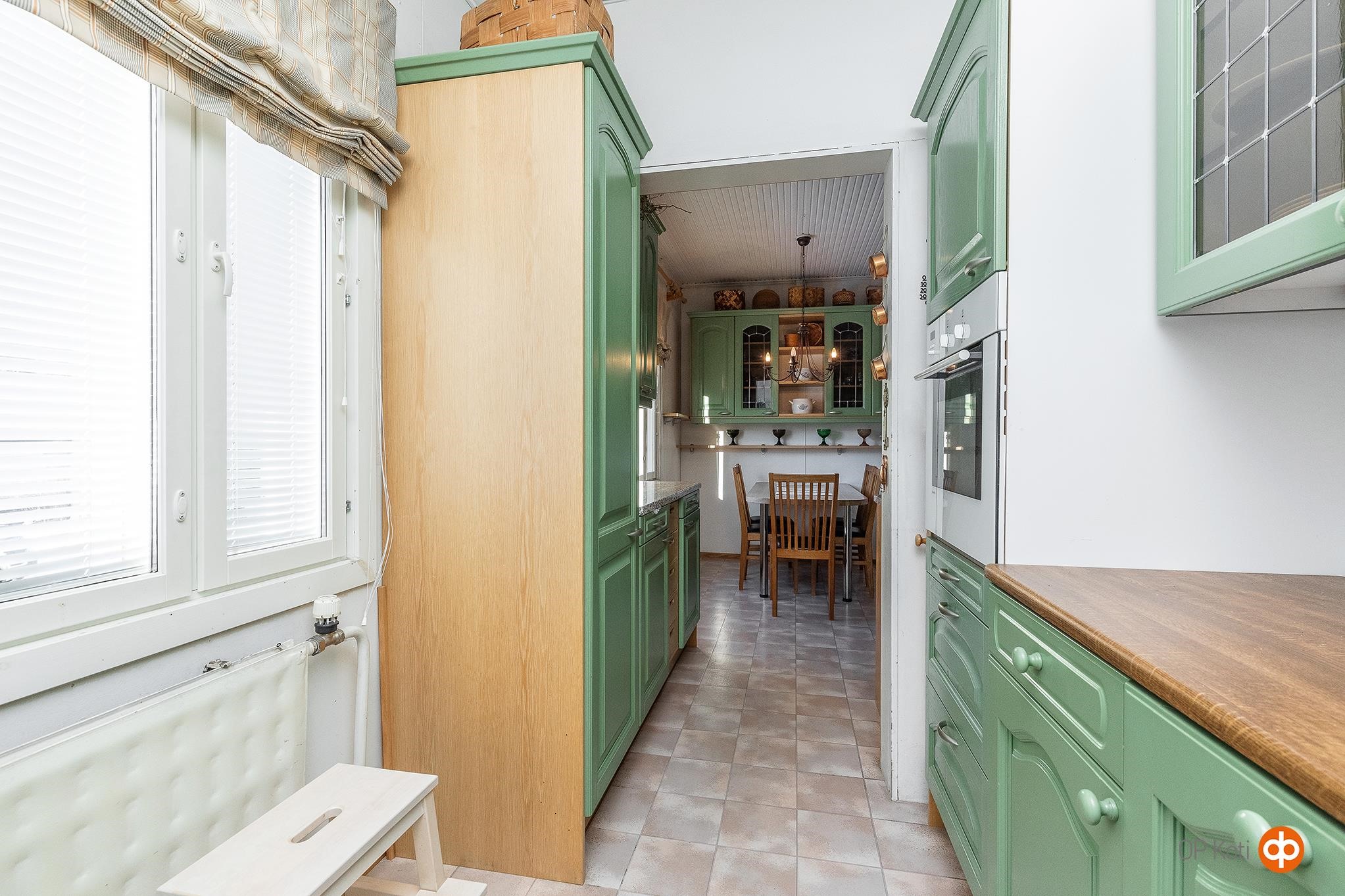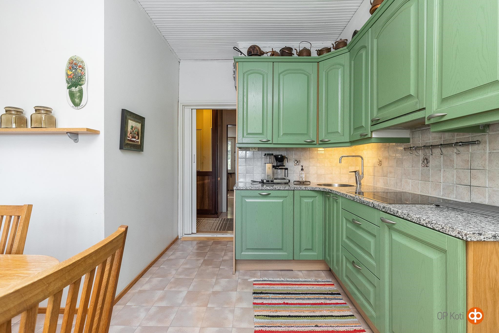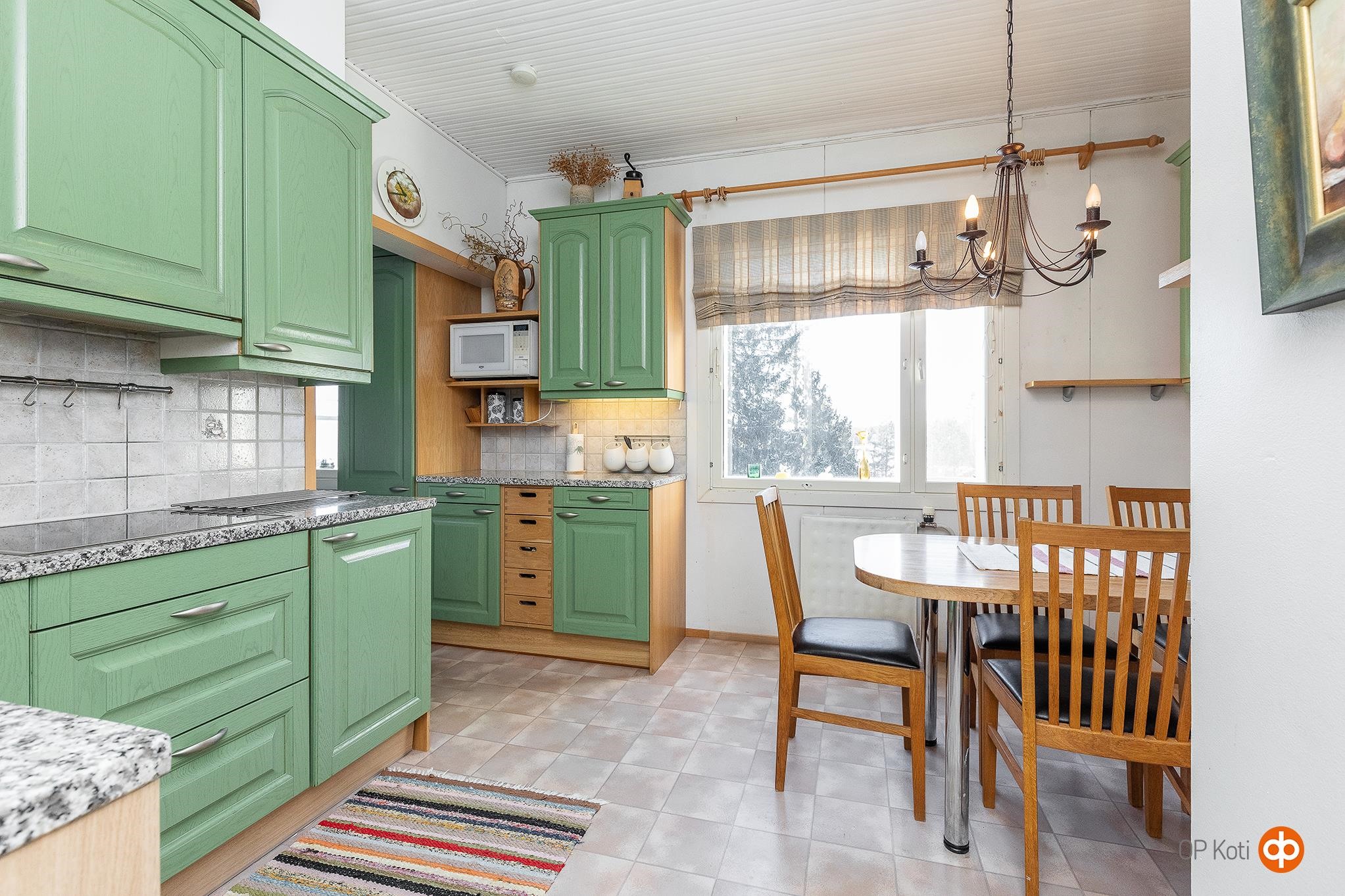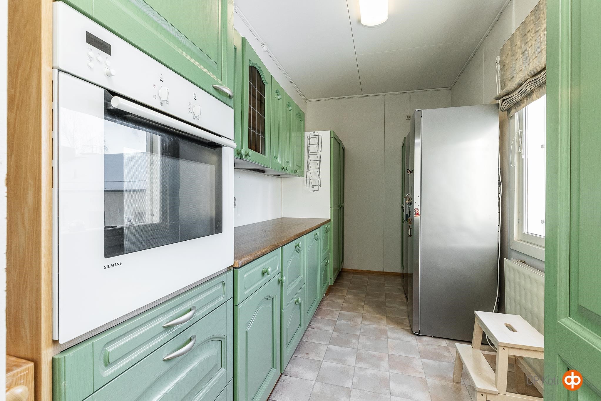 - Varusteina: Jääkaappipakastin, erillisuuni, keraaminen liesitaso ja astianpesukone.