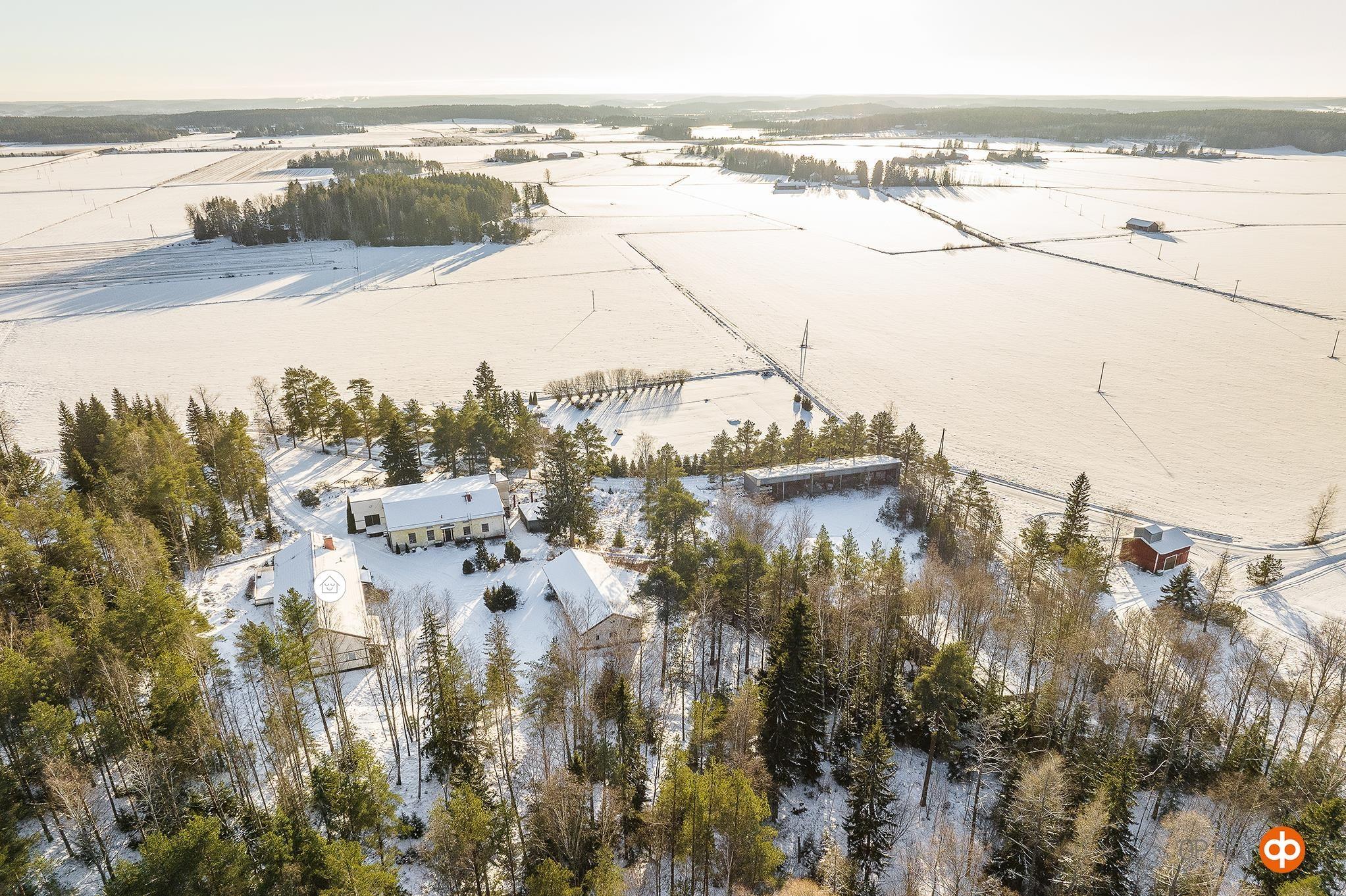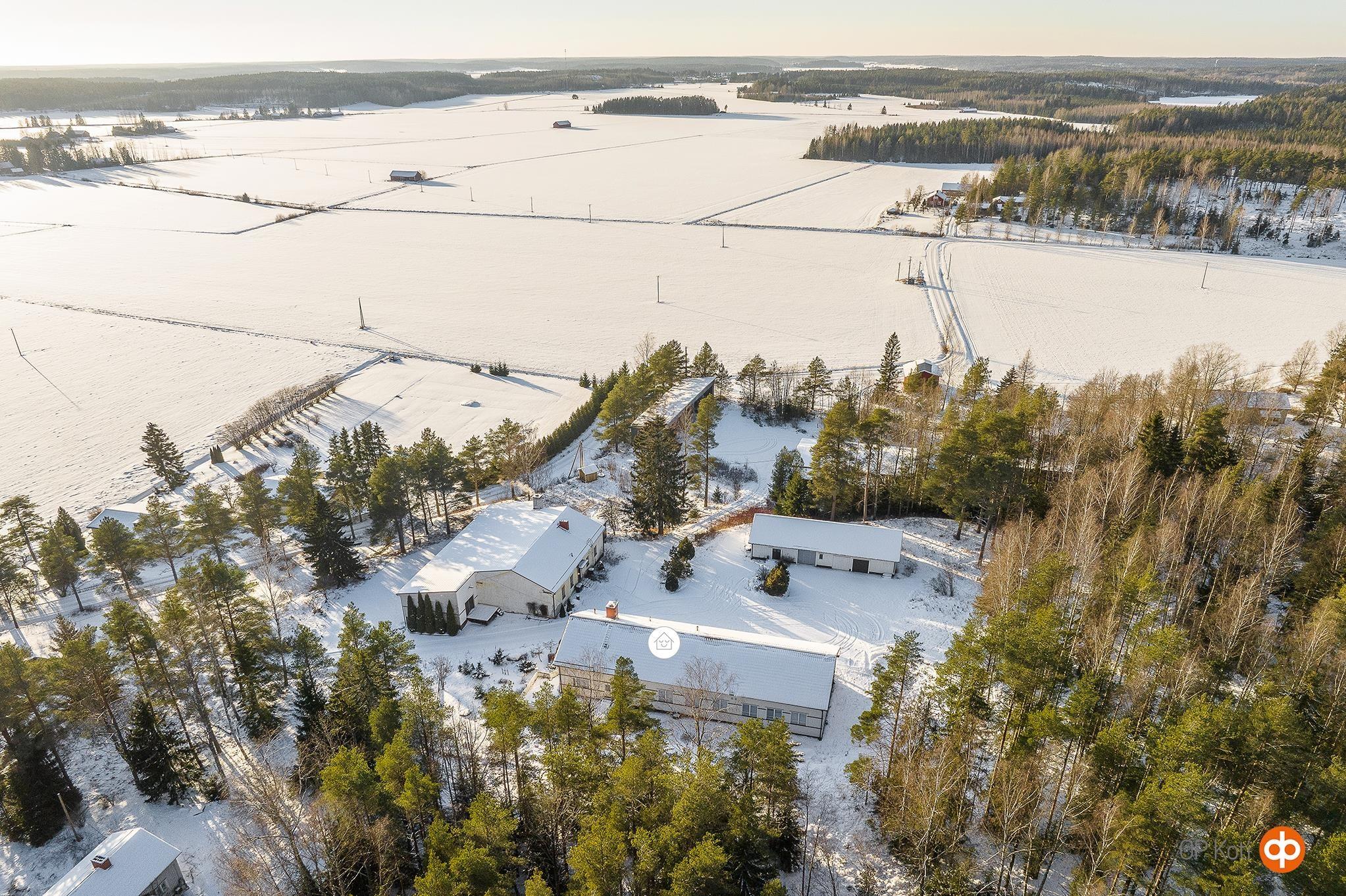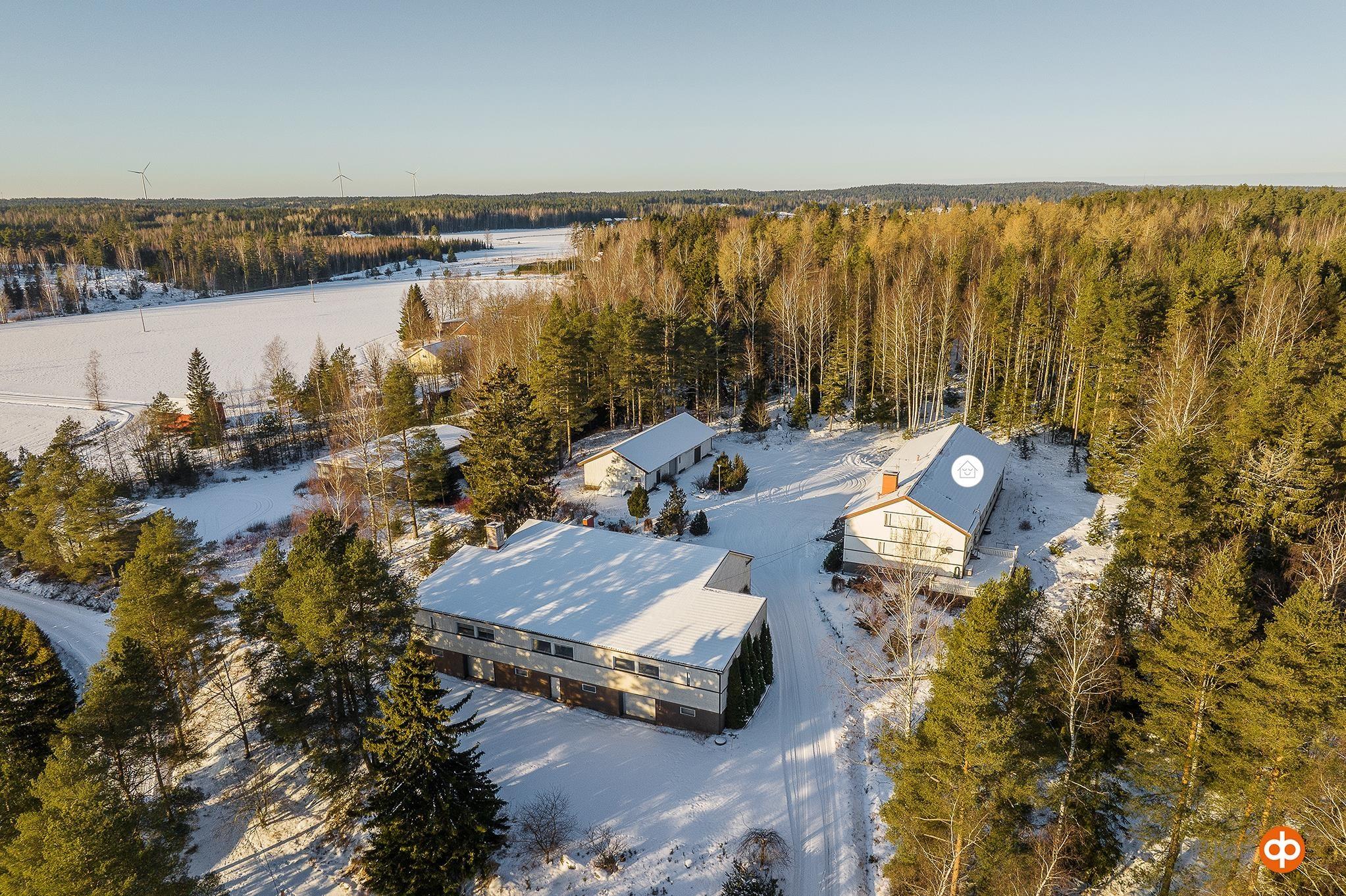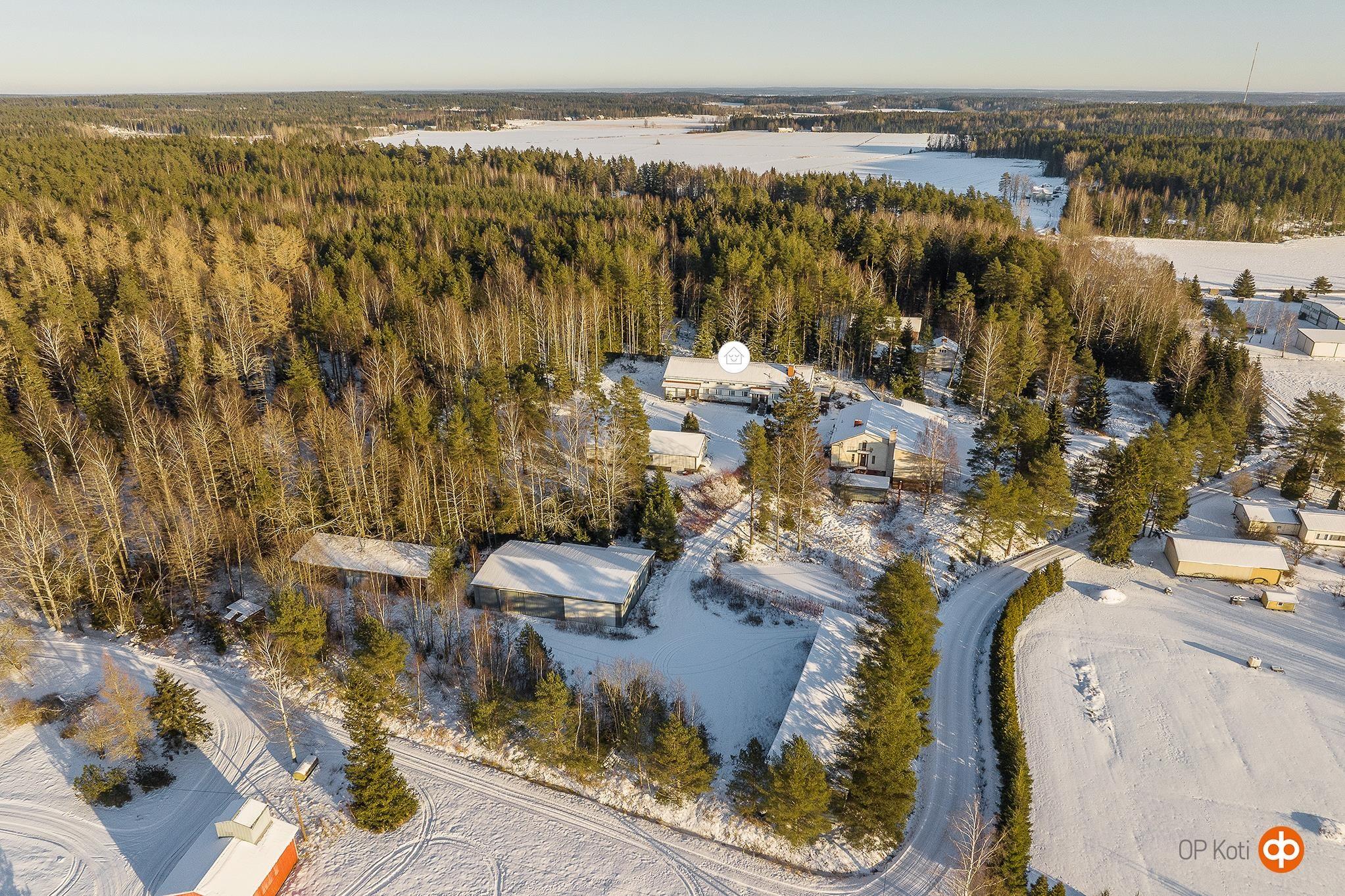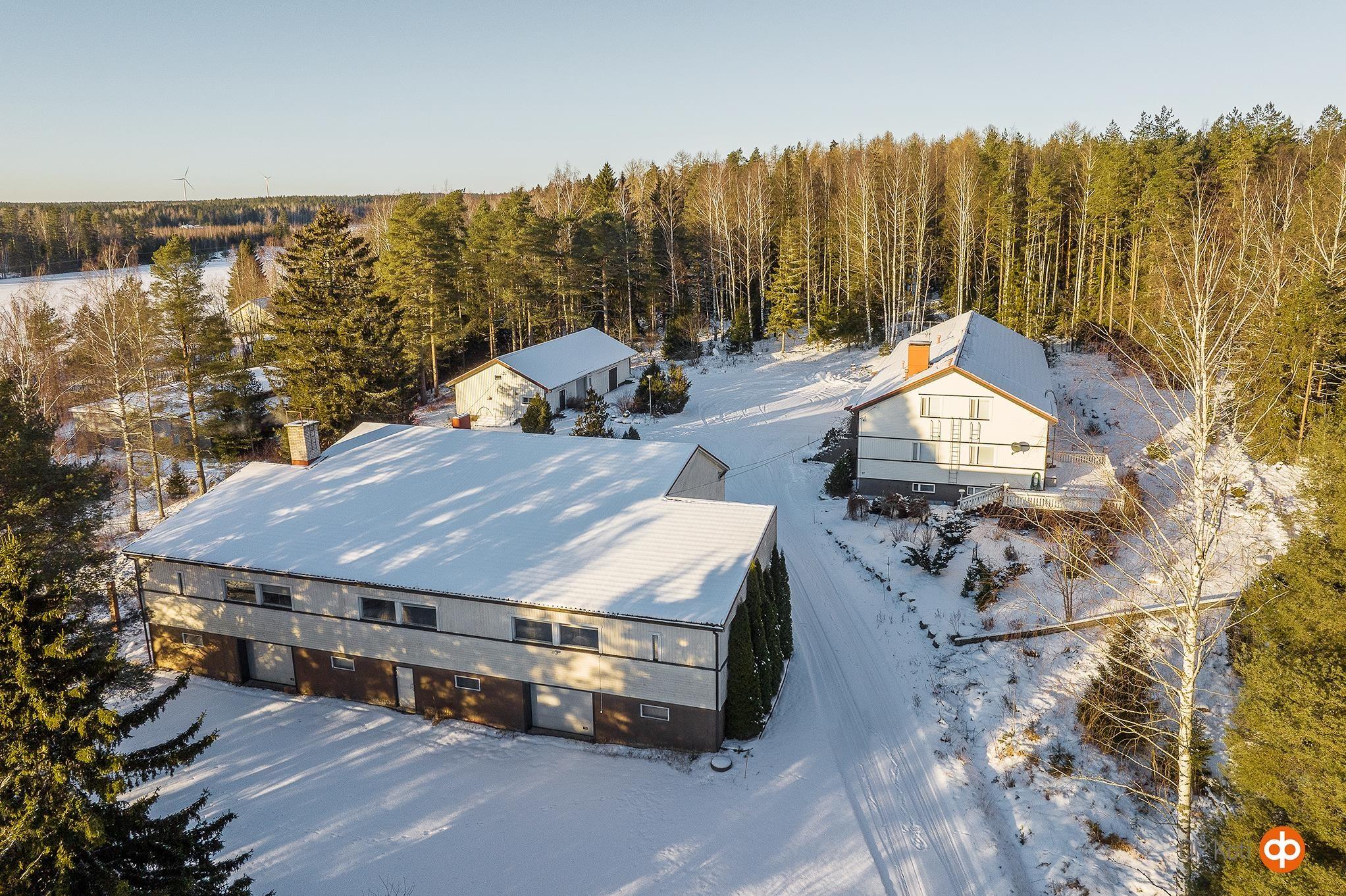 Asuinrakennus, autotalli ja tuotantorakennus muodostavat viihtyisän suojaisan piha-alueen, johon aurinko pääsee myös mukavasti paistamaan pitkin päivää. Kylmän varastohallin ja katoksen ympärillä on isompi tasainen piha-alue.