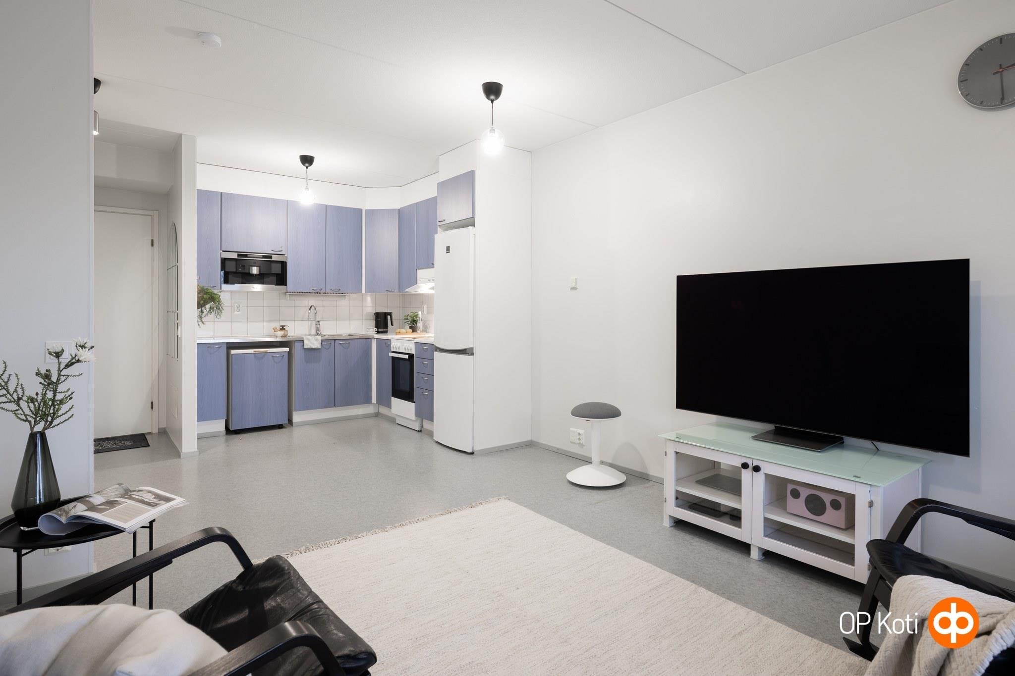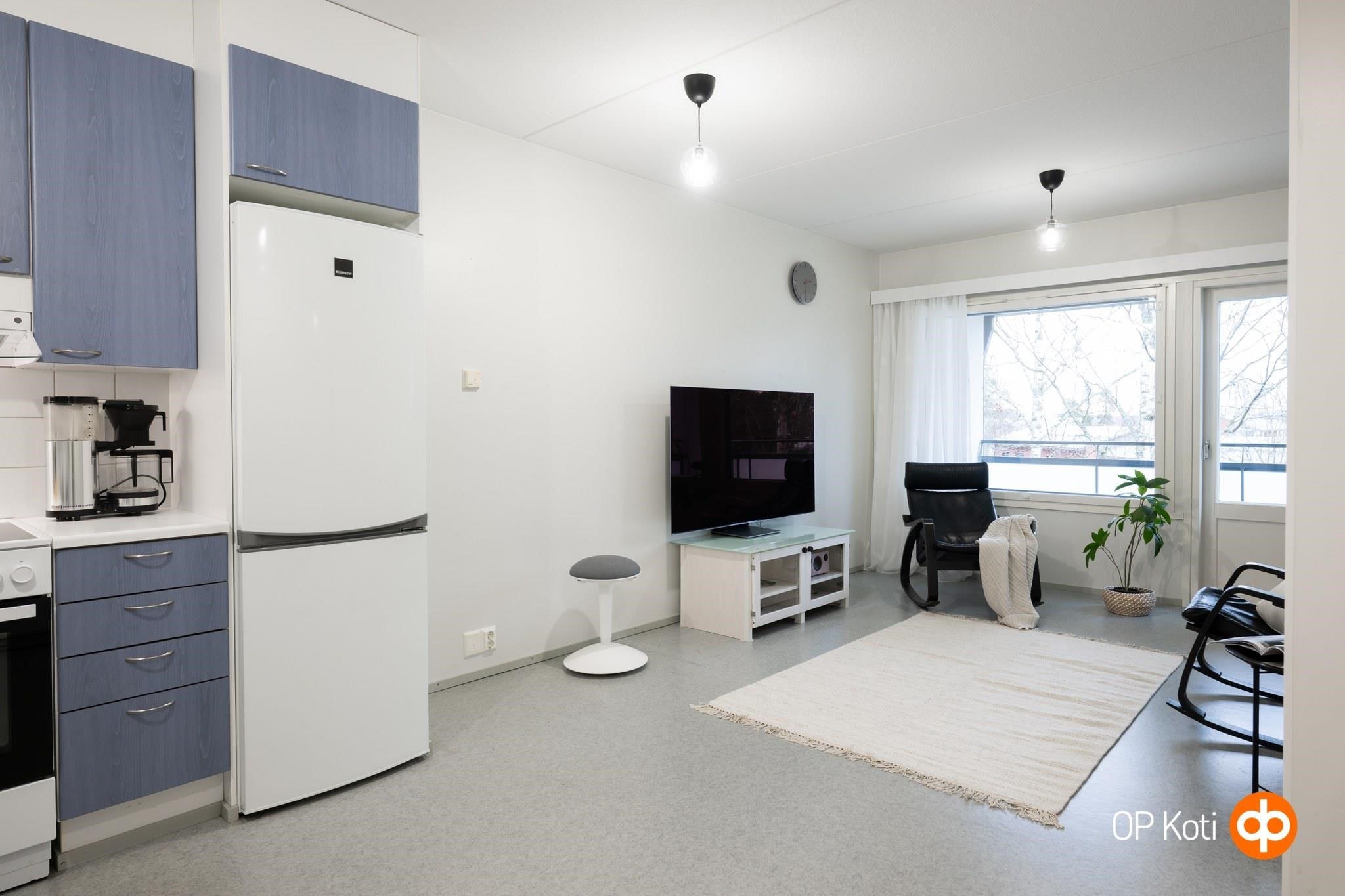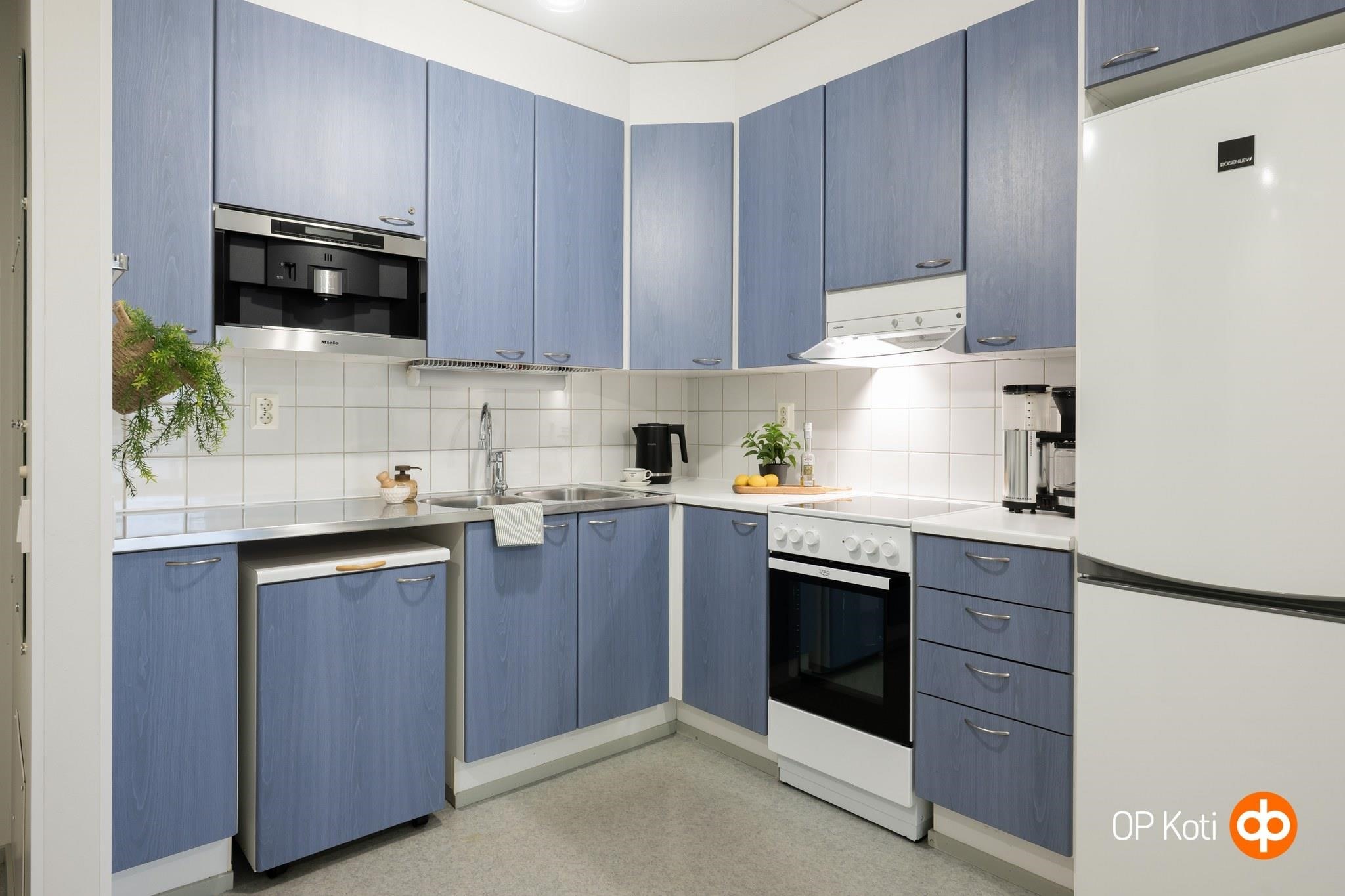 - Jääkaappipakastin, keraaminen liesi, liesituuletin, kaapistot, kiinteät valaisimet.