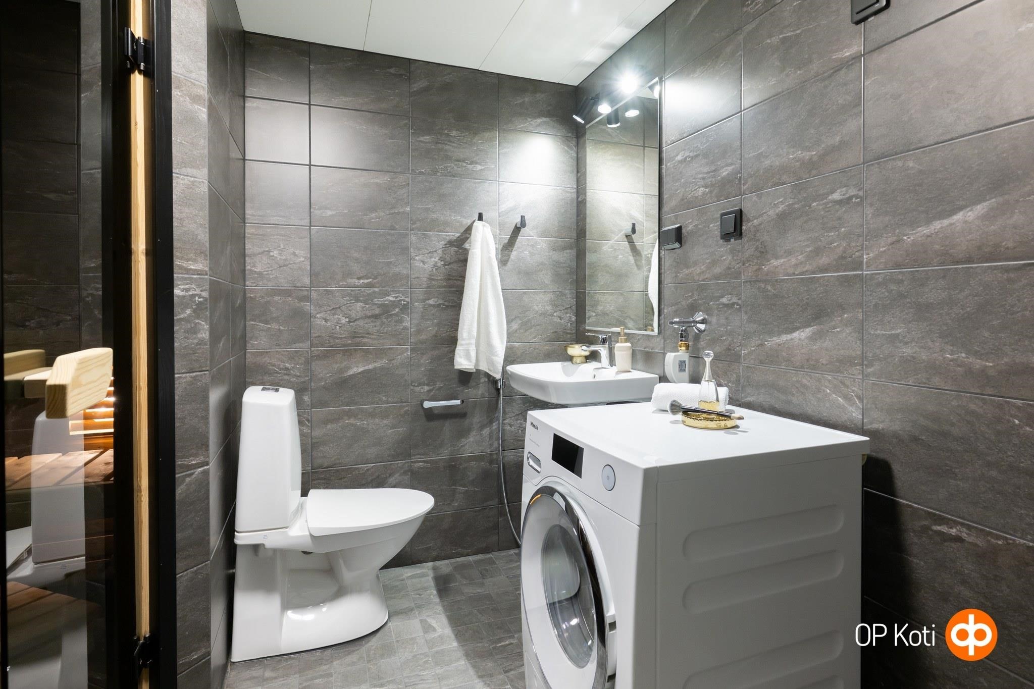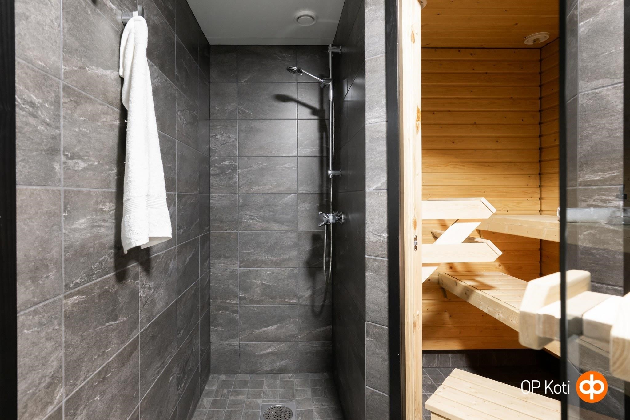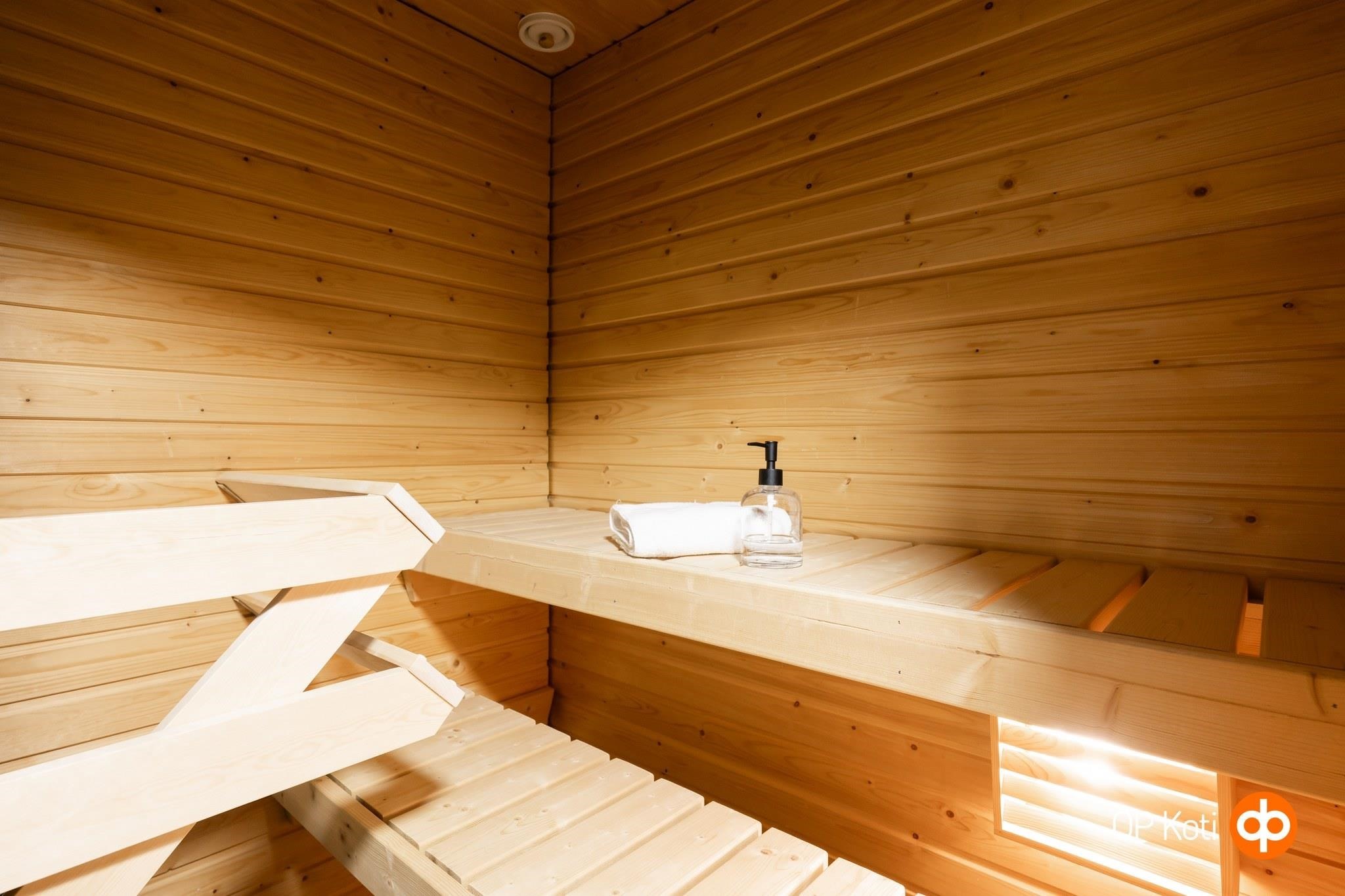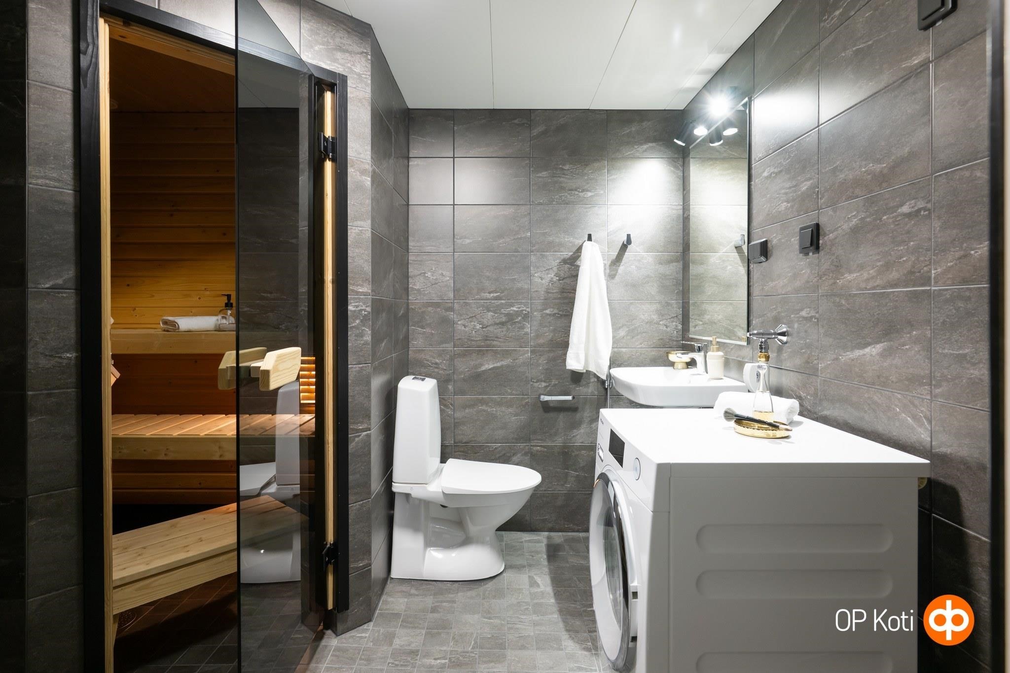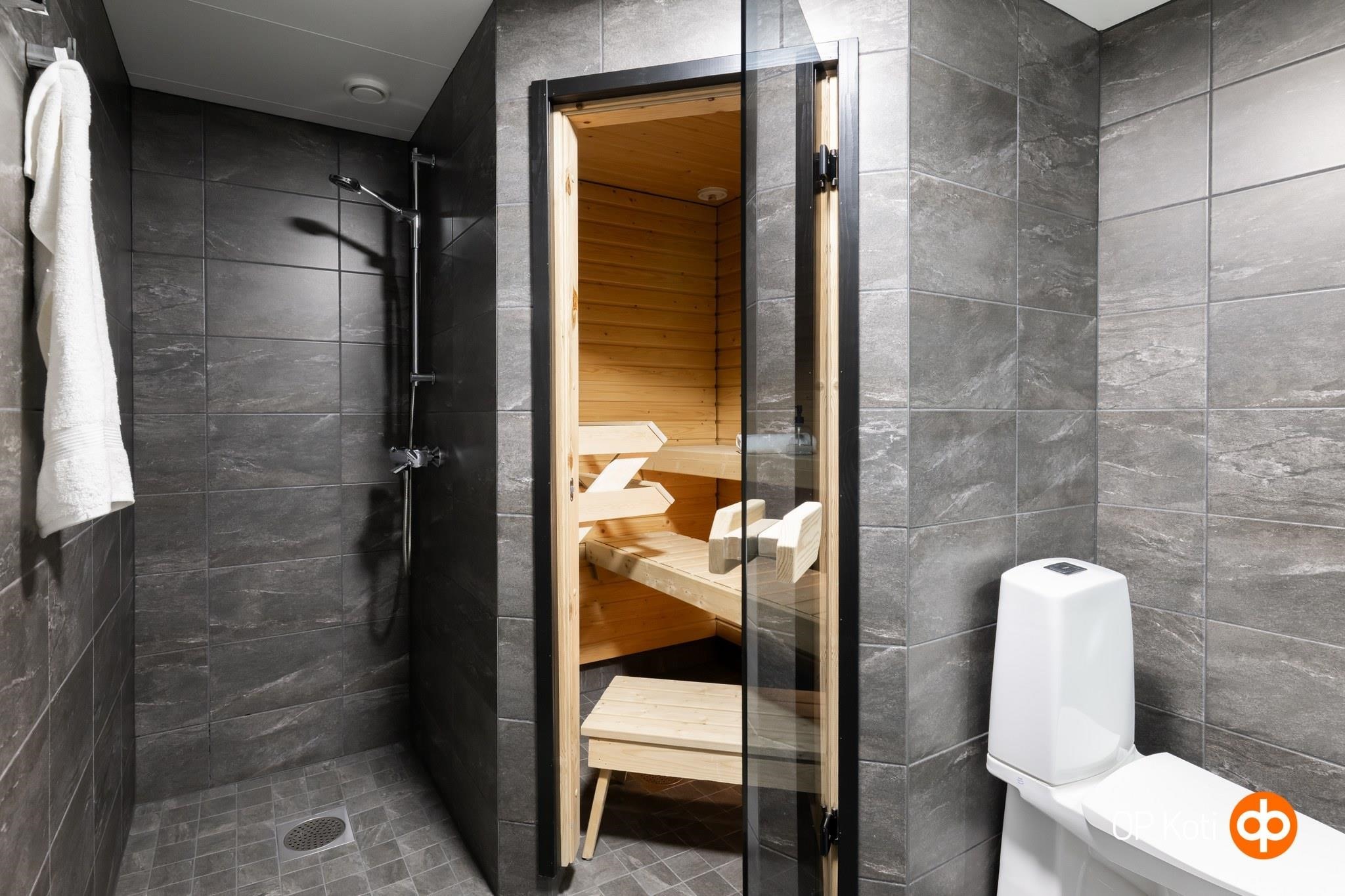 - Sauna, sähkökiuas, kylpyhuone, suihku, peilit, pesukoneliitäntä, lattialämmitys, kiinteät valaisimet.