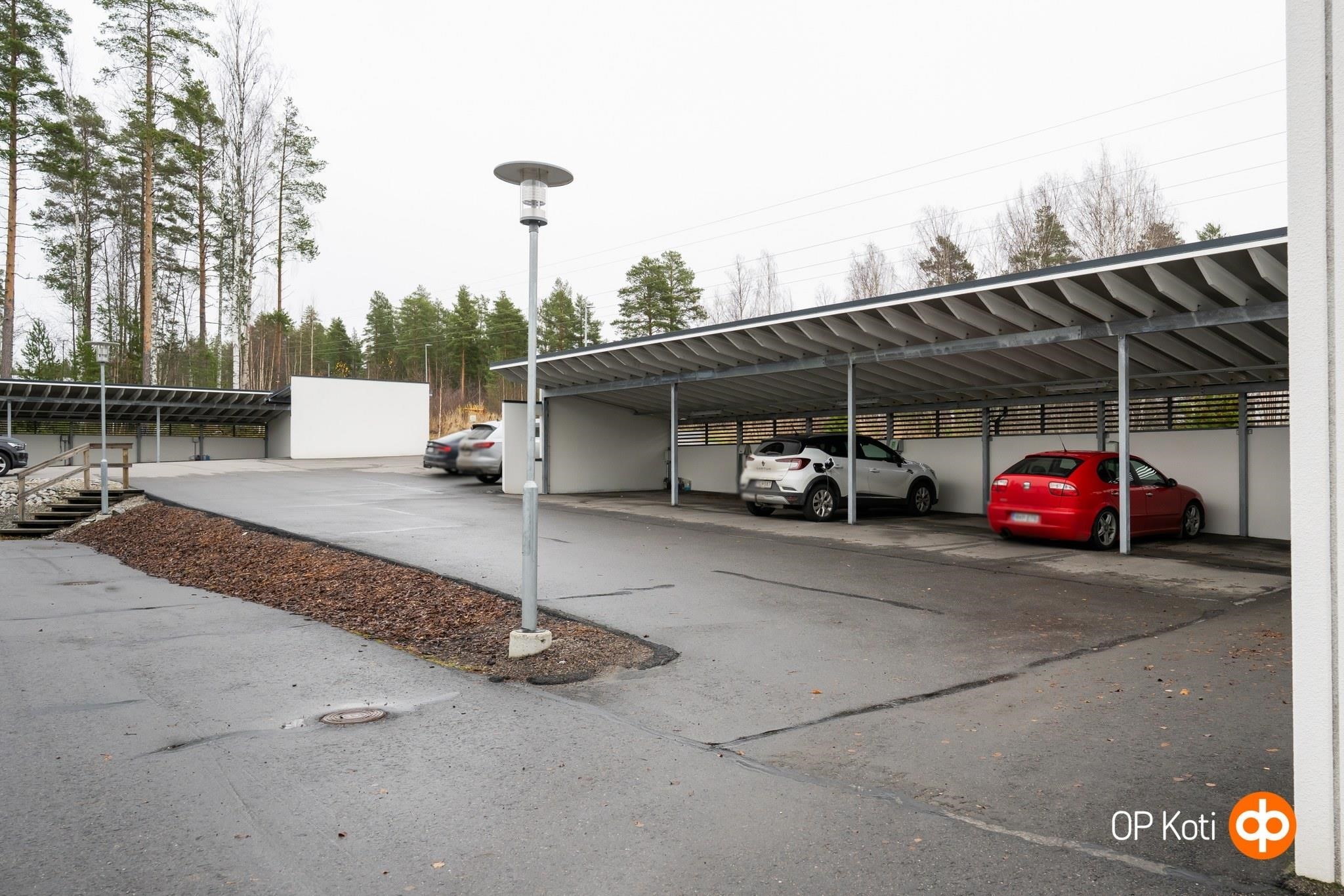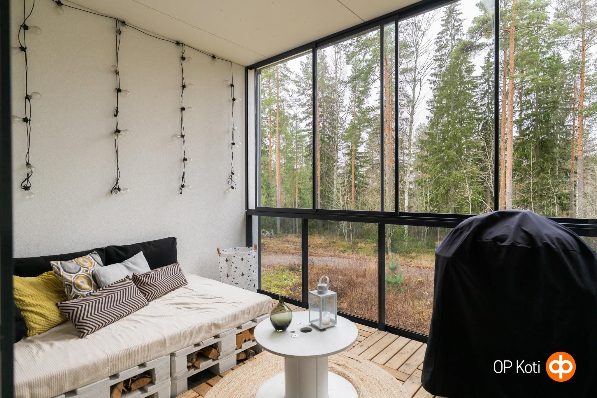 Asunnon tilavalta, koko matkalta lasitetulta parvekkeelta aukeaa seesteinen näkymä metsään sekä järvelle. Parvekkeella onnistuu niin grillailu, kuin syys- ja kesäilloista nautiskelukin. Asunnon yhteydessä myydään myös autokatospaikka hintaan 5 900€.