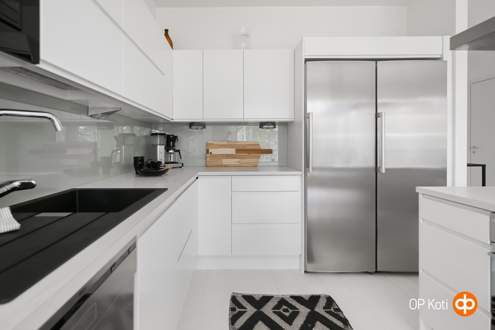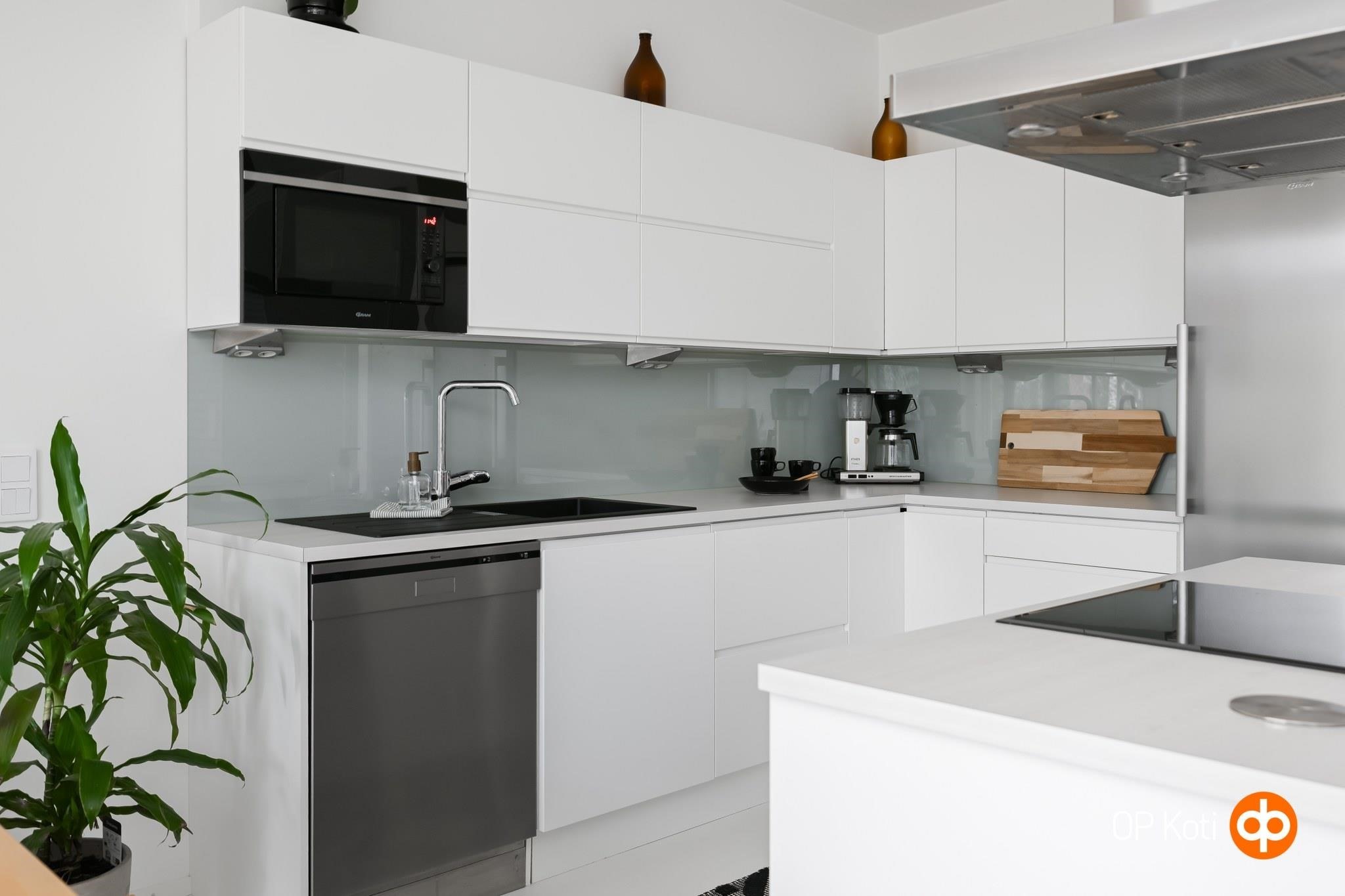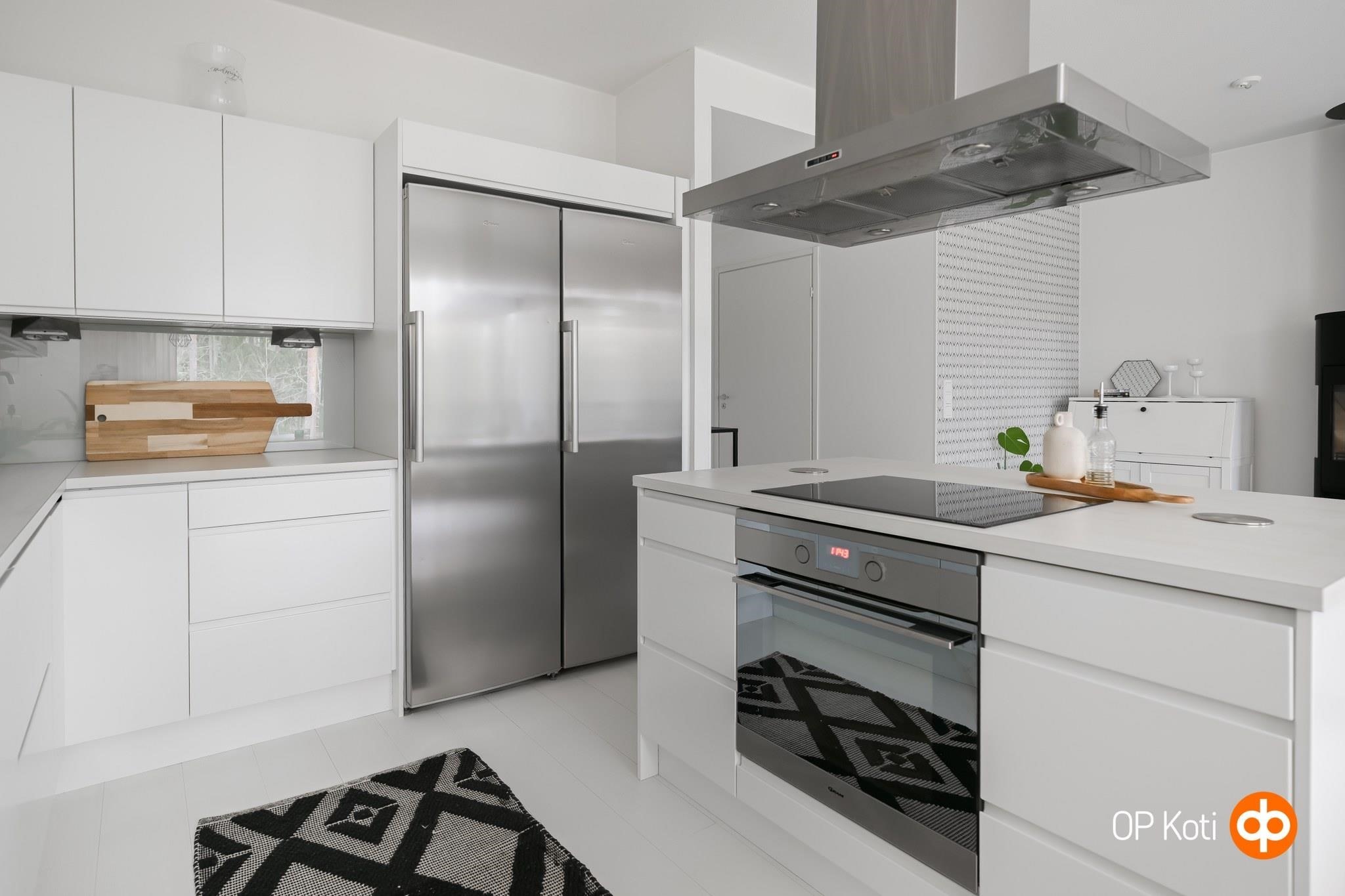 - Jääkaappi, pakastekaappi, erillisuuni, induktioliesi, liesituuletin, mikroaaltouuni, astianpesukone, kaapistot, irralliset saarekkeet, kiinteät valaisimet ledinauha kaappien alla.
