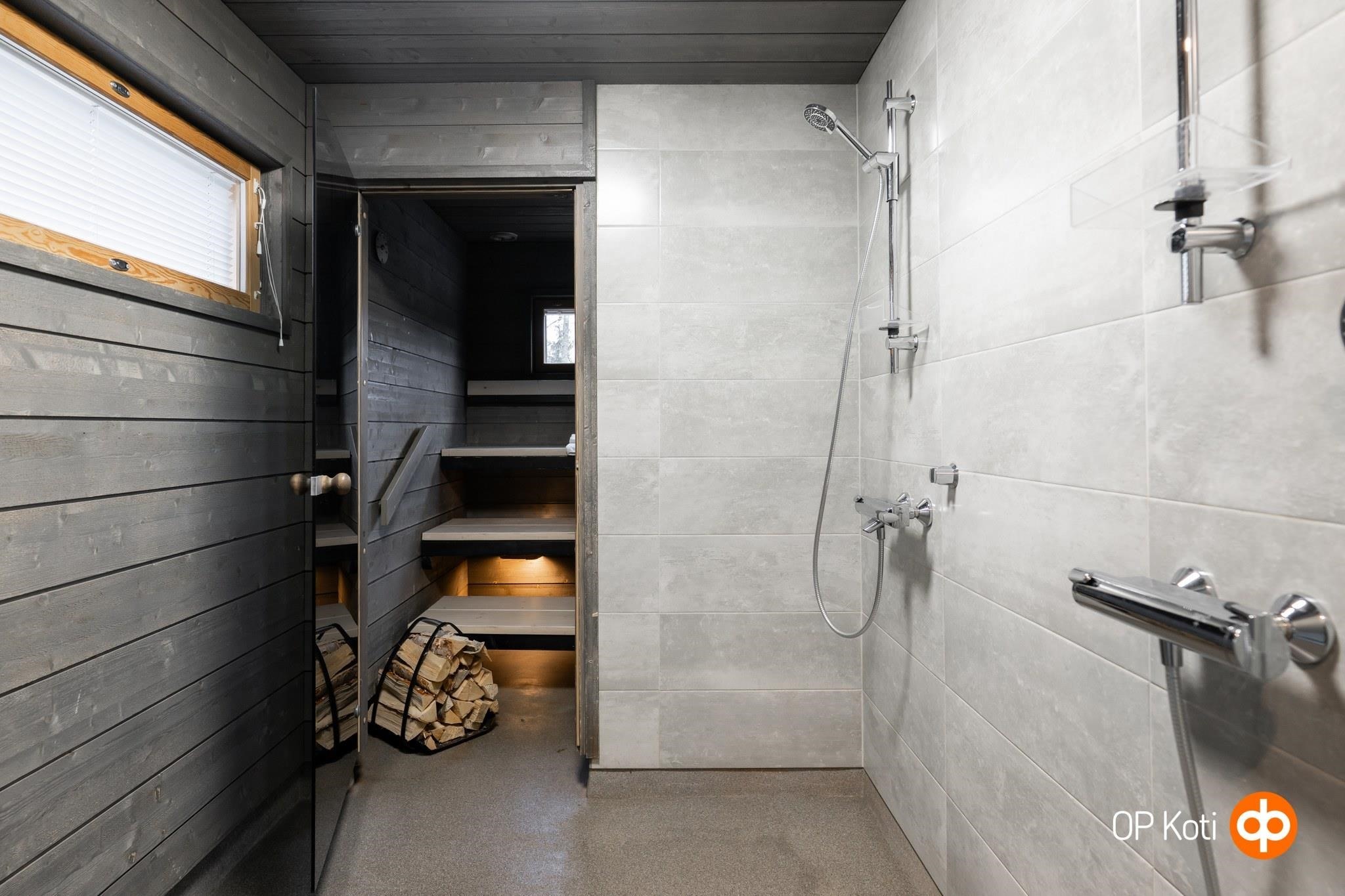 - Sauna, sähkökiuas, kylpyhuone, suihku, suihkuseinä, peilit, kaapit, allaskaappi, pesukoneliitäntä, lattialämmitys koko asunnossa, kiinteät valaisimet peilin ympärillä ledinauha, katossa spotit.