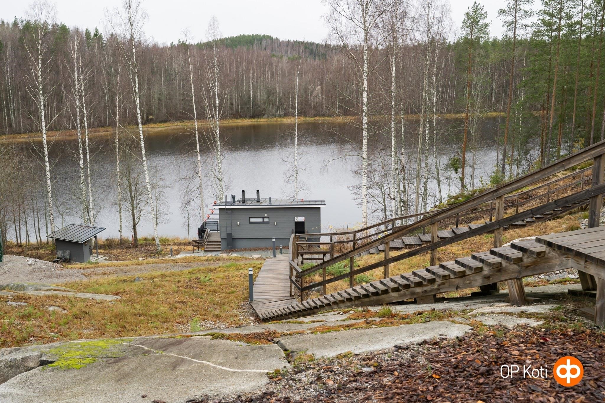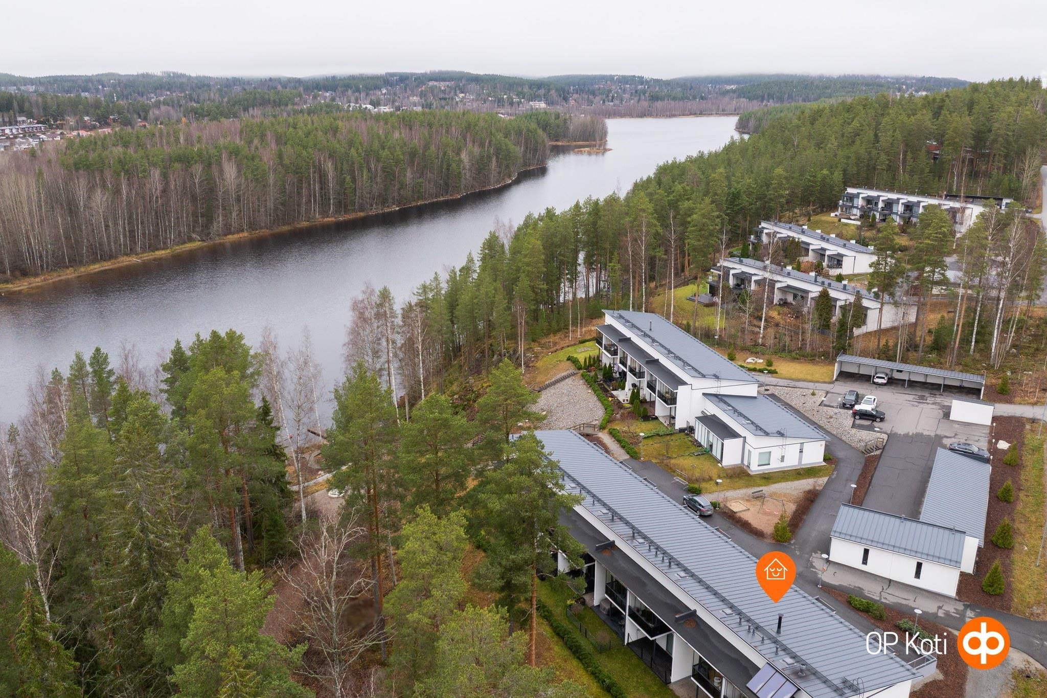 Kallioiselle tontille rakennettujen rivitalojen edustalta lähtevät portaat alas rantasaunalle, mistä aukeavat kauniit näkymät järvelle. Pääset siis uimaan suoraan saunan löylyistä niin kesäisin, kuin talvisinkin ja voit jäähdytellä tunnelmallisessa takkahuoneessa virvokkeita nautiskellen. Myös grillaaminen onnistuu rannassa olevalla grillipaikalla. Asunnon käytössä on myös venepaikka, jonka ansiosta pääset veneilemään Päijänteelle suoraan omasta pihasta.