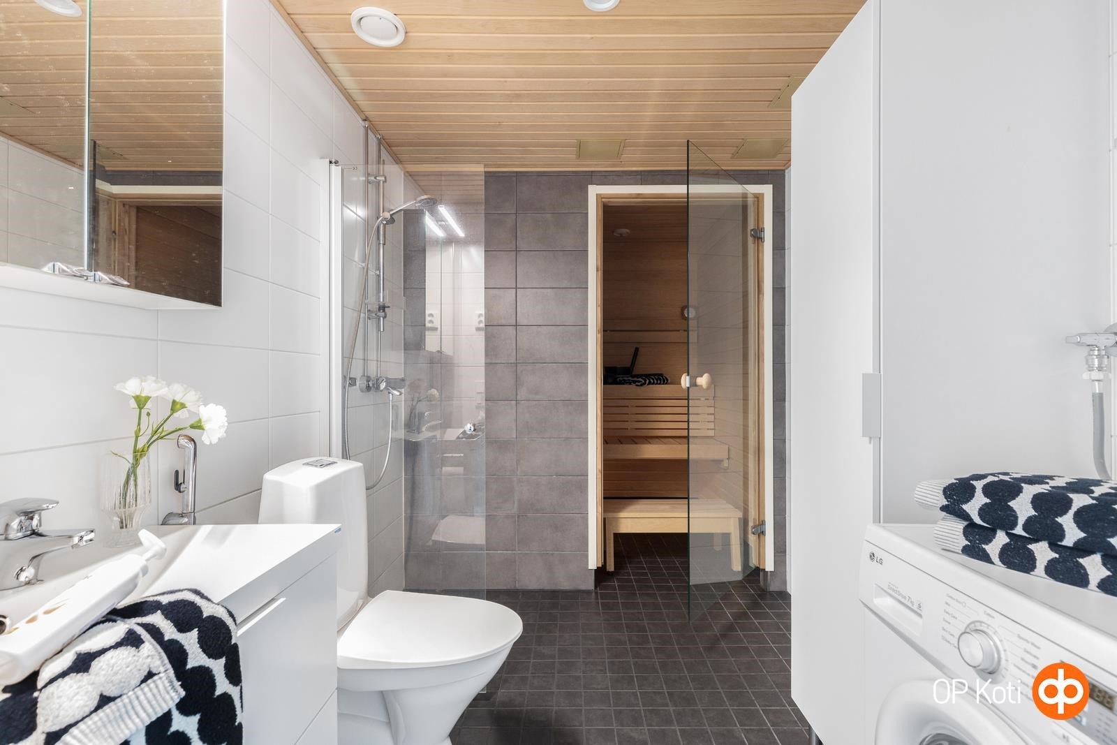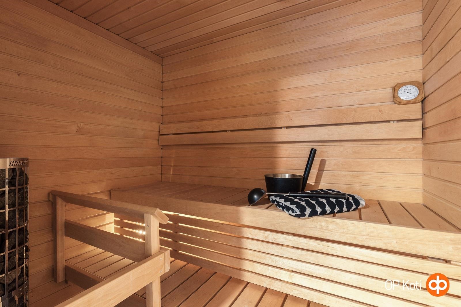 - Sauna, sähkökiuas (Harvia Cilindro), kylpyhuone, suihku, suihkuseinä, peilikaappi, kaapit, allaskaappi, pesukoneliitäntä, lattialämmitys, kiinteät valaisimet.