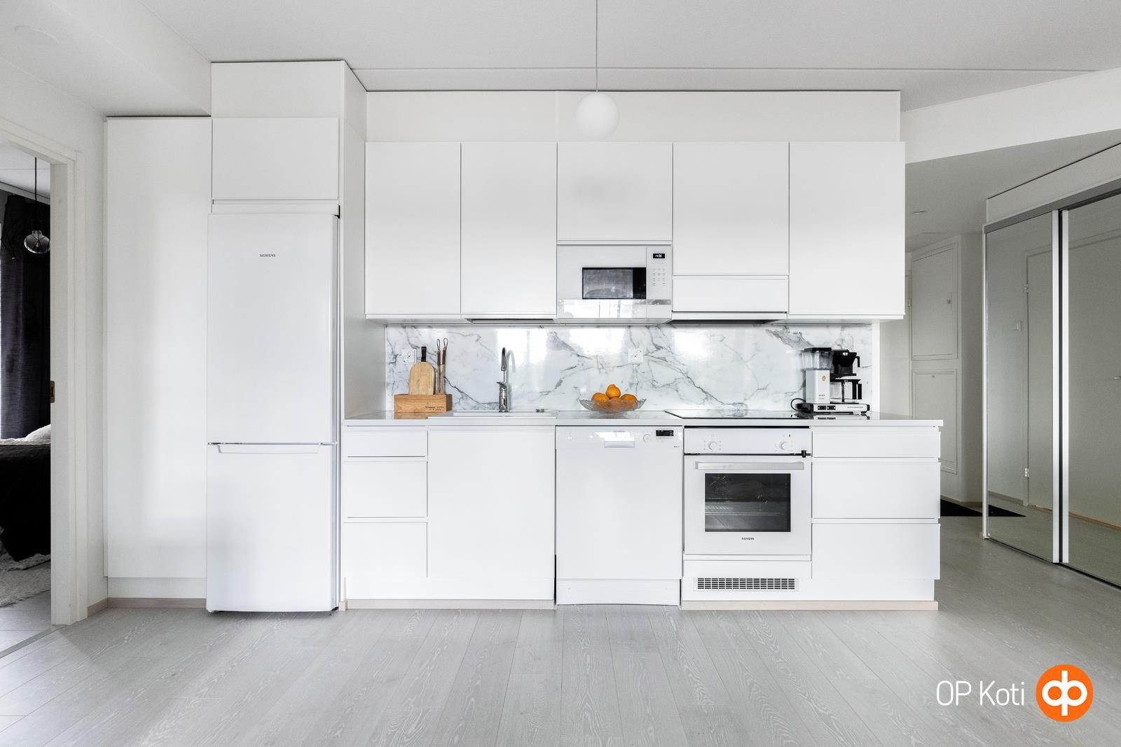 - Jääkaappipakastin, erillisuuni, keraaminen liesi, liesikupu, mikroaaltouuni, astianpesukone, kaapistot, kiinteät valaisimet.
