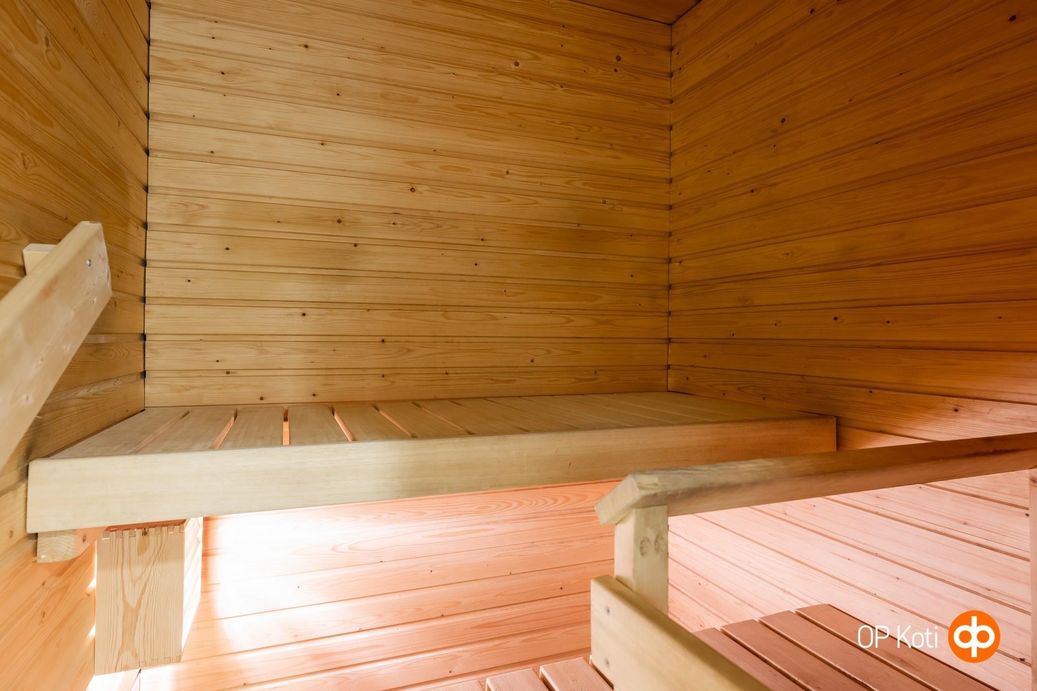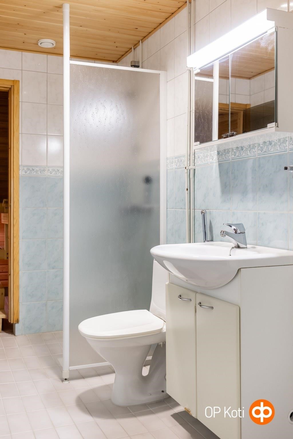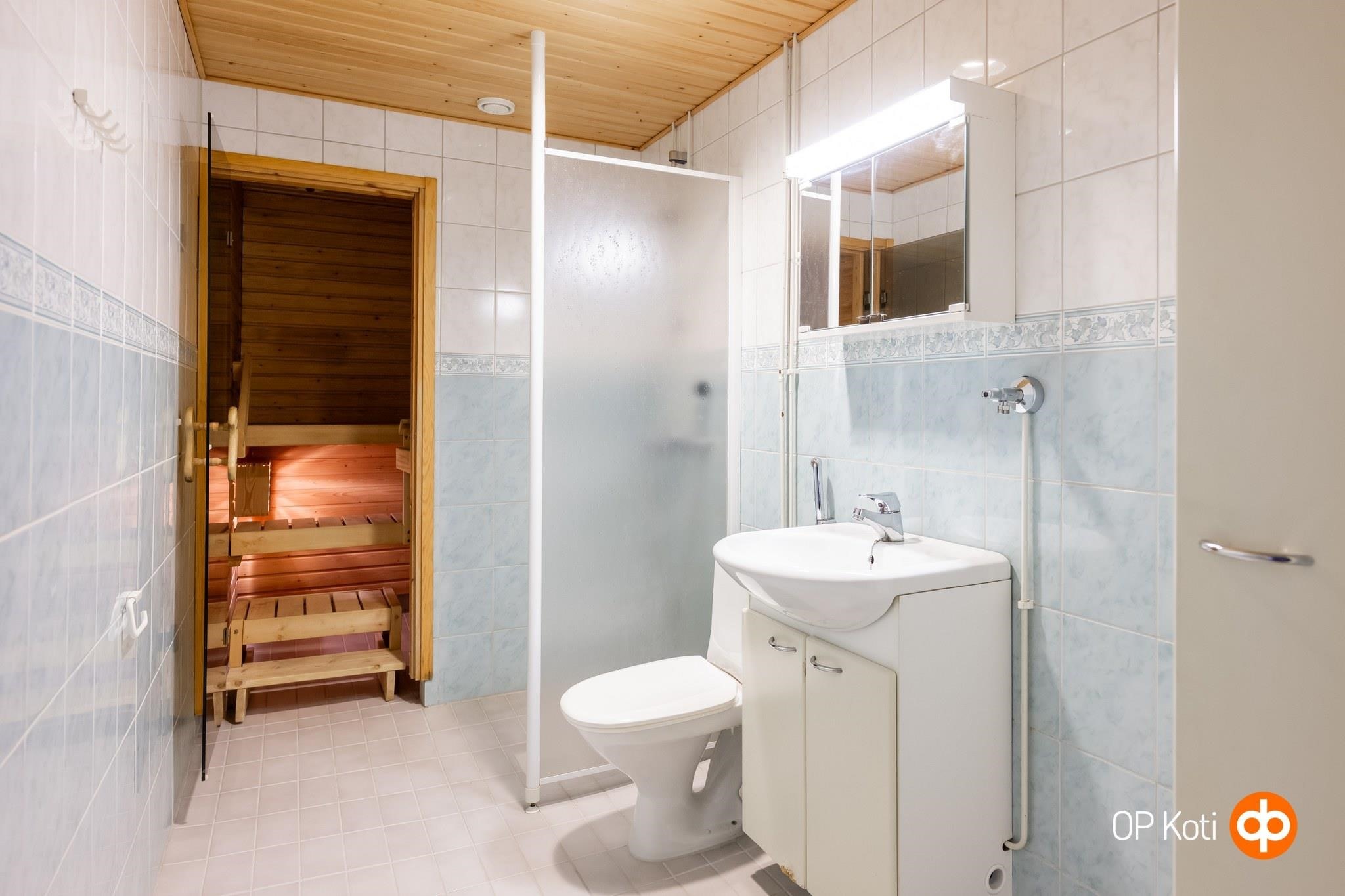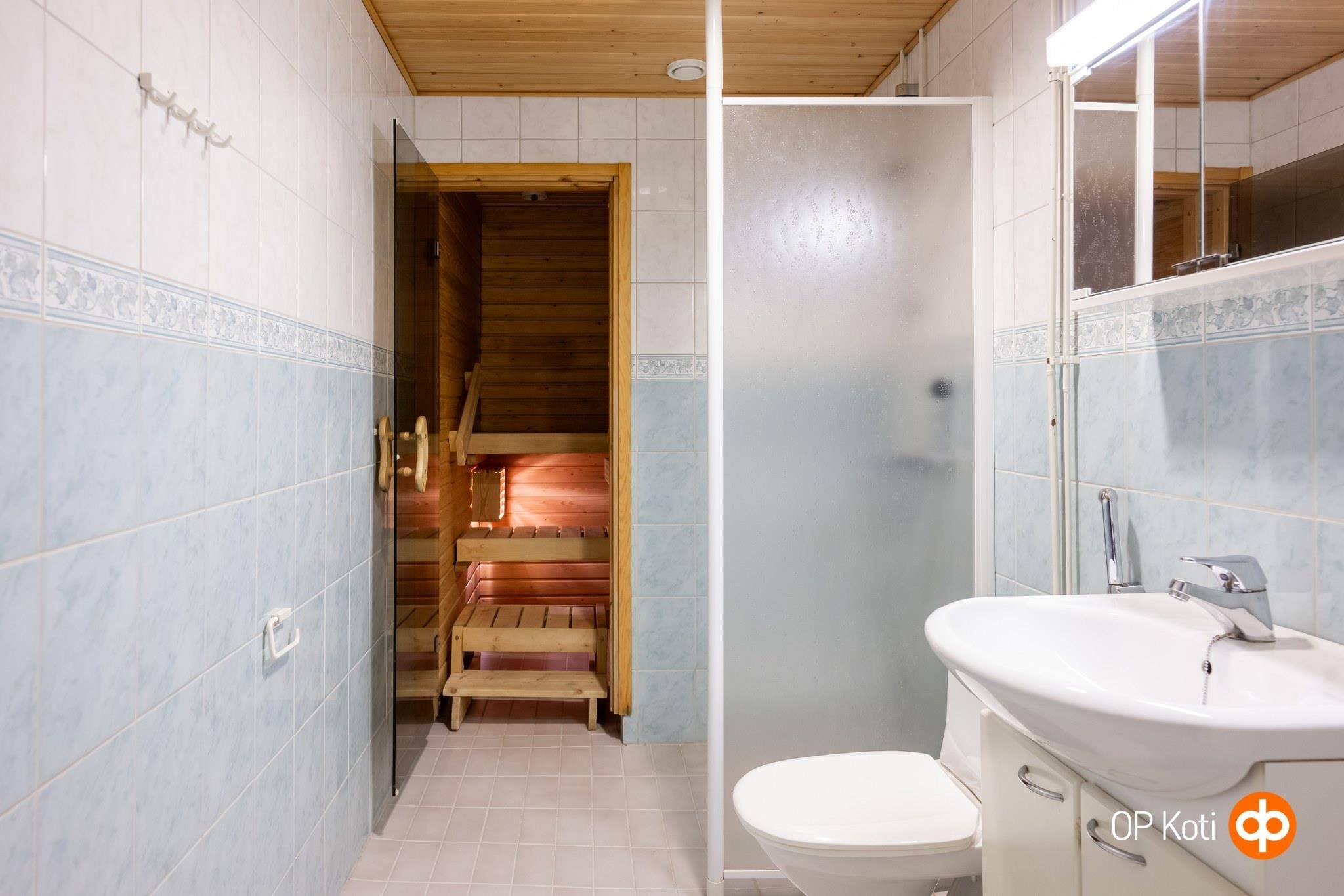 - Sauna, sähkökiuas, suihkuseinä, peilikaappi, allaskaappi, pesukoneliitäntä, lattialämmitys, kiinteät valaisimet.