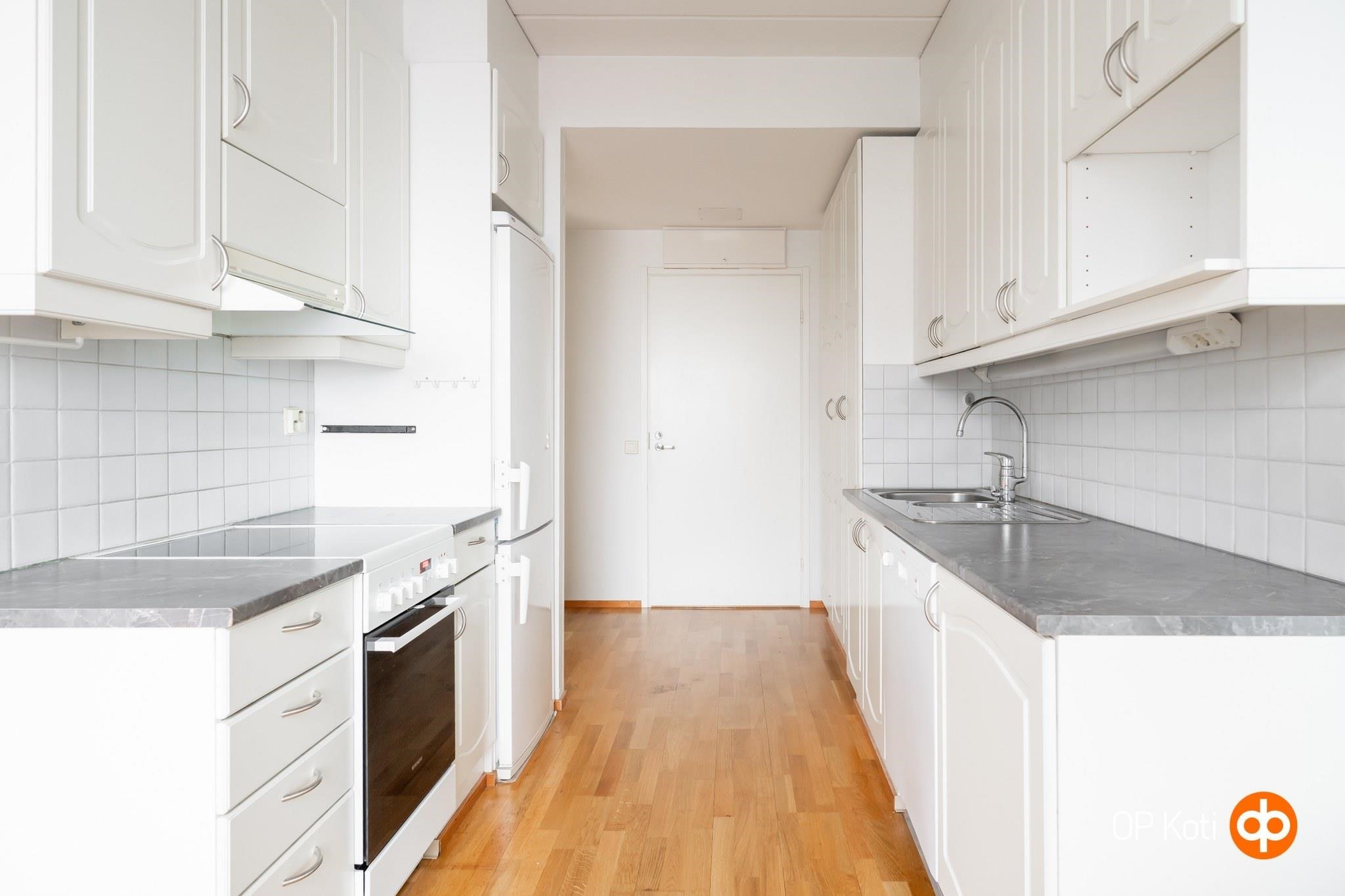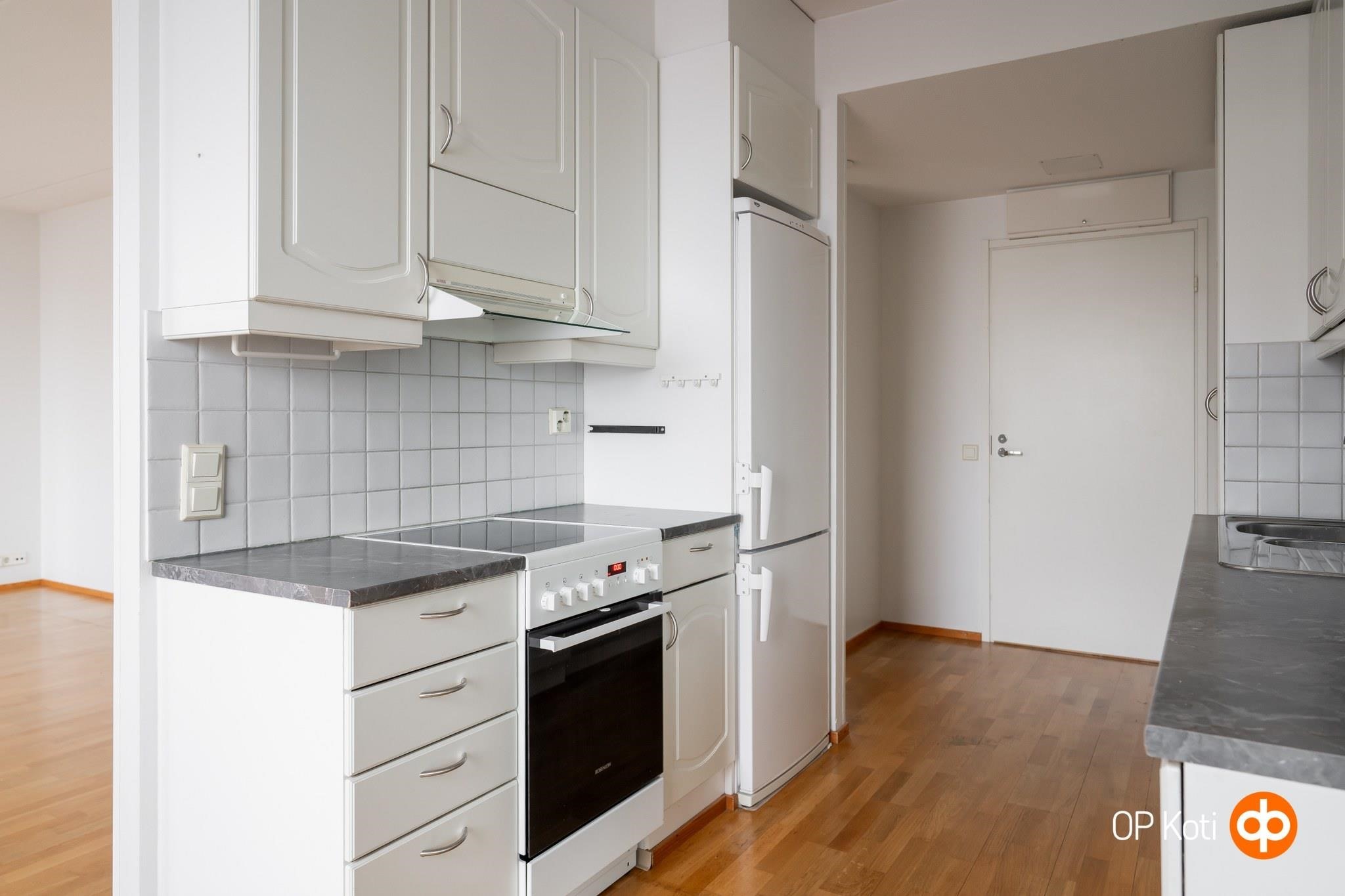 - Jääkaappipakastin, keraaminen liesi, liesikupu, astianpesukone, kiinteät valaisimet.