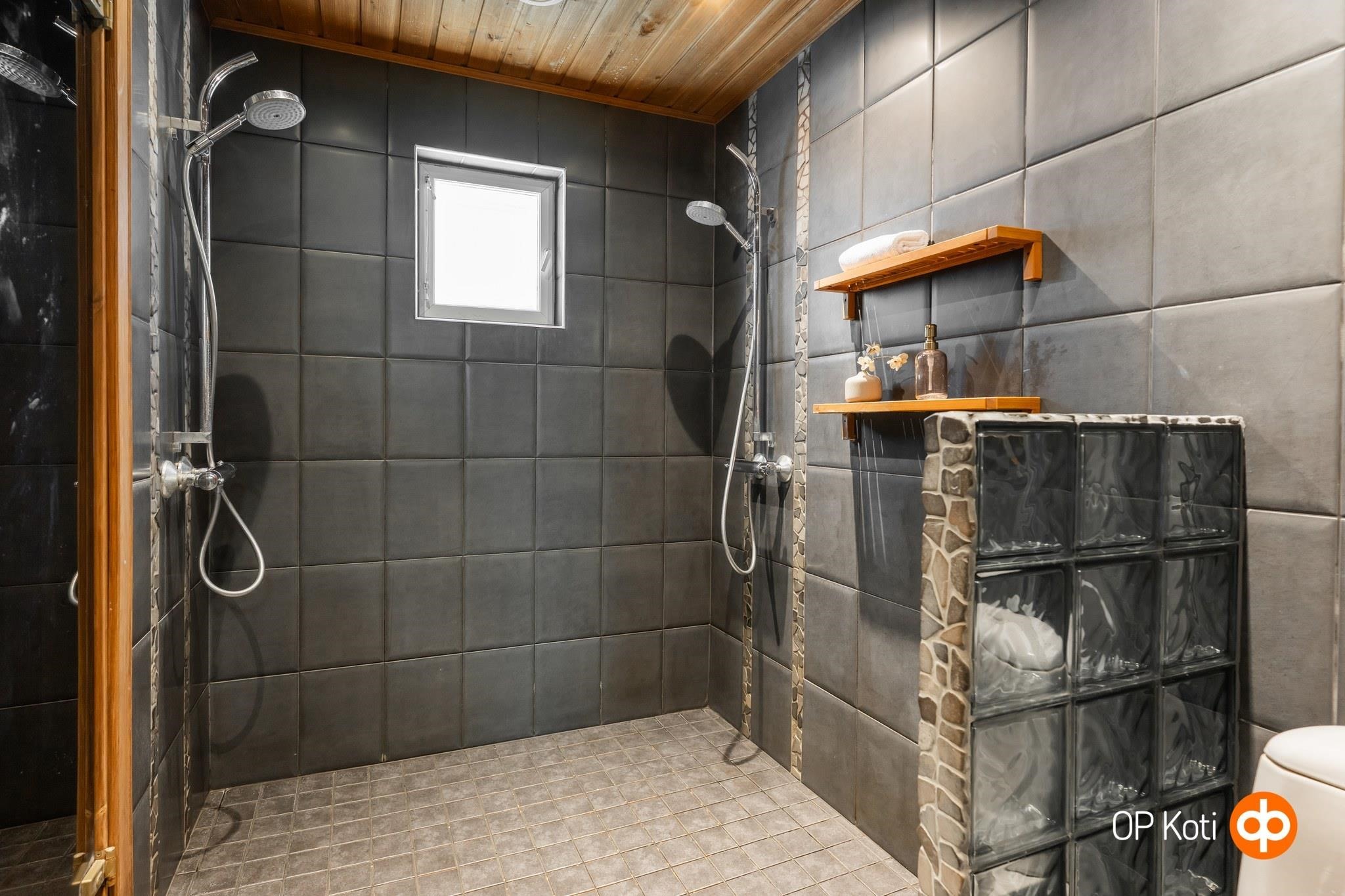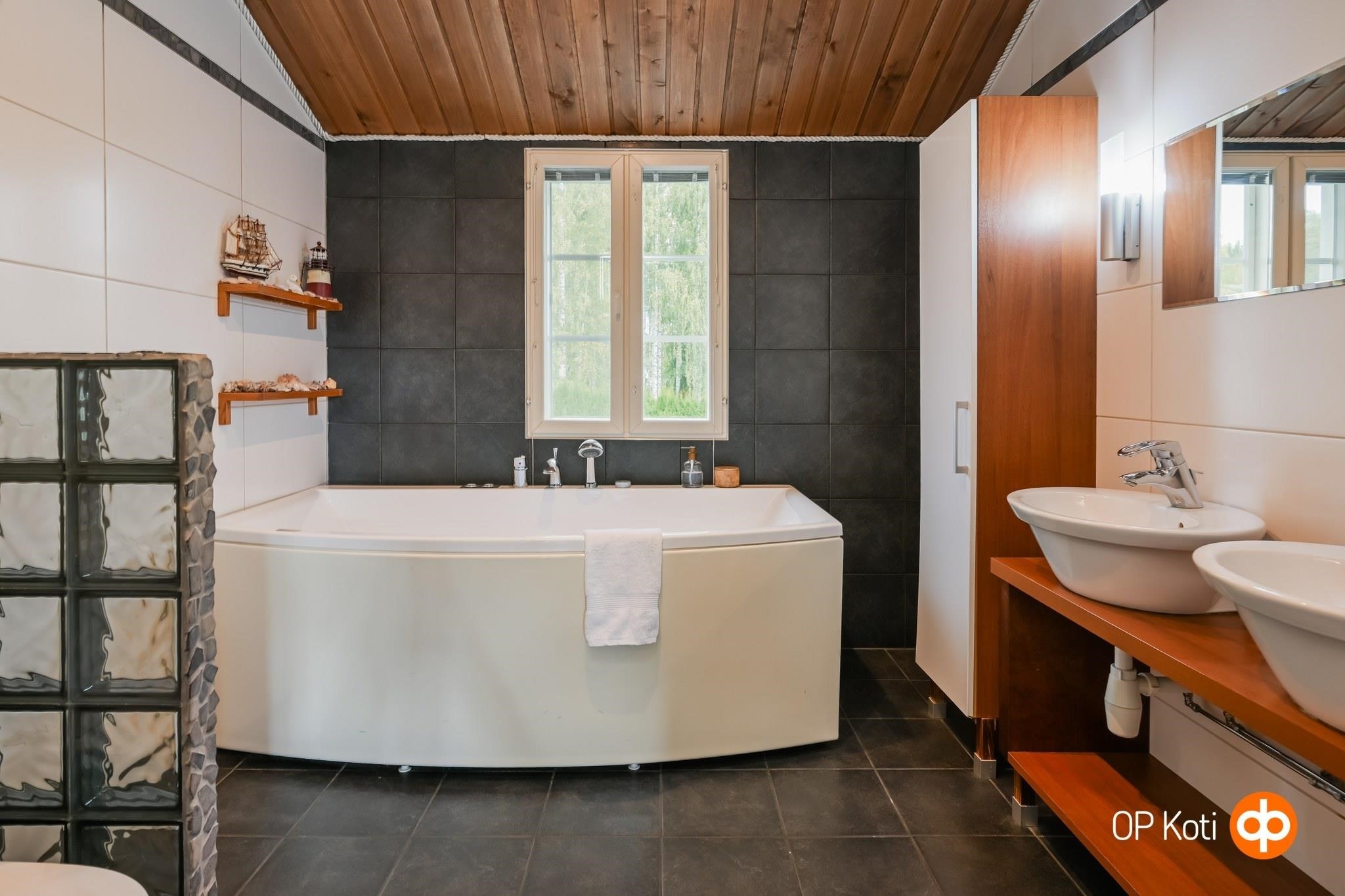 - Sauna muotolauteet, sähkökiuas Ainavalmis -kiuas, kylpyhuone kahdella suihkulla, erillinen wc, suihku, amme poreamme, peilit, peilikaappi, kaapit, pesukoneliitäntä, lattialämmitys, kiinteät valaisimet.