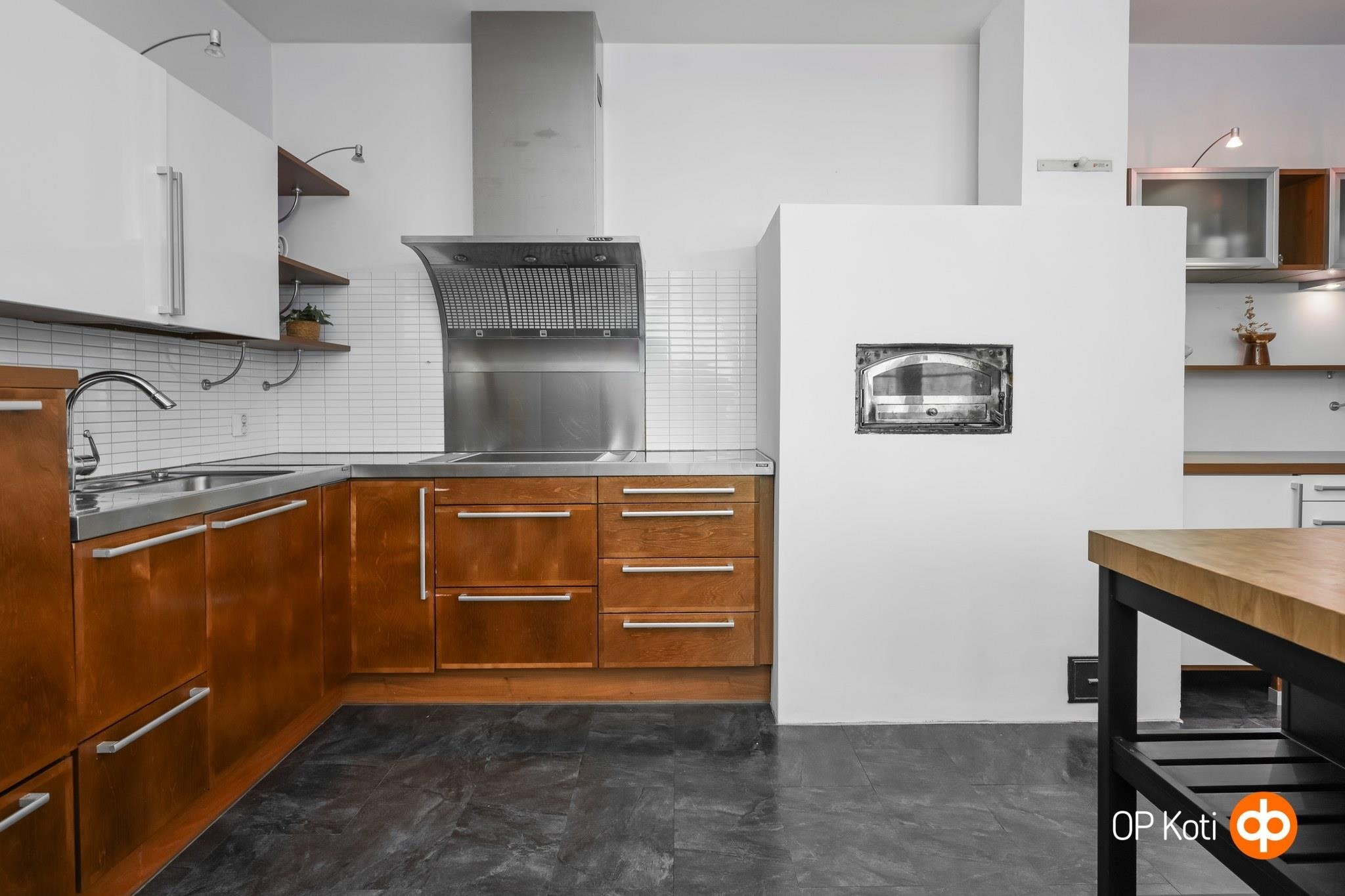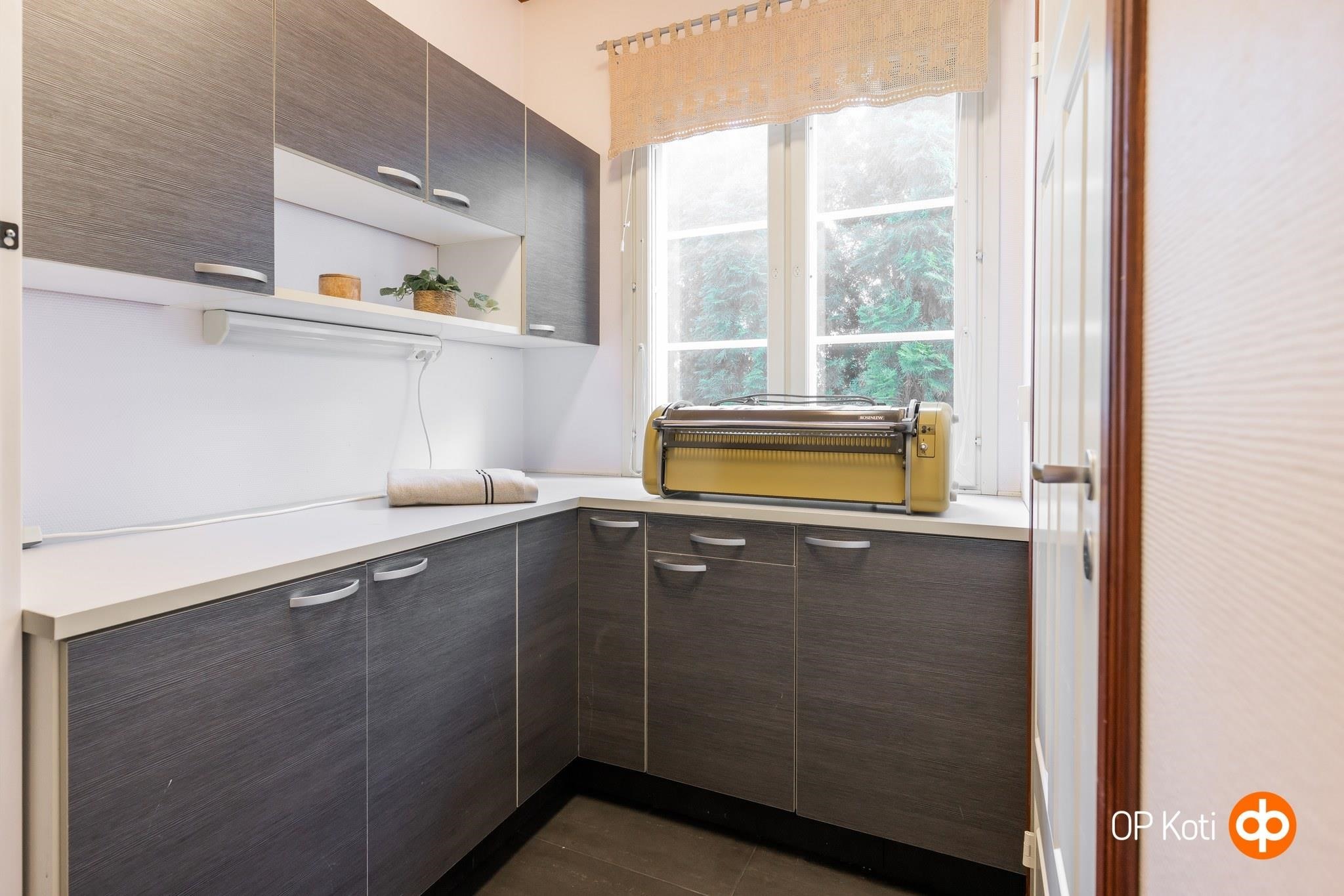 - Jääviileäkaappi, pakastekaappi, erillisuuni, liesitaso, liesituuletin, leivinuuni, astianpesukone, kaapistot, irralliset kaapistot, kiinteät valaisimet, pöytätasojen materiaali laminaattitasot.