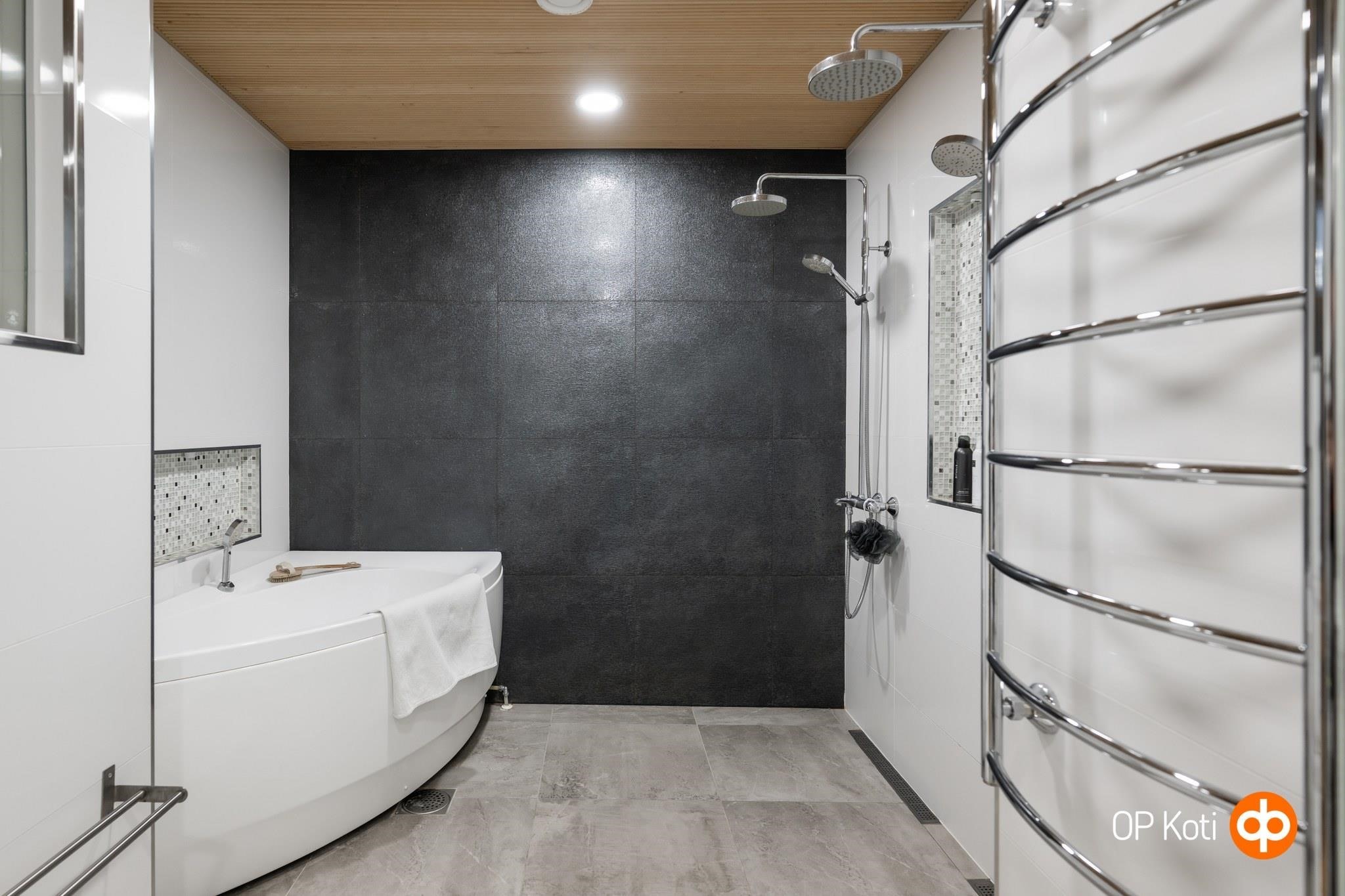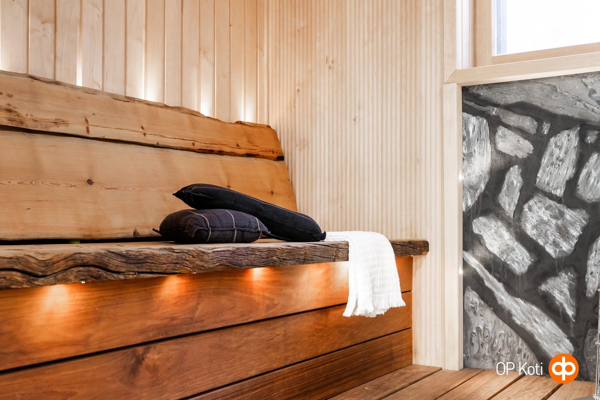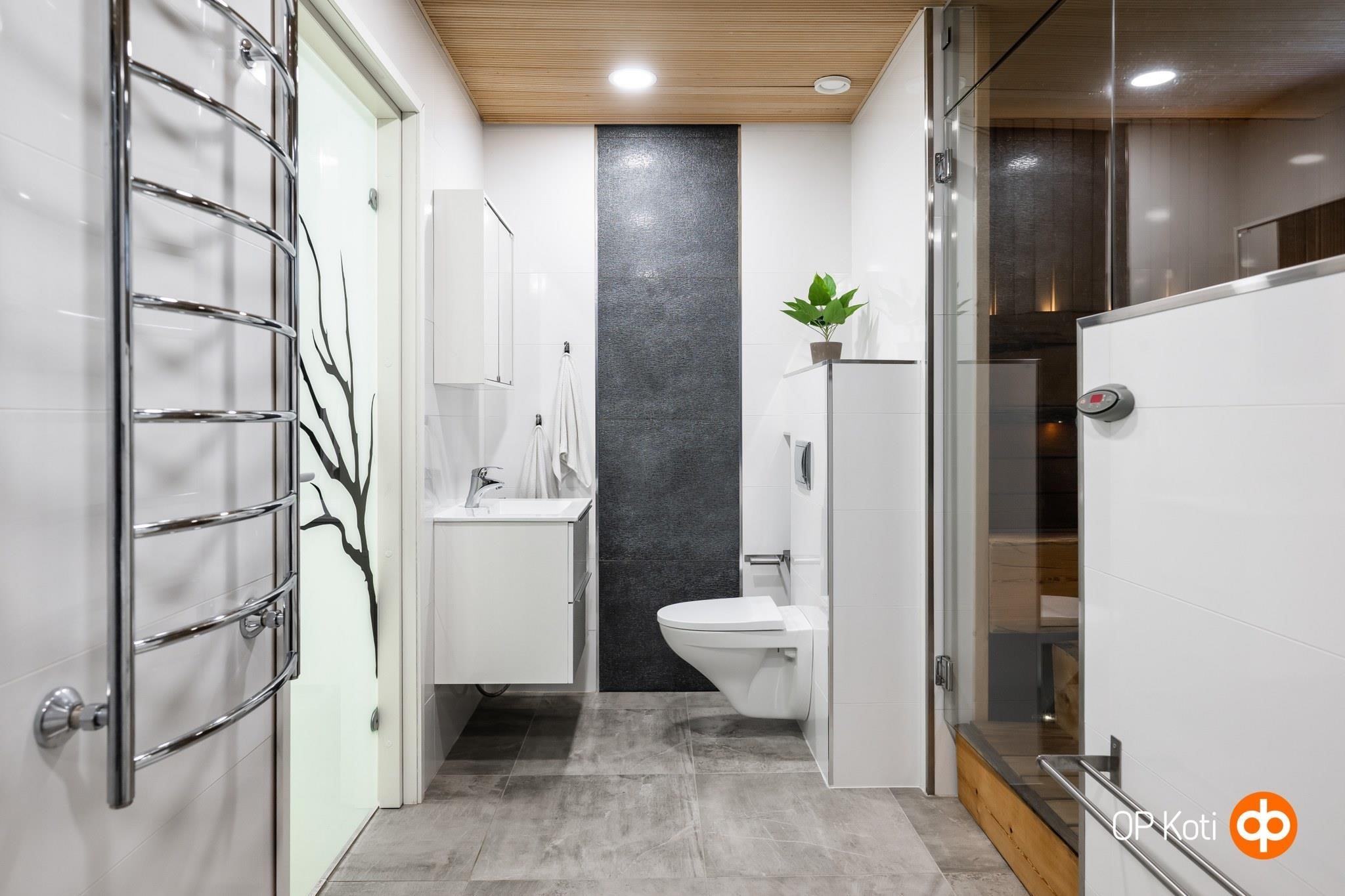 - Sauna, sähkökiuas, kylpyhuone, erillinen wc, suihku, suihkukaappi, amme (poreamme), peilit, peilikaappi, kaapit, pesukoneliitäntä, lattialämmitys, kiinteät valaisimet.