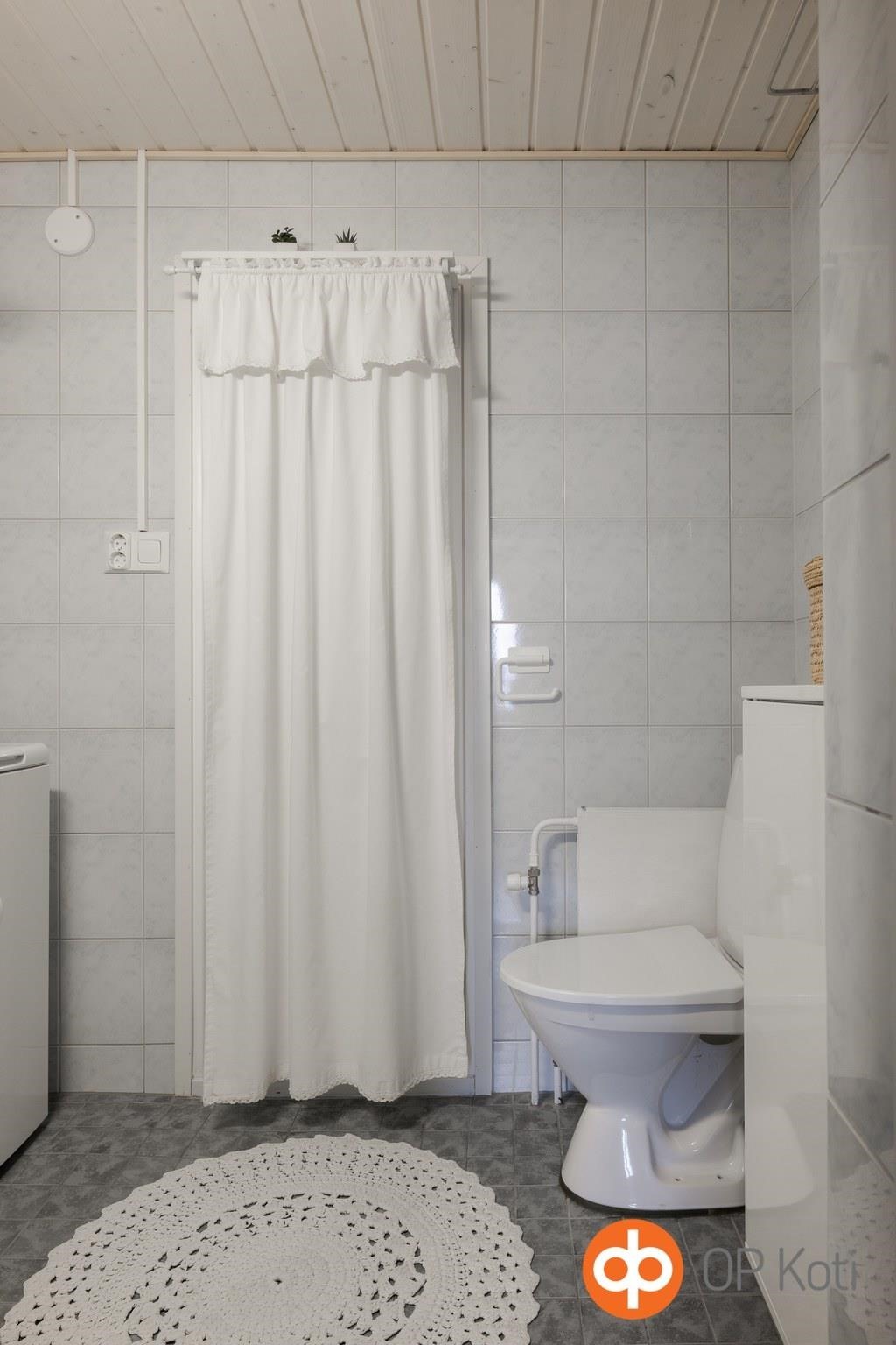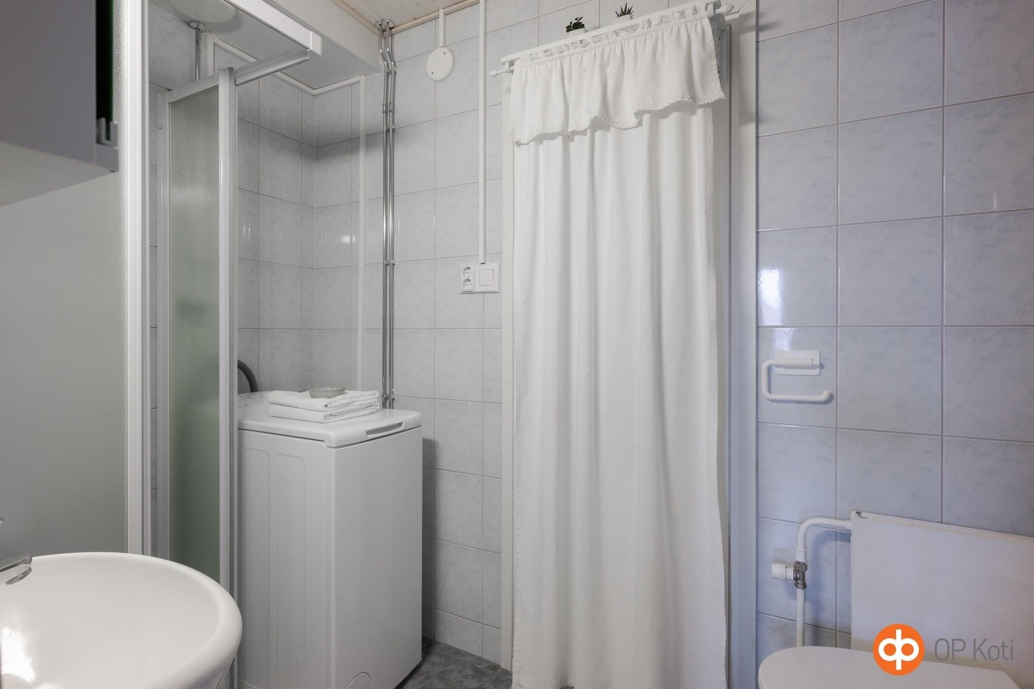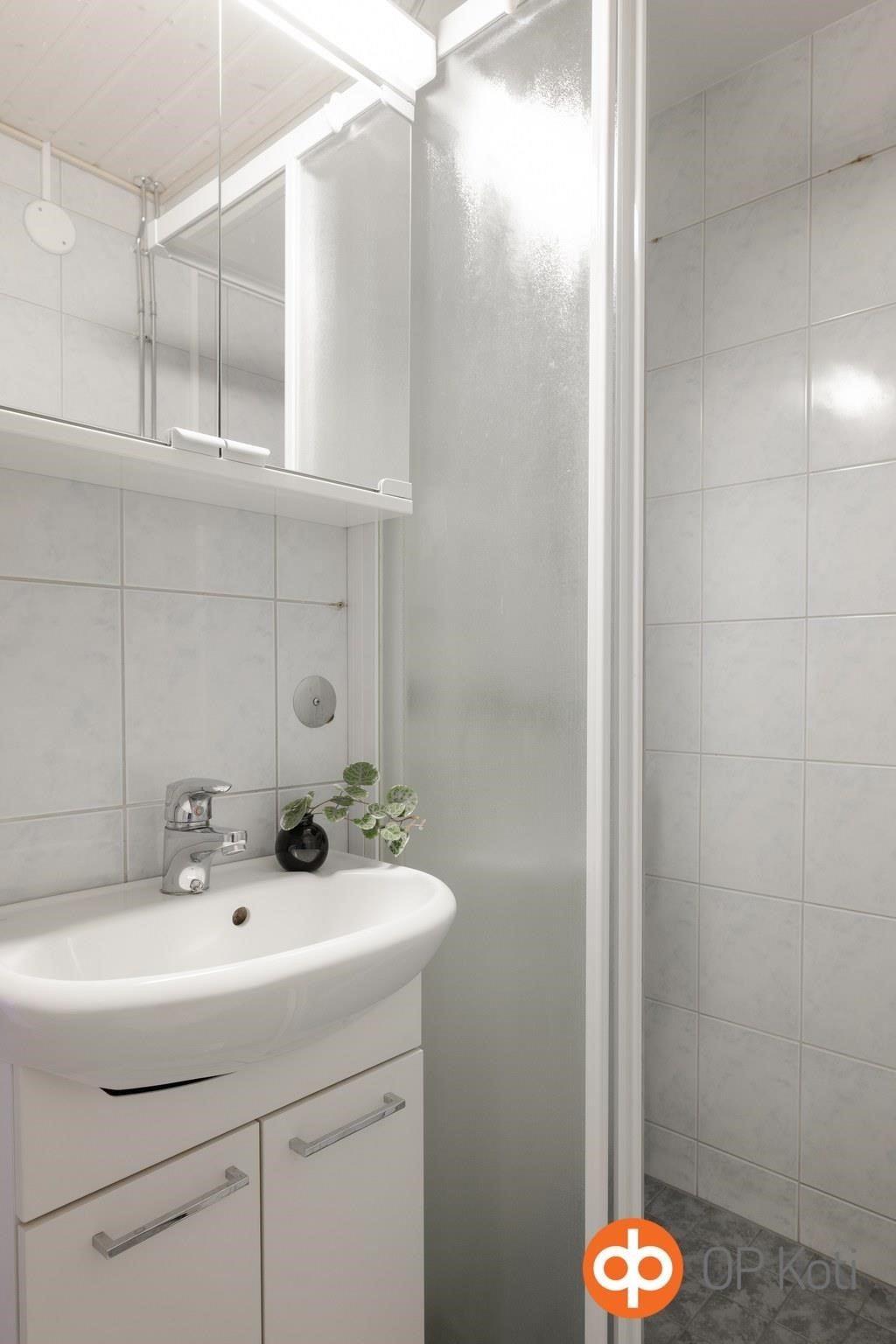 - Kylpyhuone, suihku, suihkukaappi, peilikaappi, allaskaappi, pesukoneliitäntä, kiinteät valaisimet.