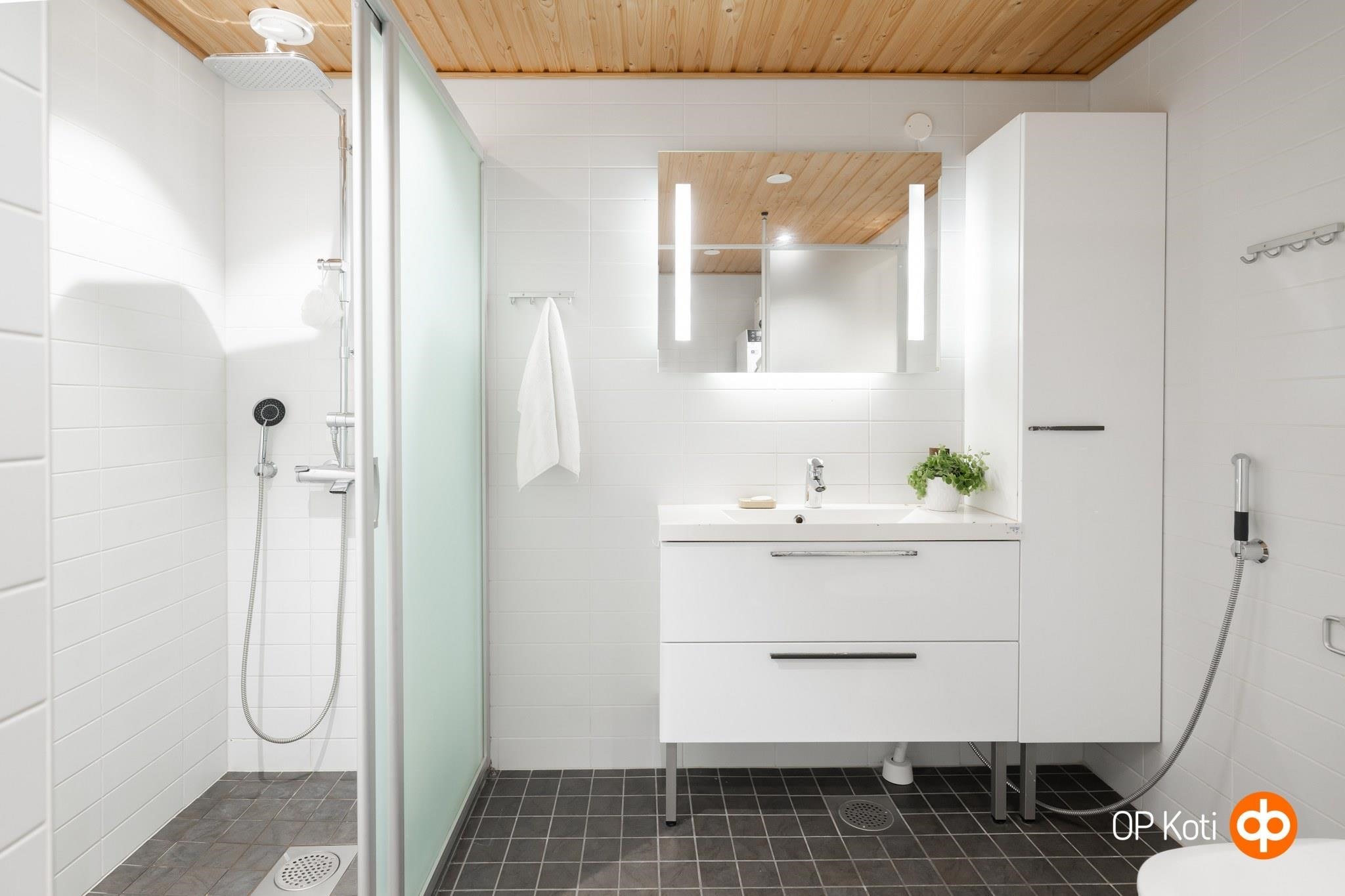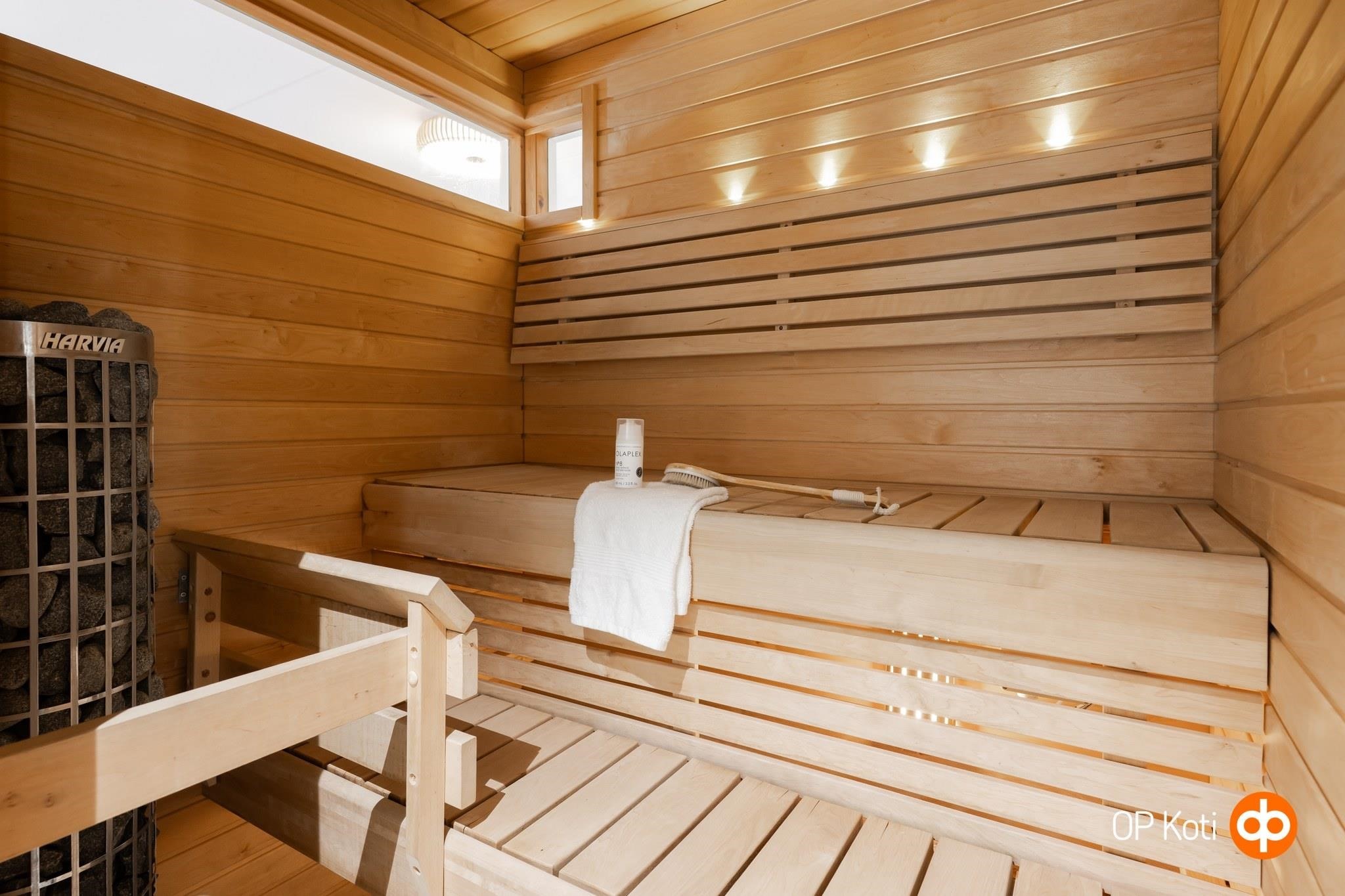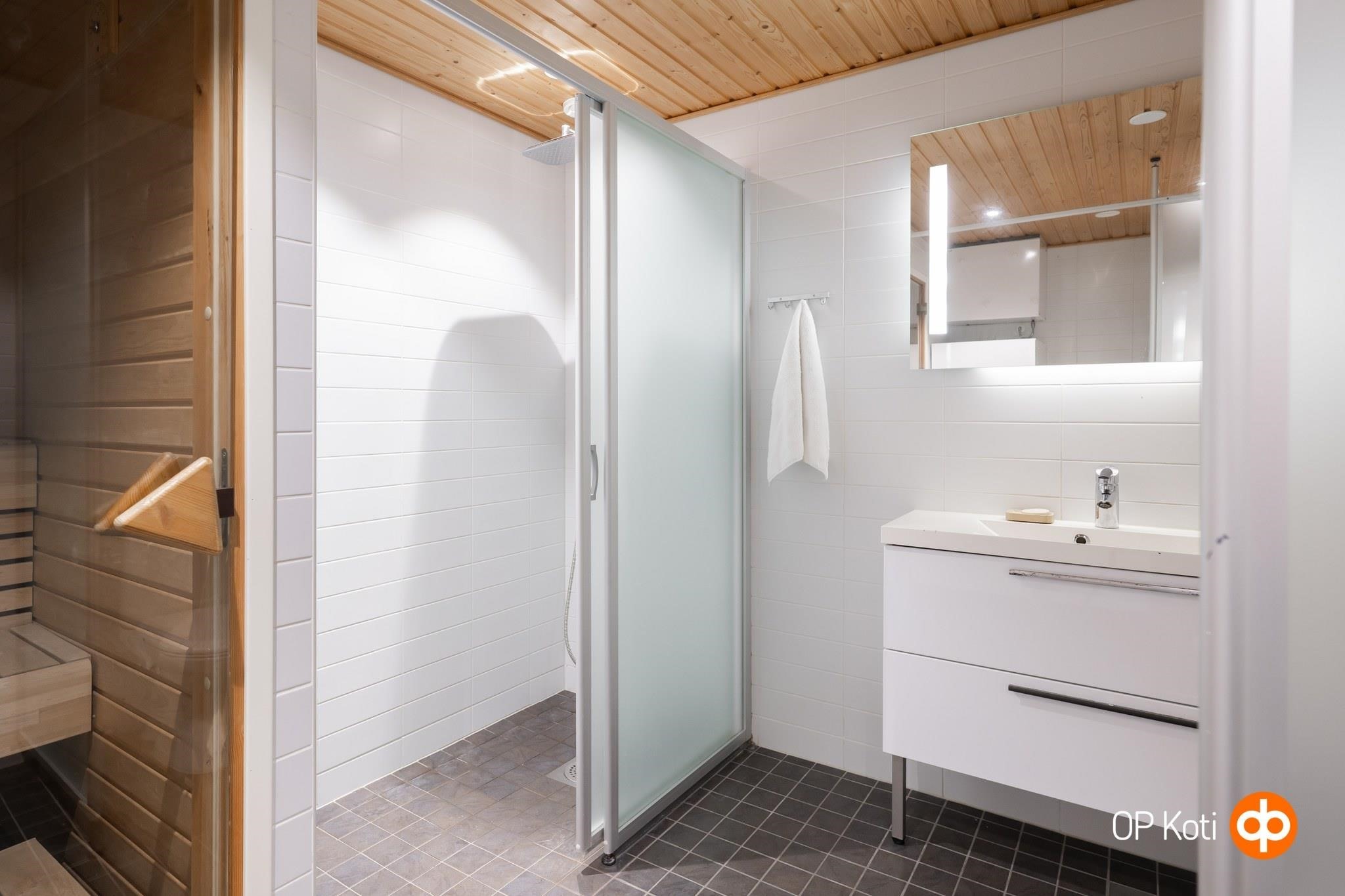 - Sauna, sähkökiuas, kylpyhuone, erillinen wc, suihku, suihkuseinä, peilit, kaapit, pesukoneliitäntä, lattialämmitys, kiinteät valaisimet.