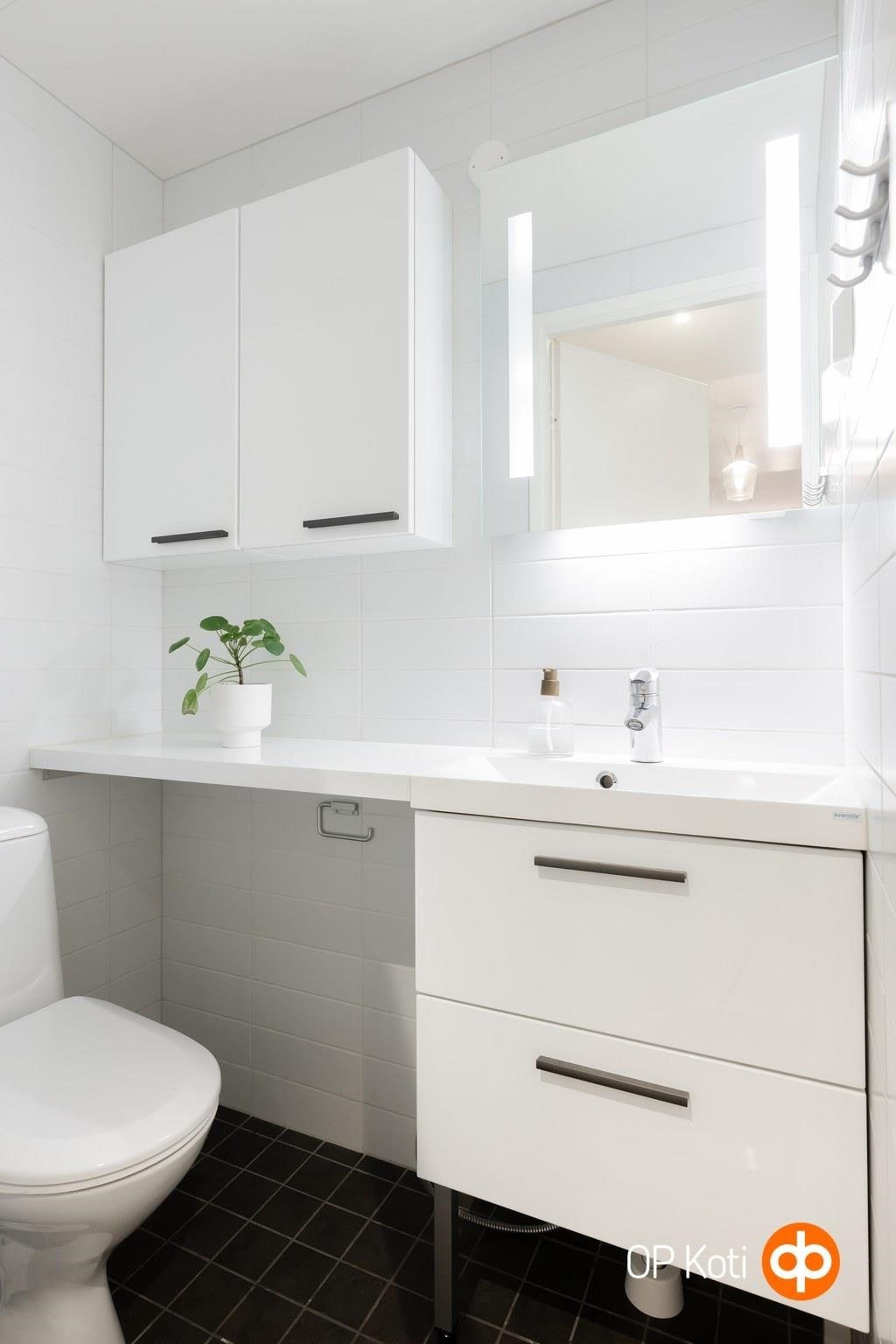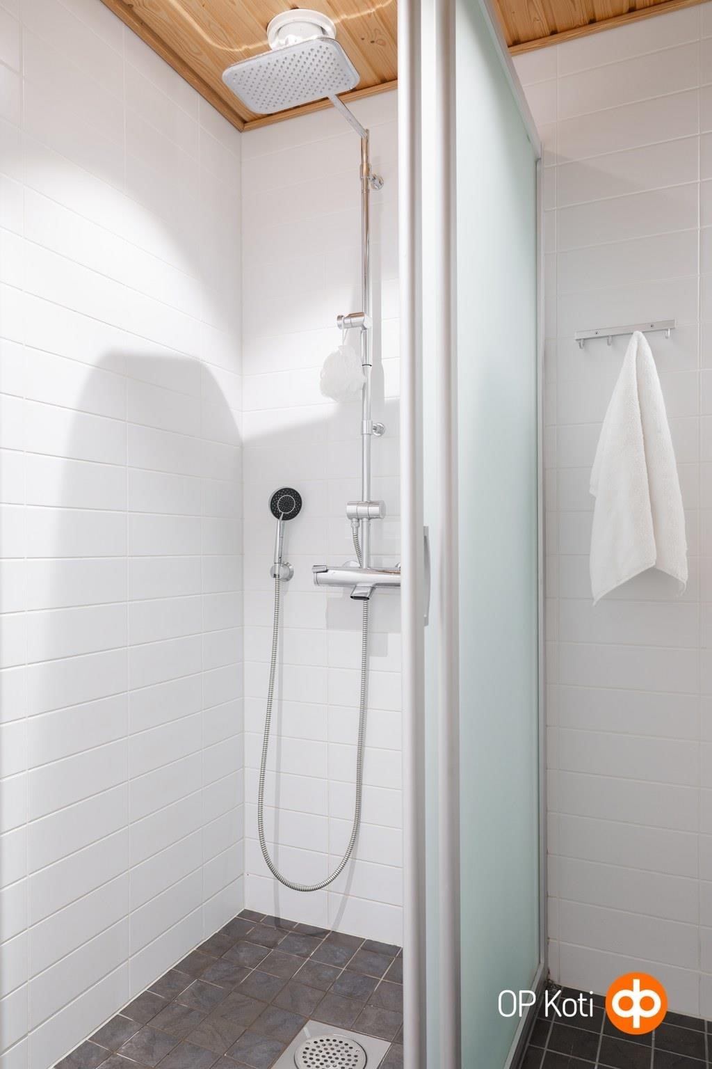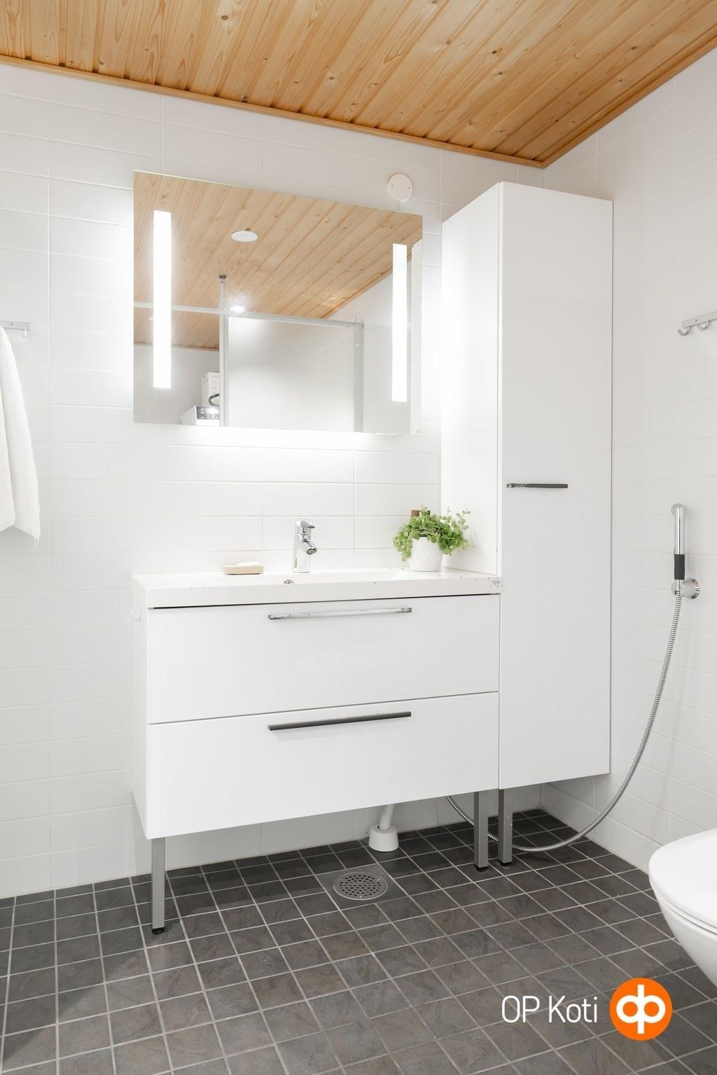 - Sauna, sähkökiuas, kylpyhuone, erillinen wc, suihku, suihkuseinä, peilit, kaapit, pesukoneliitäntä, lattialämmitys, kiinteät valaisimet.