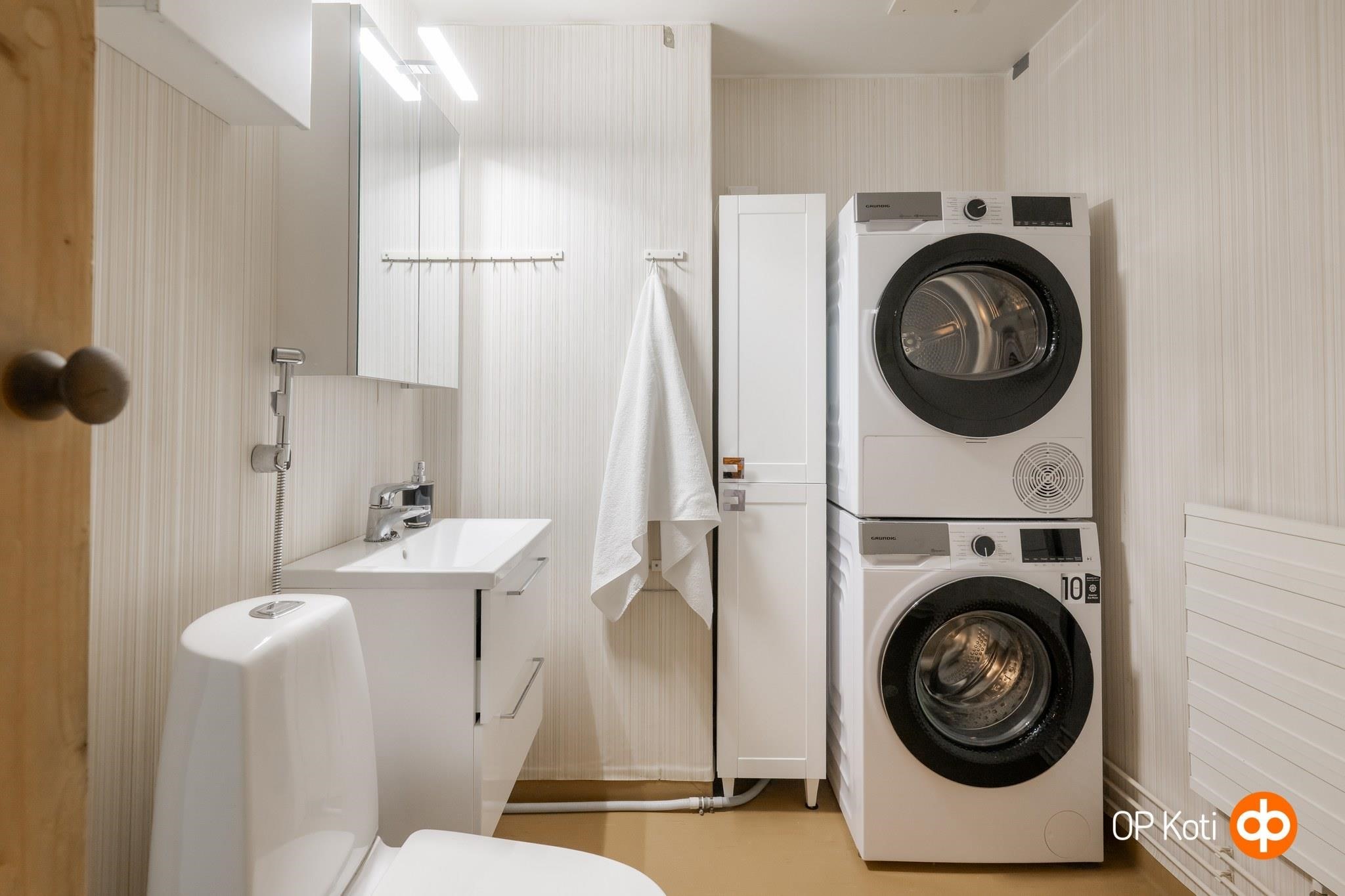 - Sauna, sähkökiuas, kylpyhuone, suihku, peilikaappi, kaapit, allaskaappi, pesukoneliitäntä, kiinteät valaisimet. Kaapistot, wc -pönttö, lavuaari, lauteet ja kiuas uusittu 2023.