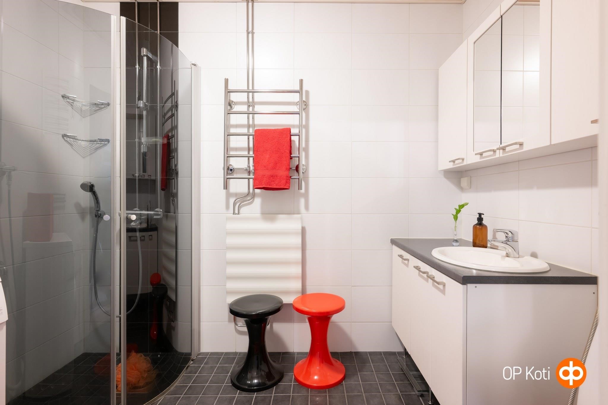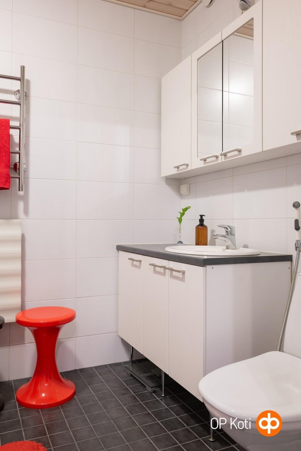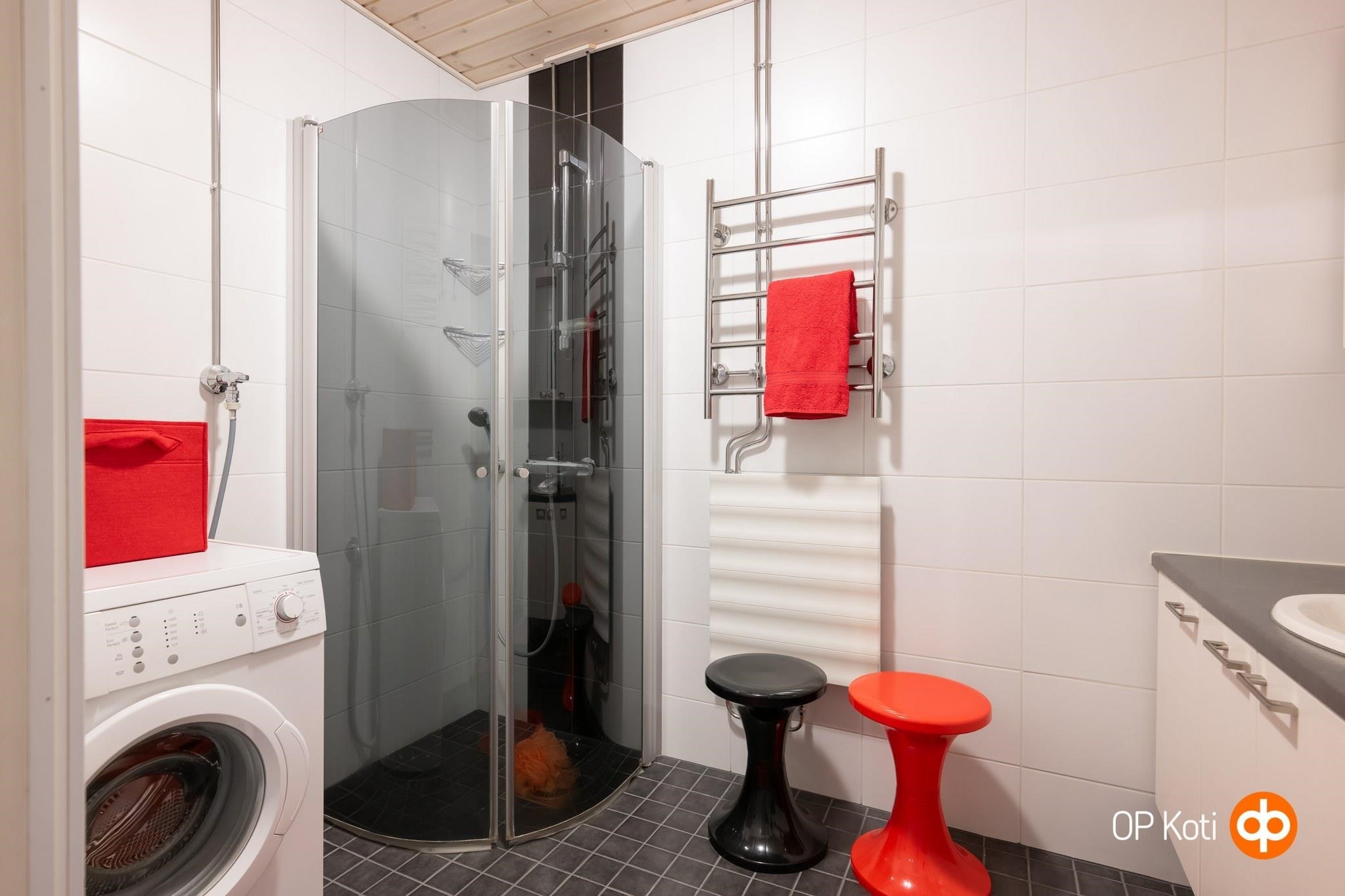 - Kylpyhuone, suihku, suihkuseinä, peilikaappi, kaapit, allaskaappi, pesukoneliitäntä, kiinteät valaisimet.