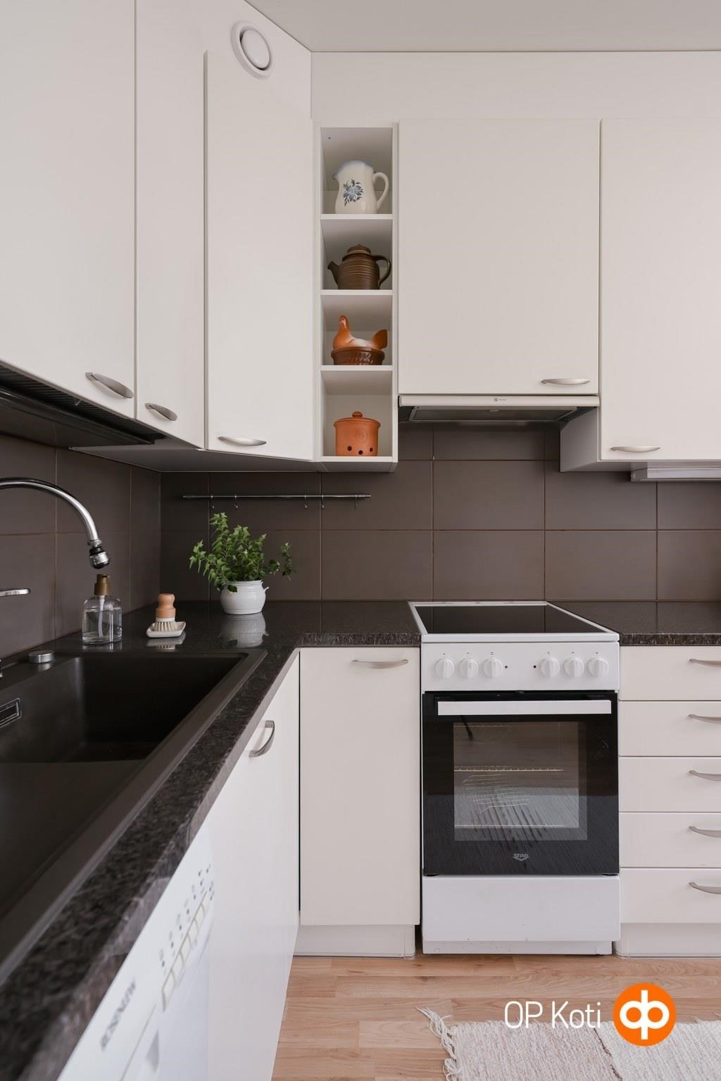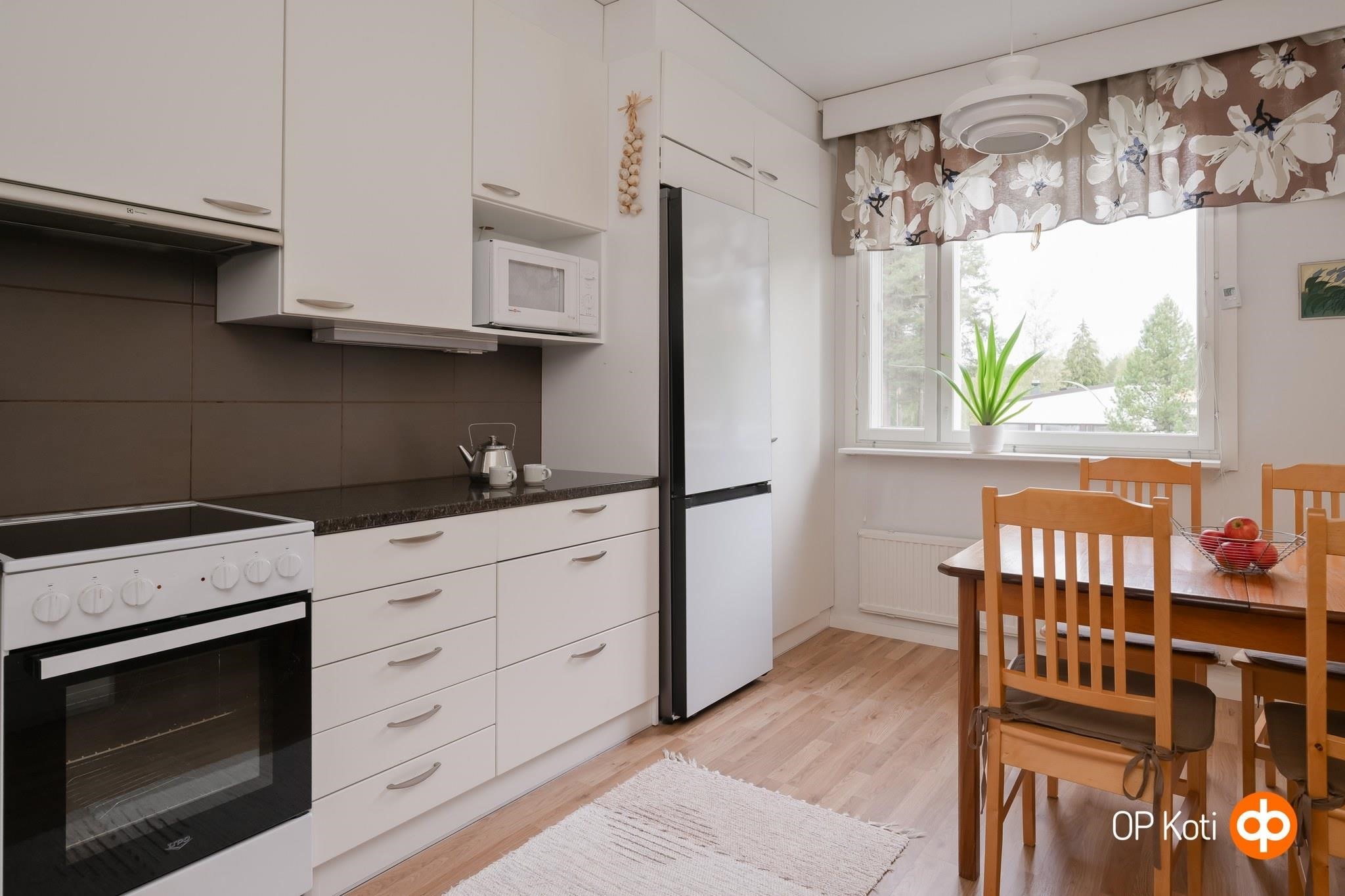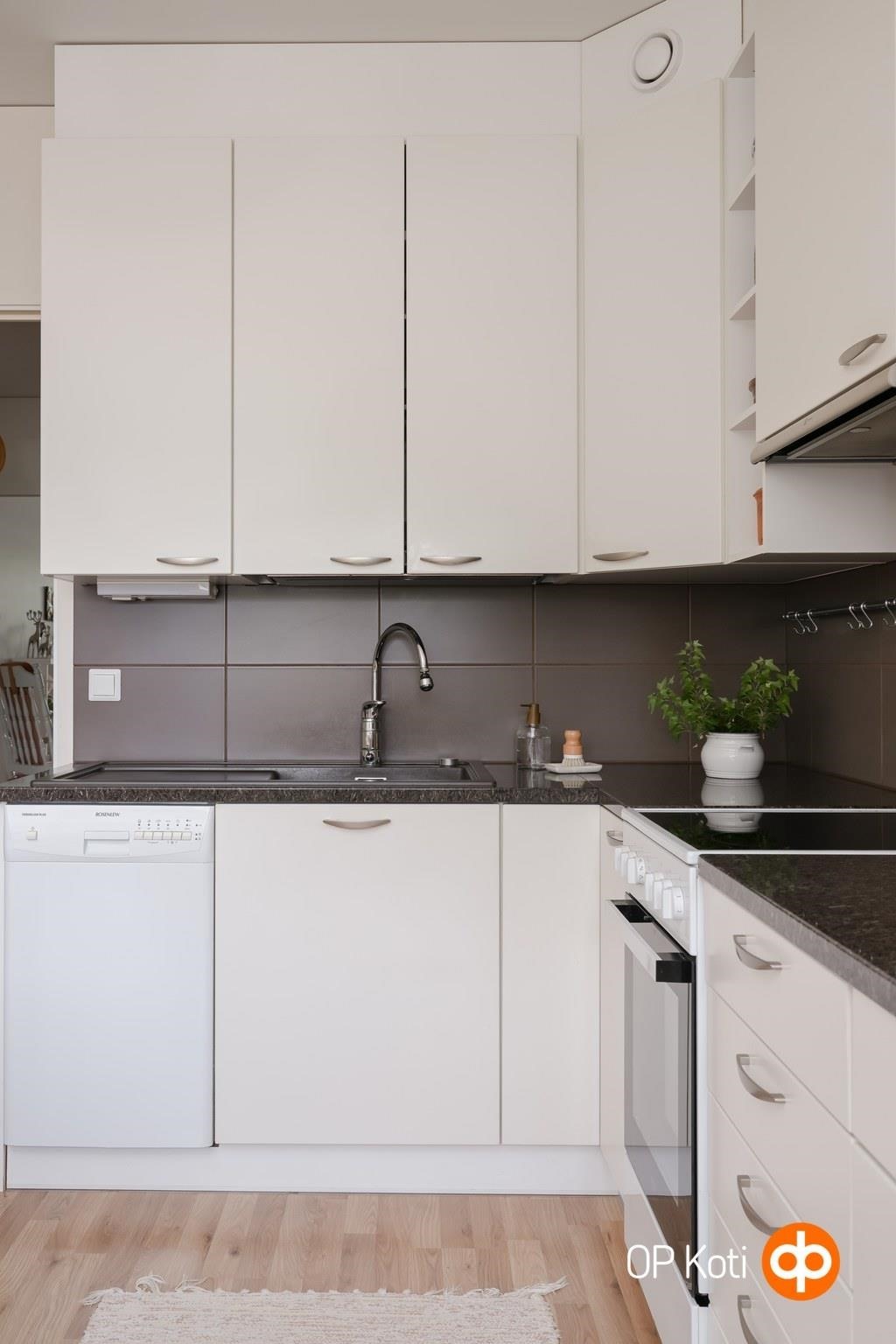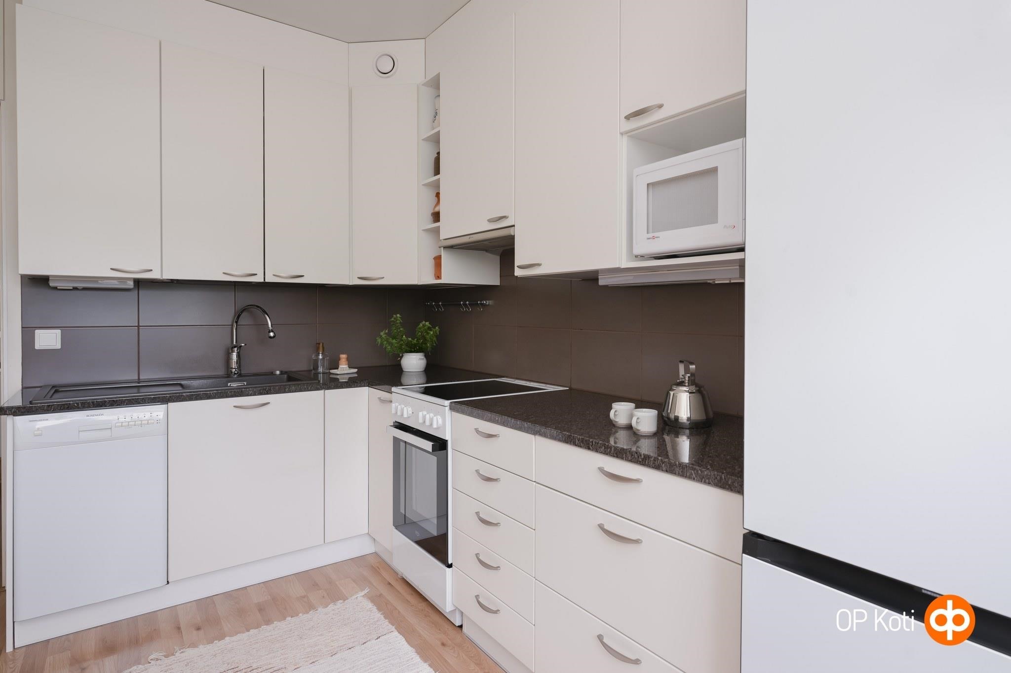 - Jääkaappipakastin, keraaminen liesi, liesituuletin, astianpesukone, kaapistot, kiinteät valaisimet.