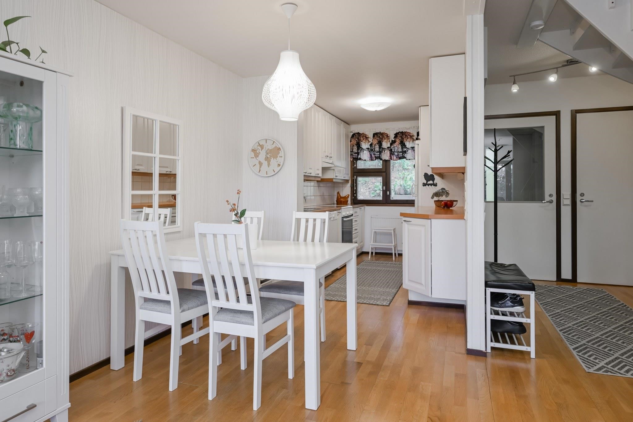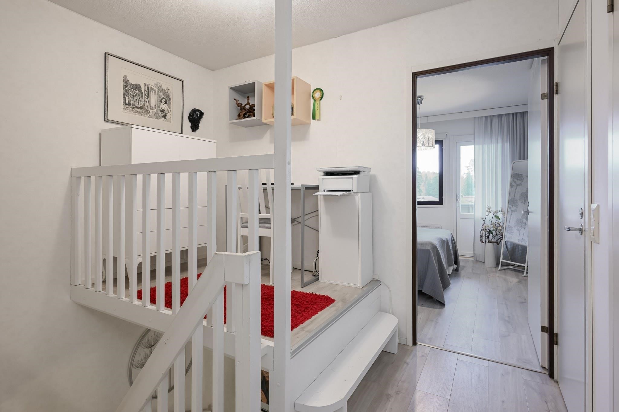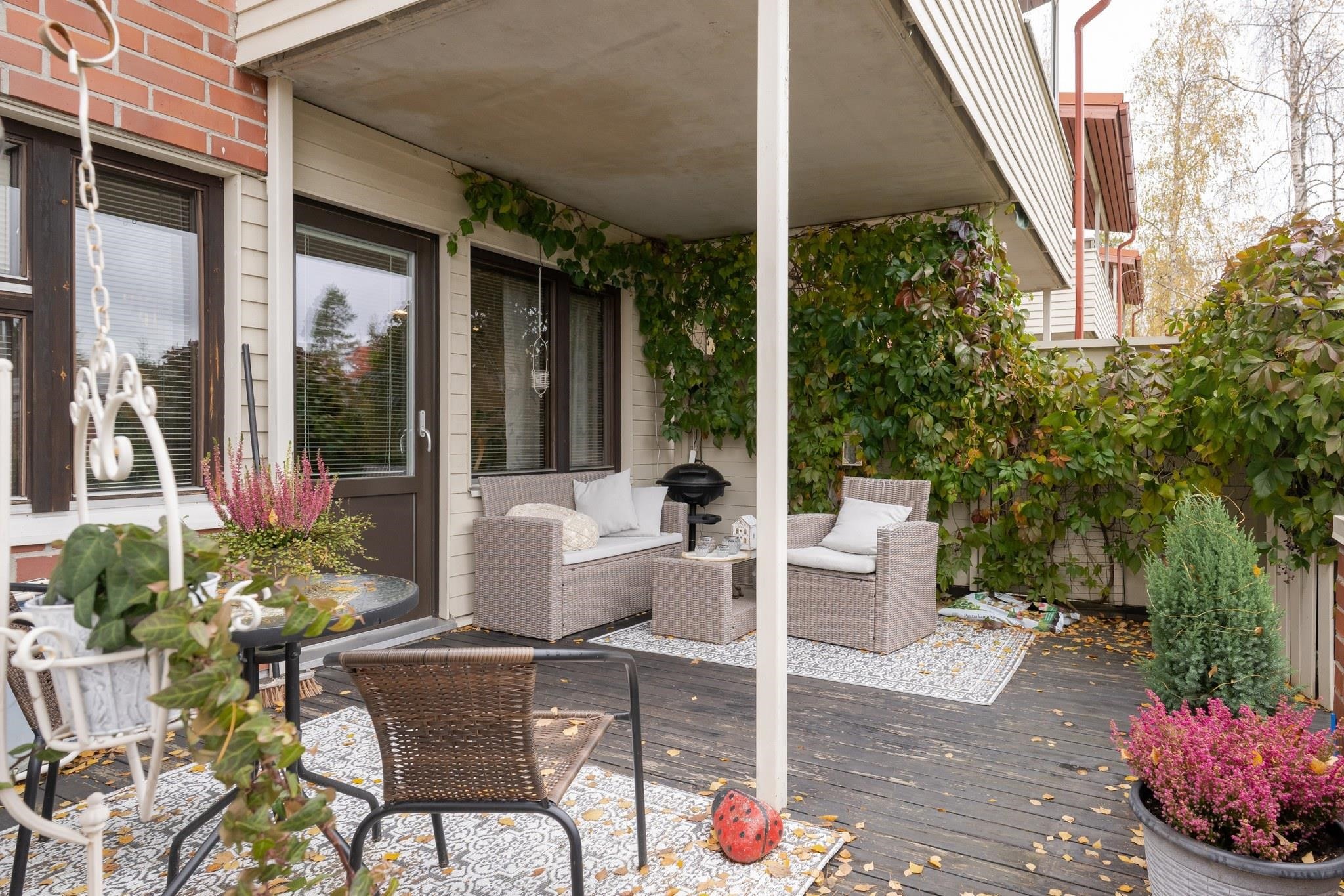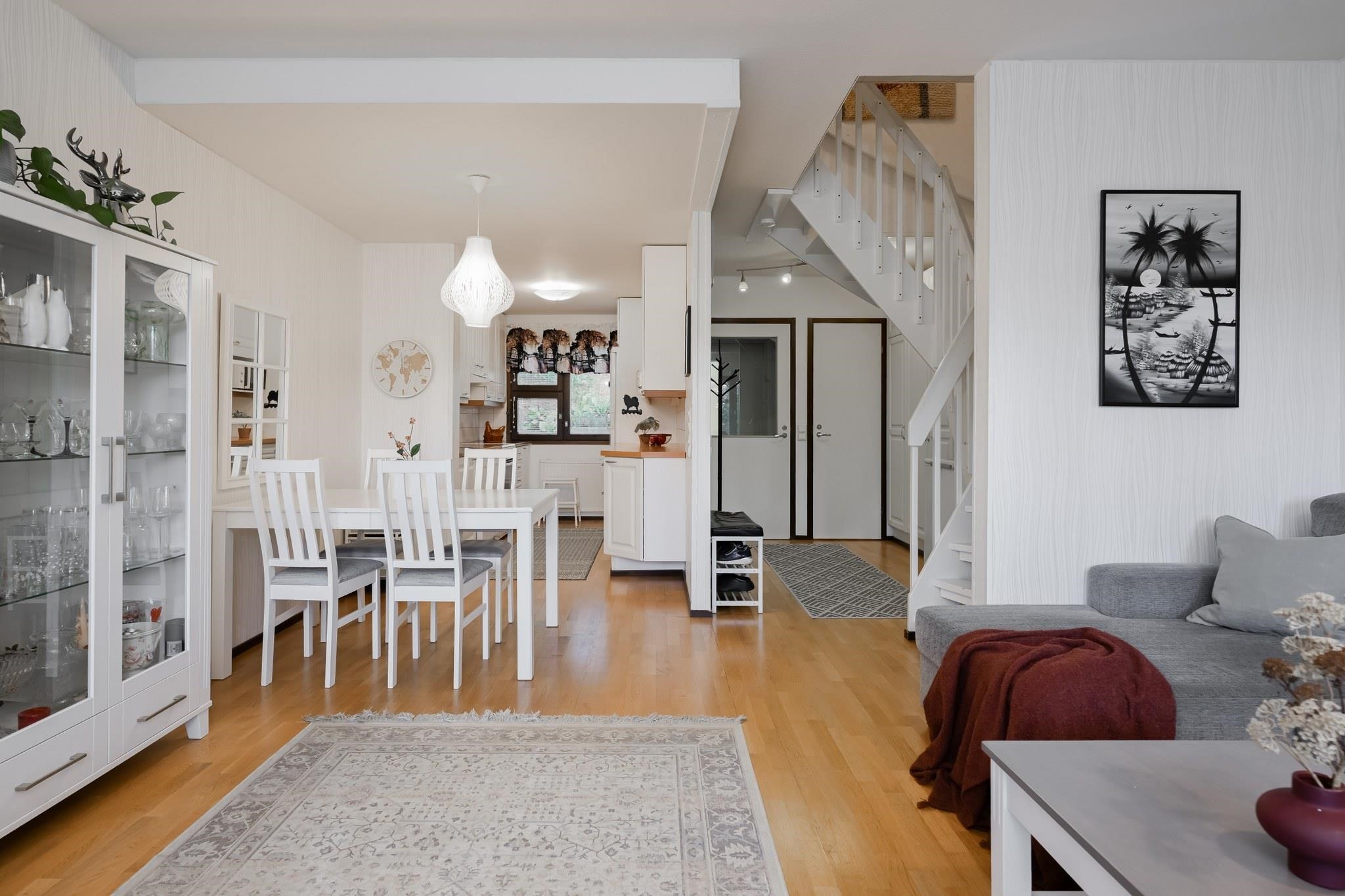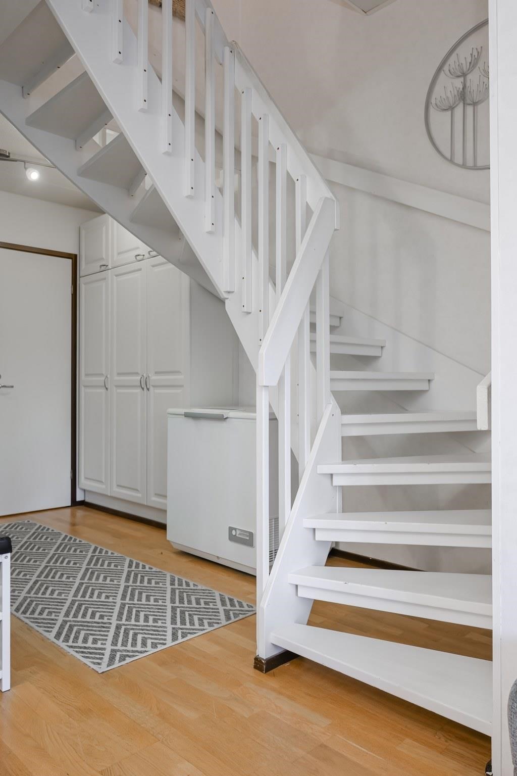 Huoneiston sisääntulo kerroksessa on erillinen wc, keittiö, olohuone ja terassi. Toisessa kerroksessa on kätevä parvi portaikon päällä, pesuhuone, sauna, toinen erillinen wc ja kaksi makuuhuonetta, jossa toisessa parveke. Pienillä päivityksillä tässä käytännöllisessä kodissa viihtyy varmasti pidempäänkin, eikä mitään silti ole välttämätöntä tehdä.