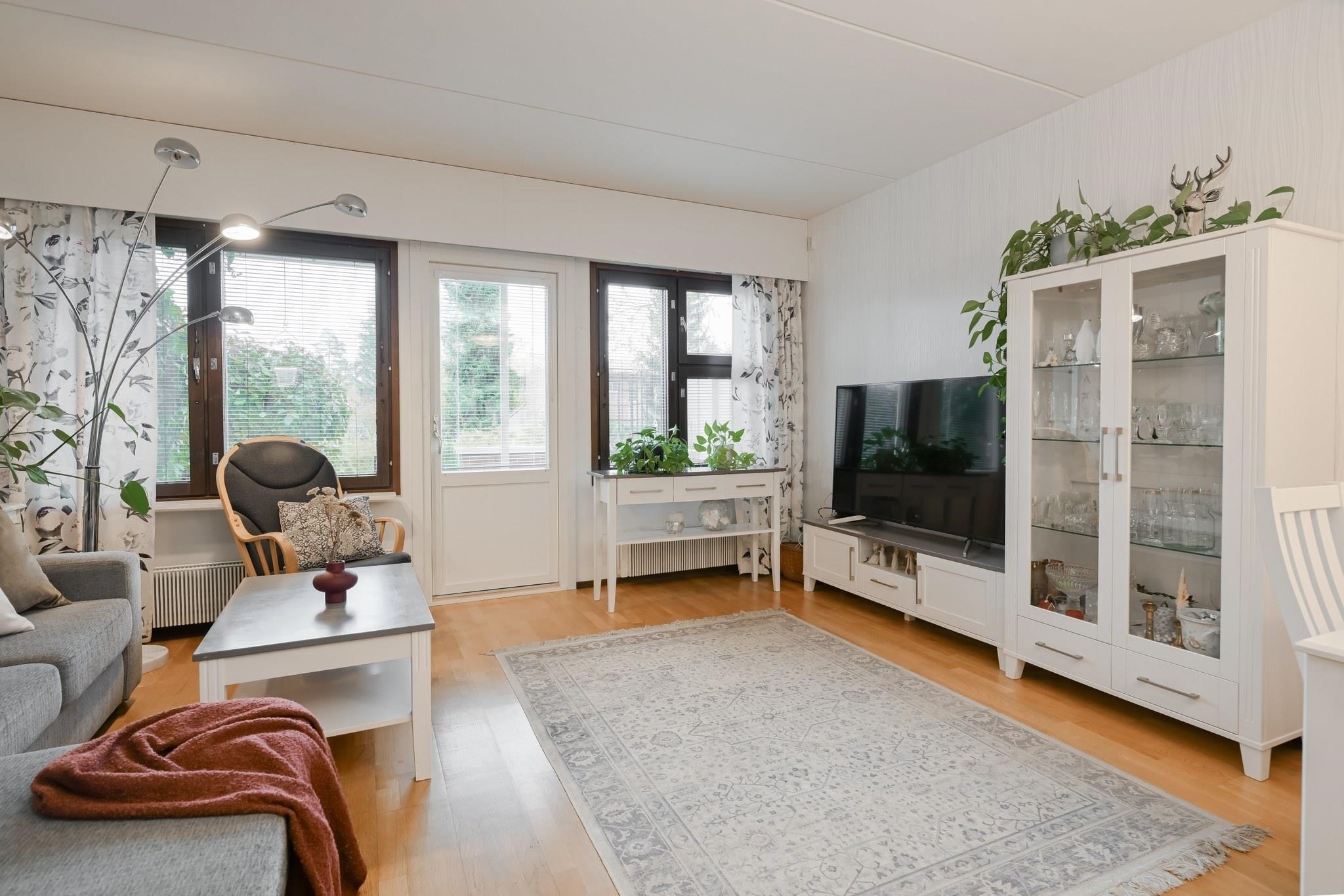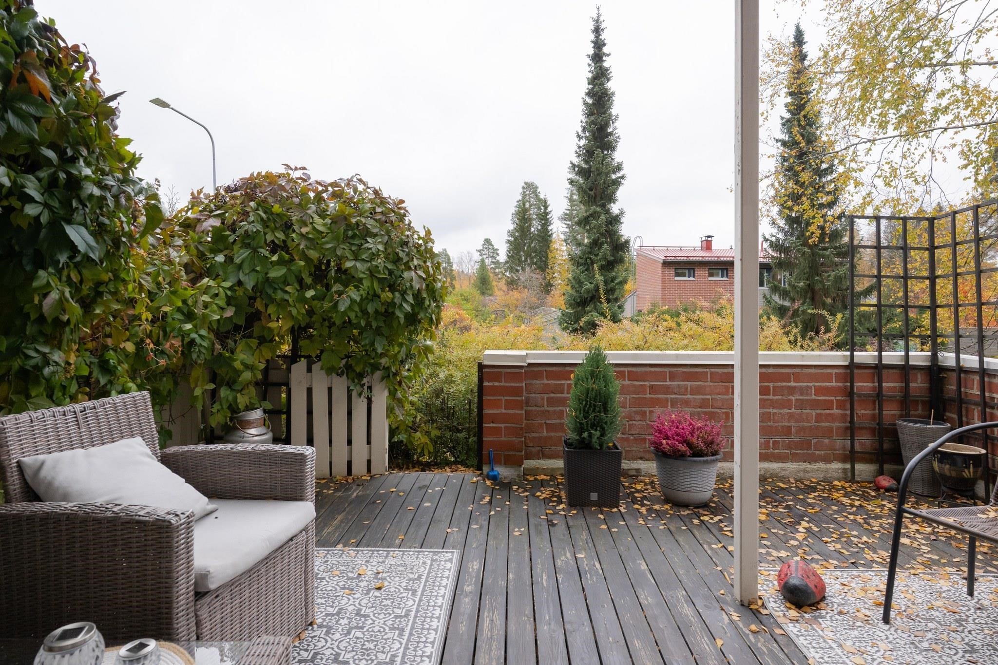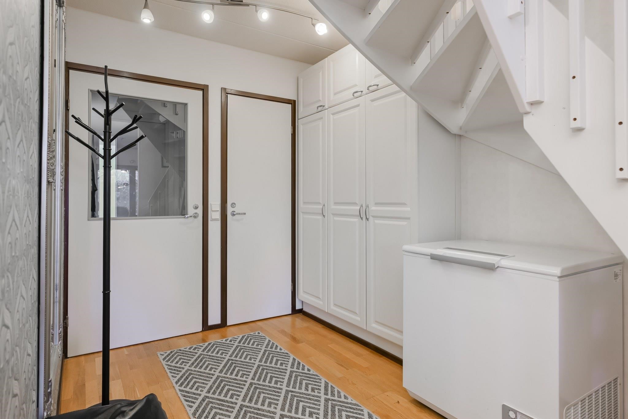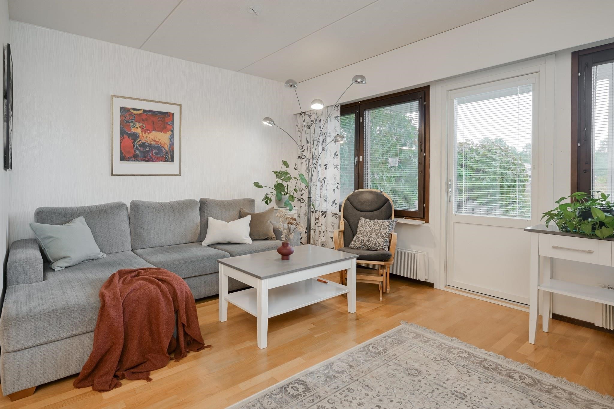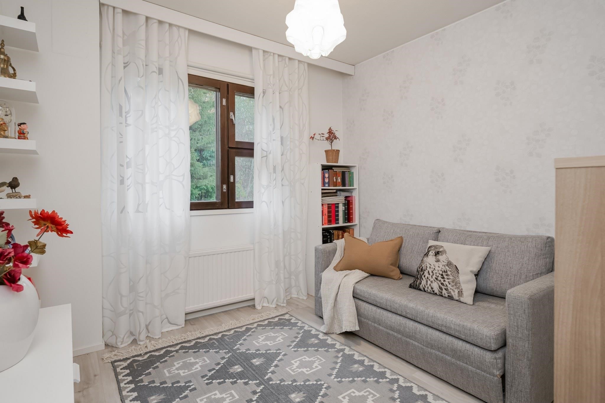 Huoneiston sisääntulo kerroksessa on erillinen wc, keittiö, olohuone ja terassi. Toisessa kerroksessa on kätevä parvi portaikon päällä, pesuhuone, sauna, toinen erillinen wc ja kaksi makuuhuonetta, jossa toisessa parveke. Pienillä päivityksillä tässä käytännöllisessä kodissa viihtyy varmasti pidempäänkin, eikä mitään silti ole välttämätöntä tehdä.