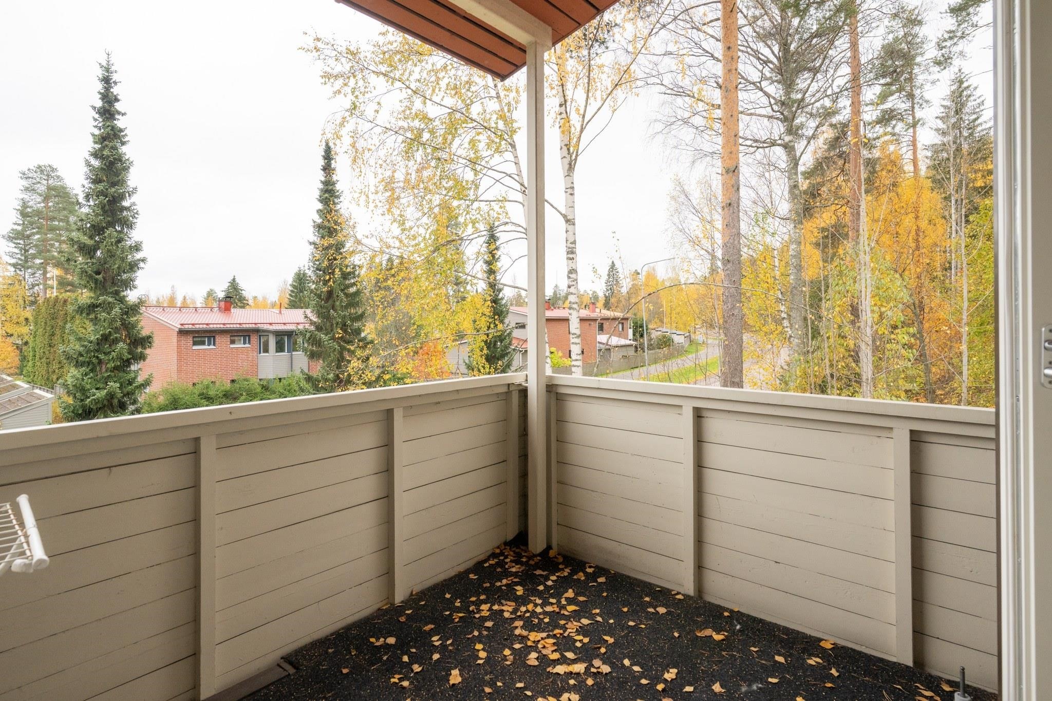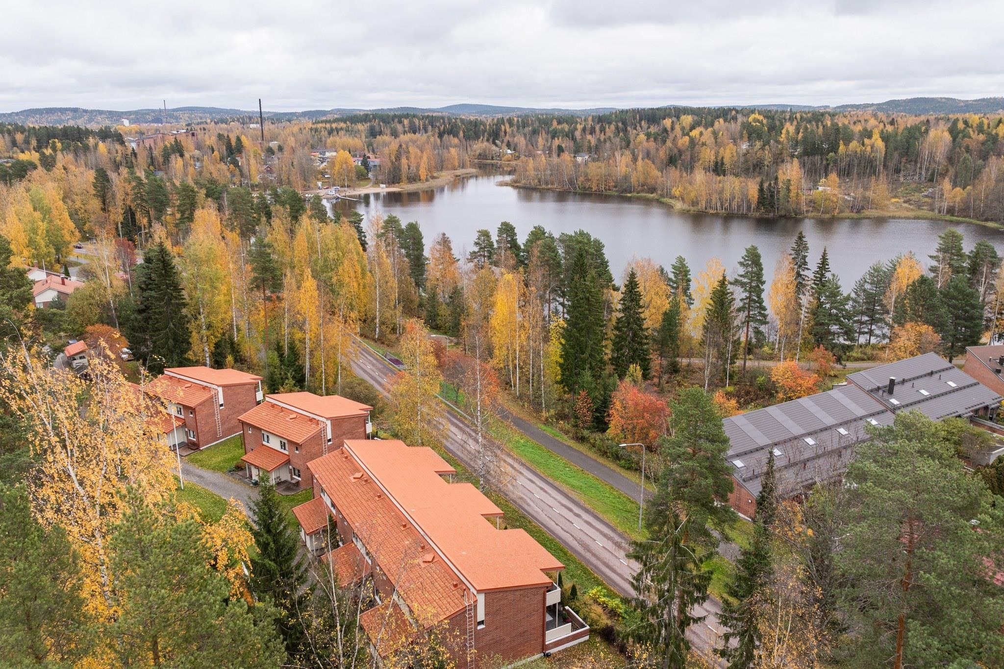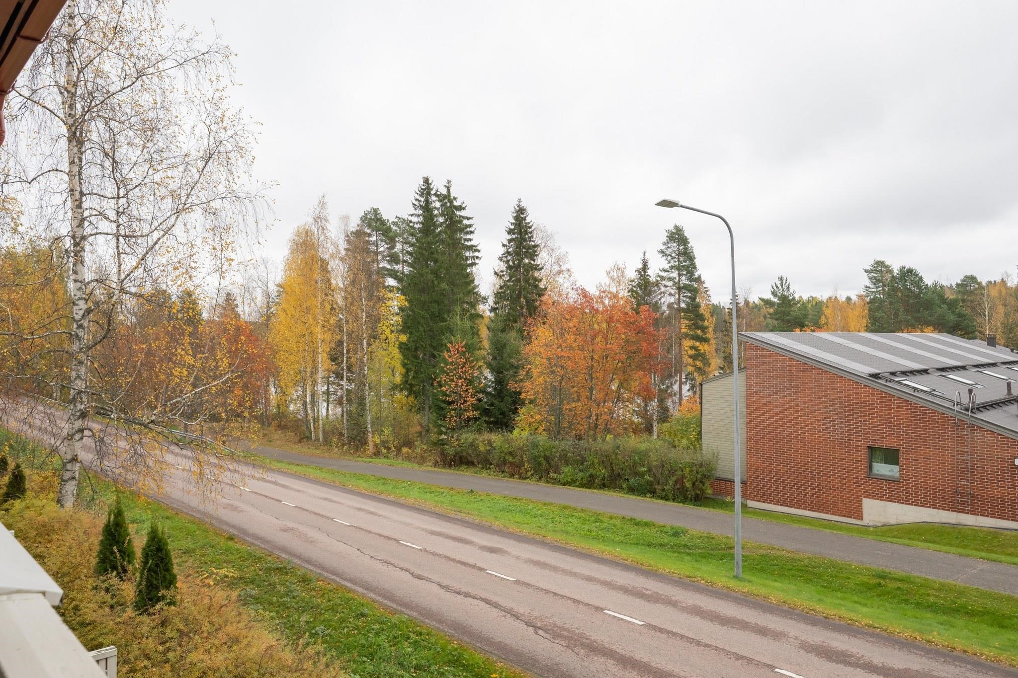 - Keittiö ja yksi makuuhuone länteen. Puistometsänäkymät. Olohuone ja terasso sekä yläkerran parveke itään ja näkymät pientaloalueelle ja Päijänteelle