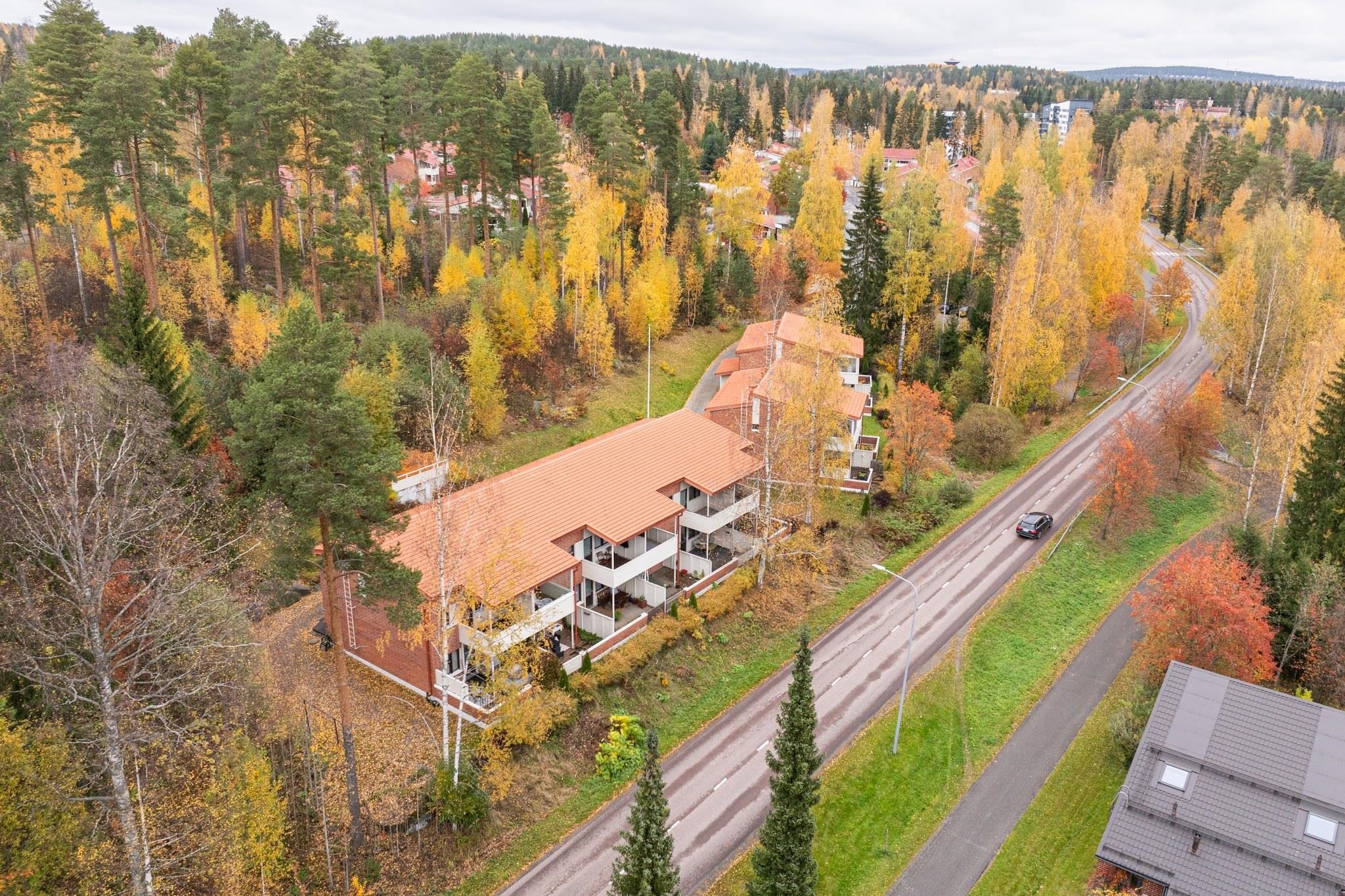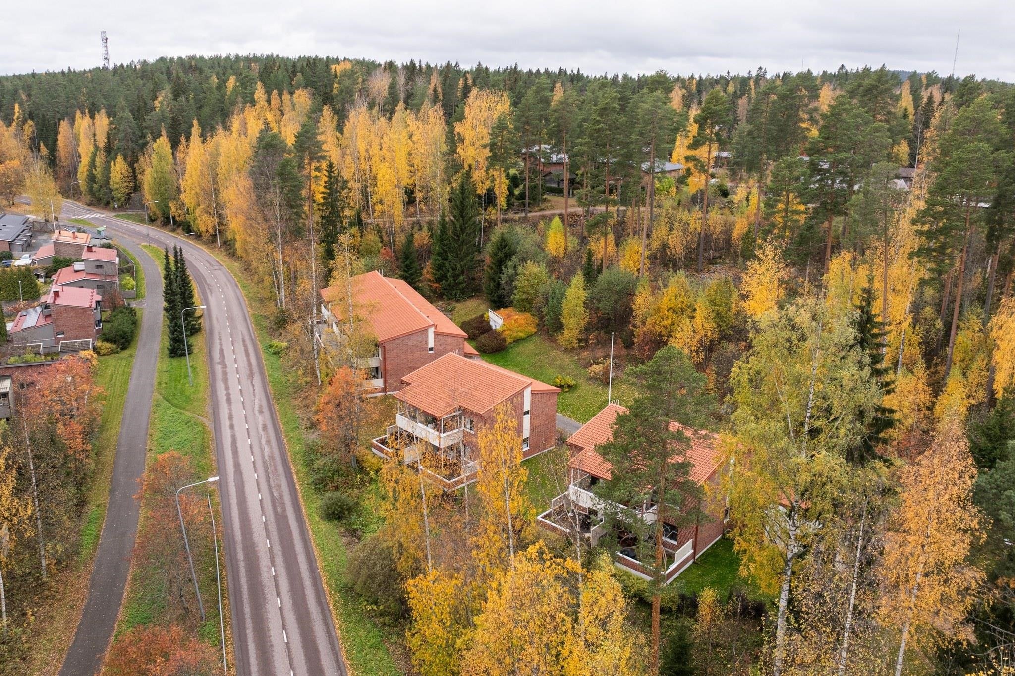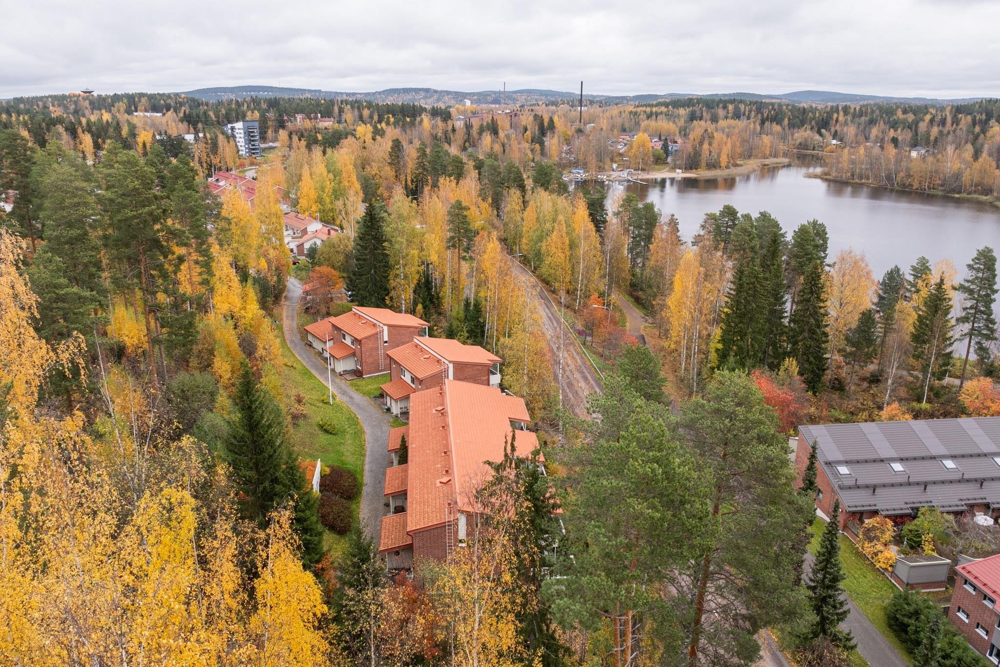 - Keittiö ja yksi makuuhuone länteen. Puistometsänäkymät. Olohuone ja terasso sekä yläkerran parveke itään ja näkymät pientaloalueelle ja Päijänteelle