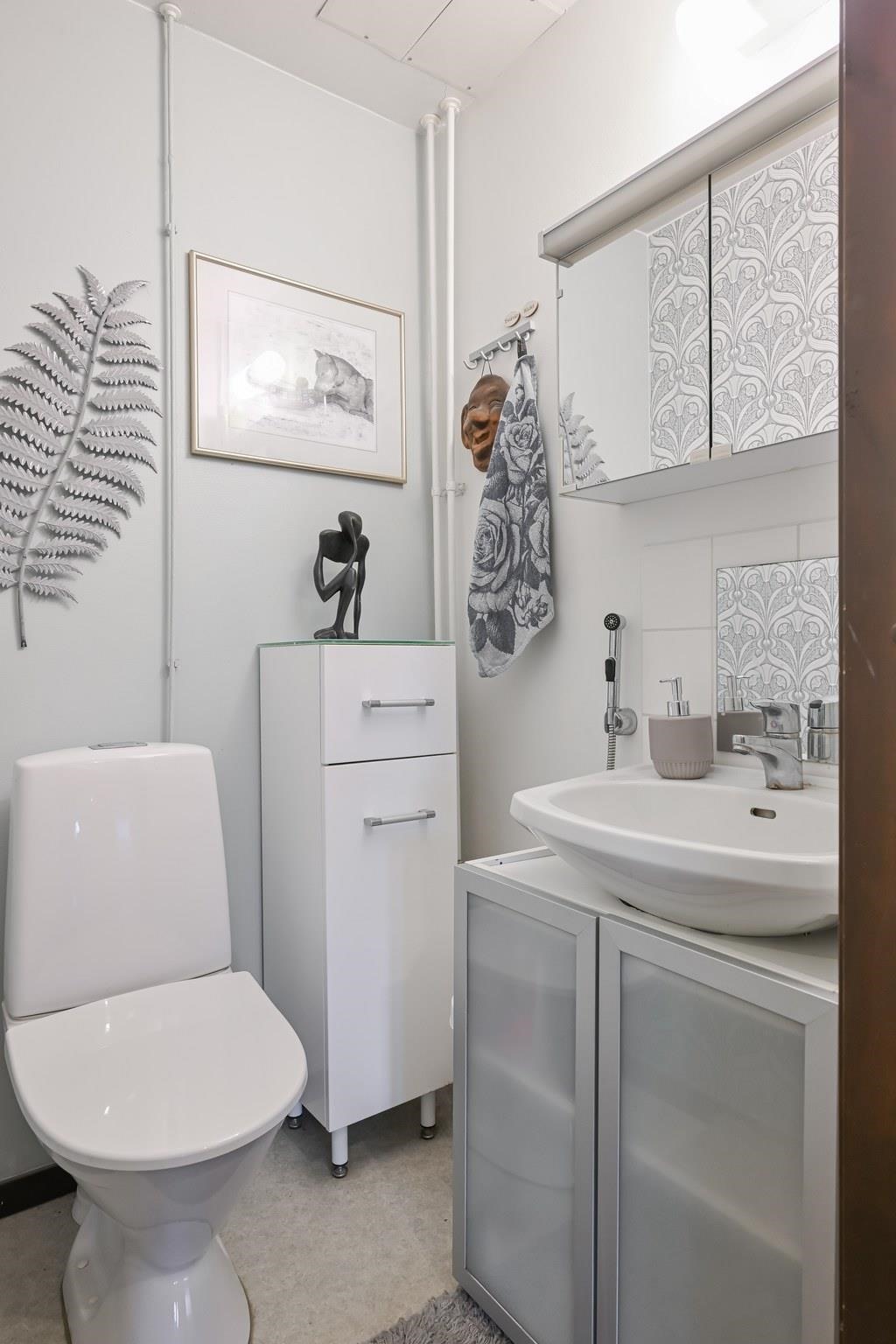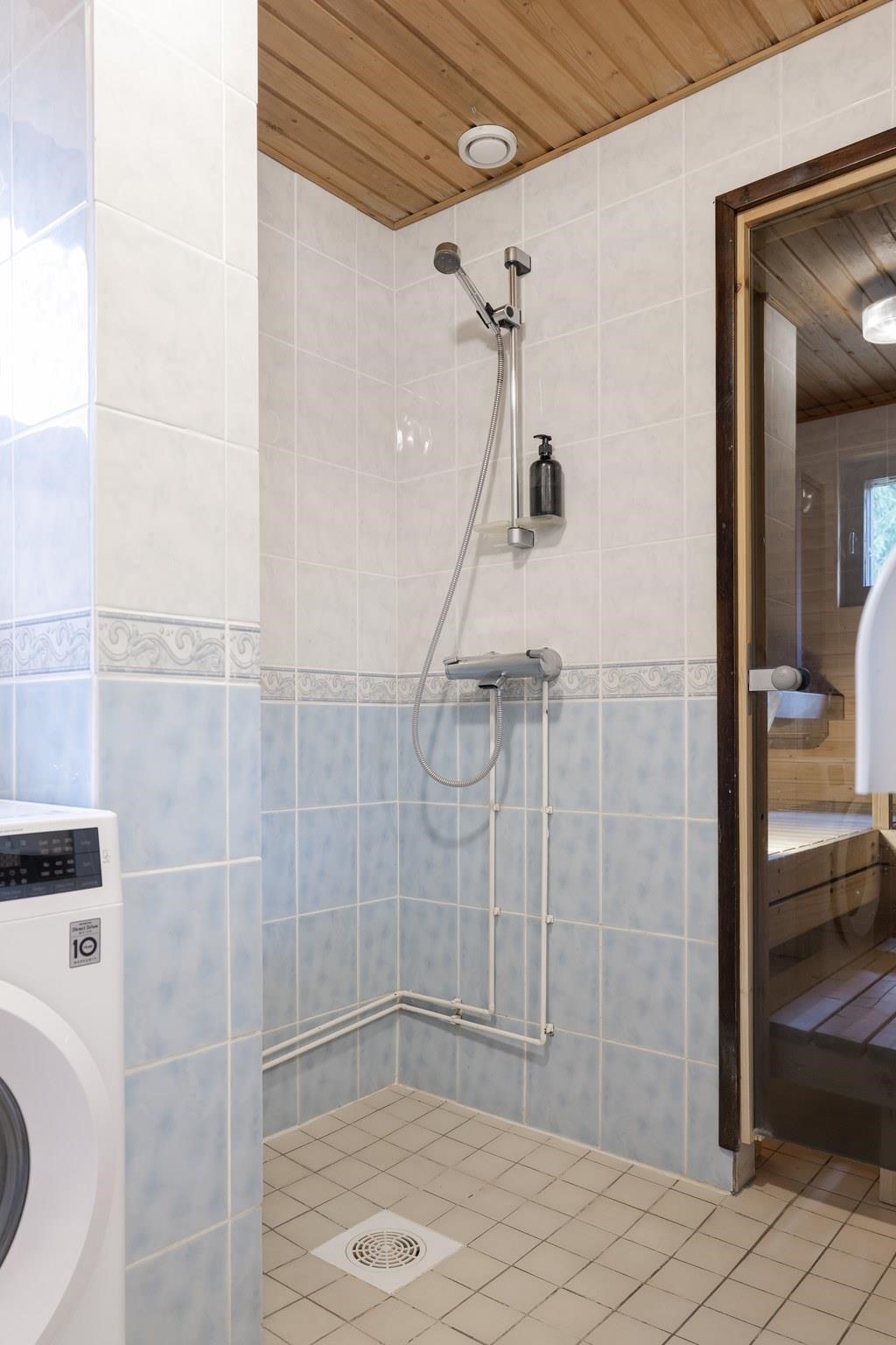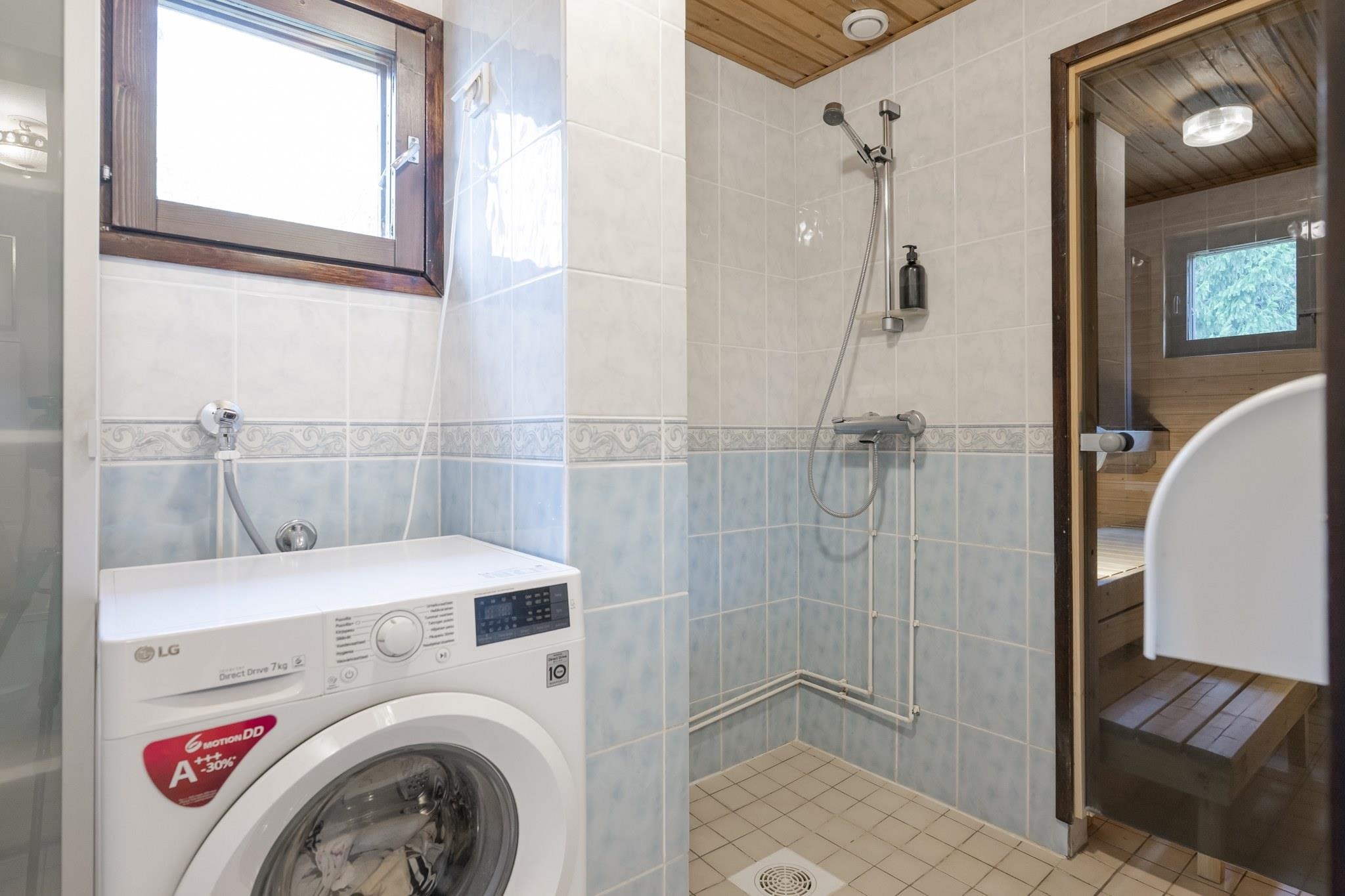 - Molemmissa kerroksissa omat erilliset wc-tilat, yläkerrassa pesuhuone ja sauna. Varusteina pesutiloissa on 2x wc-istuin, 2x pesuallas, 2x allaskaappi, peili, peilikaappi, bideesuihku, pesukoneliitäntä, suihku, sauna, sähkökiuas ja kiinteät valaisimet.