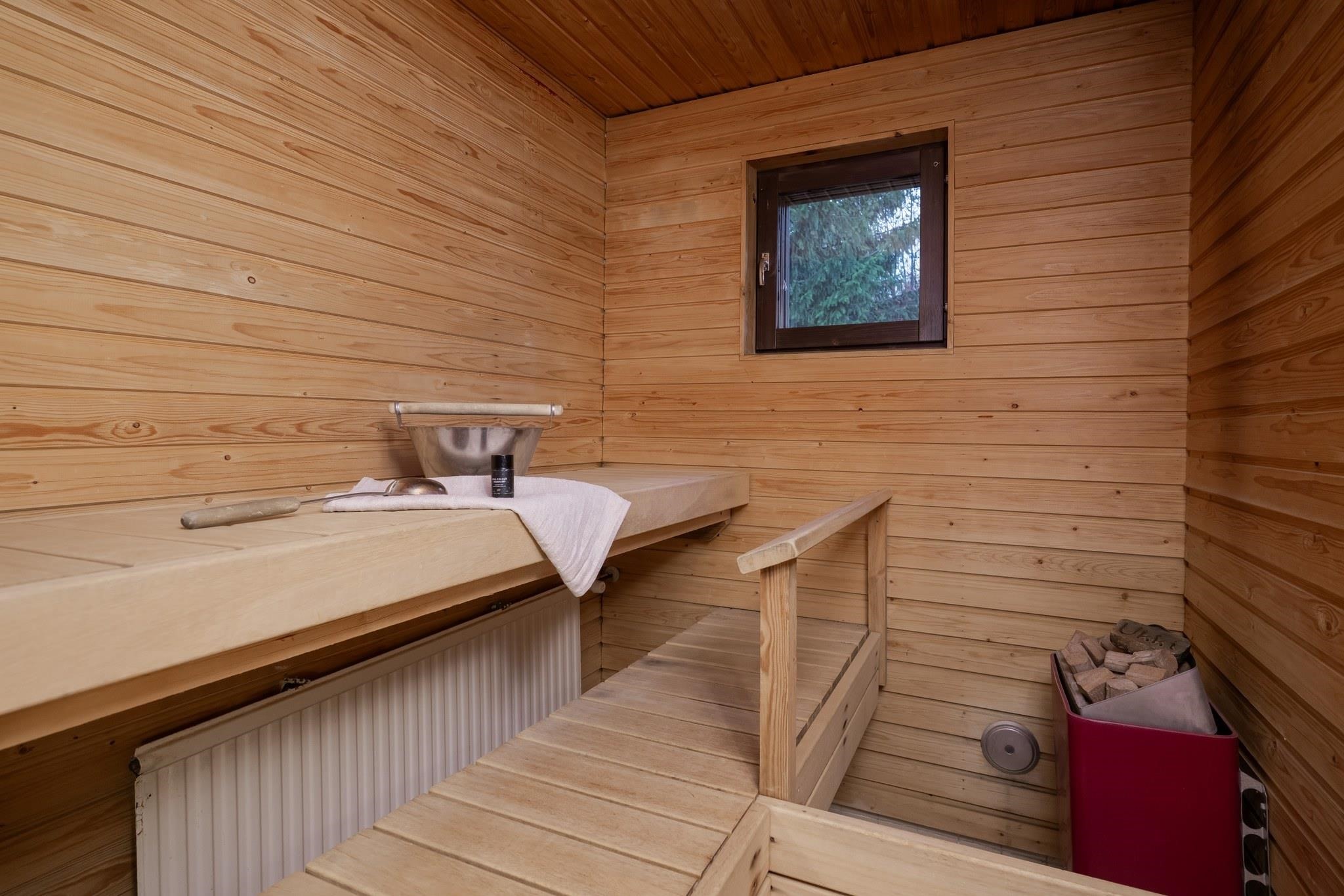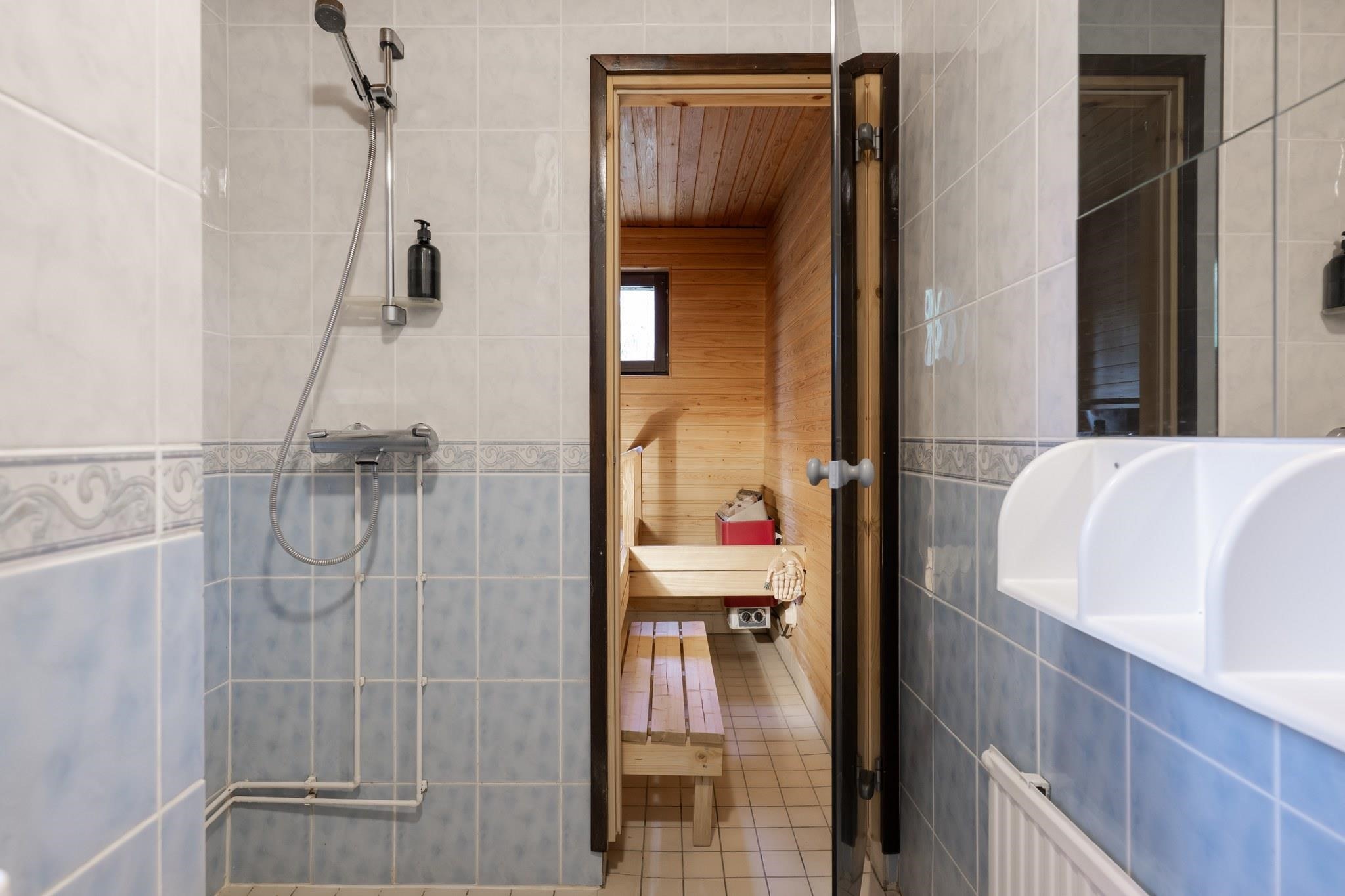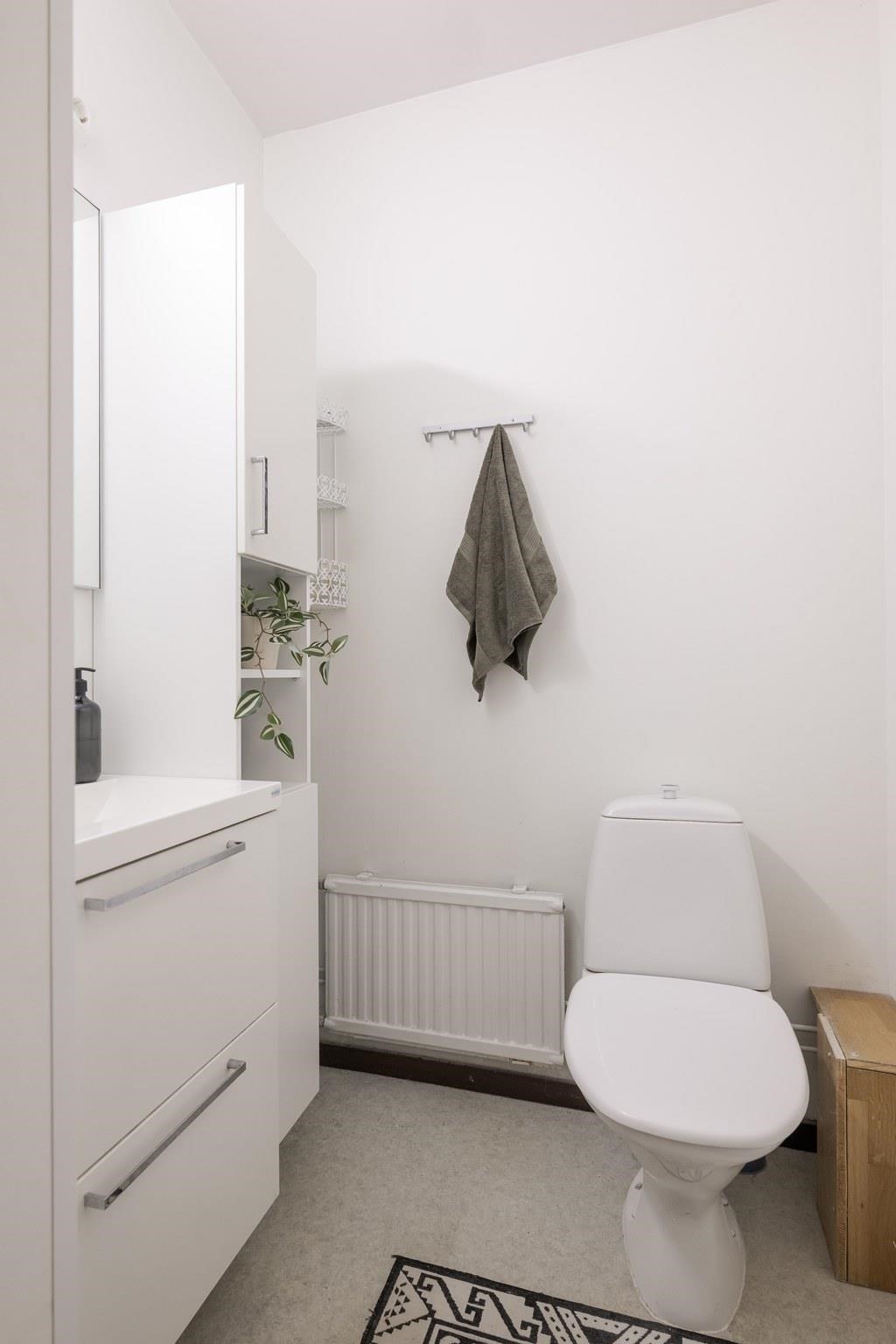 - Molemmissa kerroksissa omat erilliset wc-tilat, yläkerrassa pesuhuone ja sauna. Varusteina pesutiloissa on 2x wc-istuin, 2x pesuallas, 2x allaskaappi, peili, peilikaappi, bideesuihku, pesukoneliitäntä, suihku, sauna, sähkökiuas ja kiinteät valaisimet.