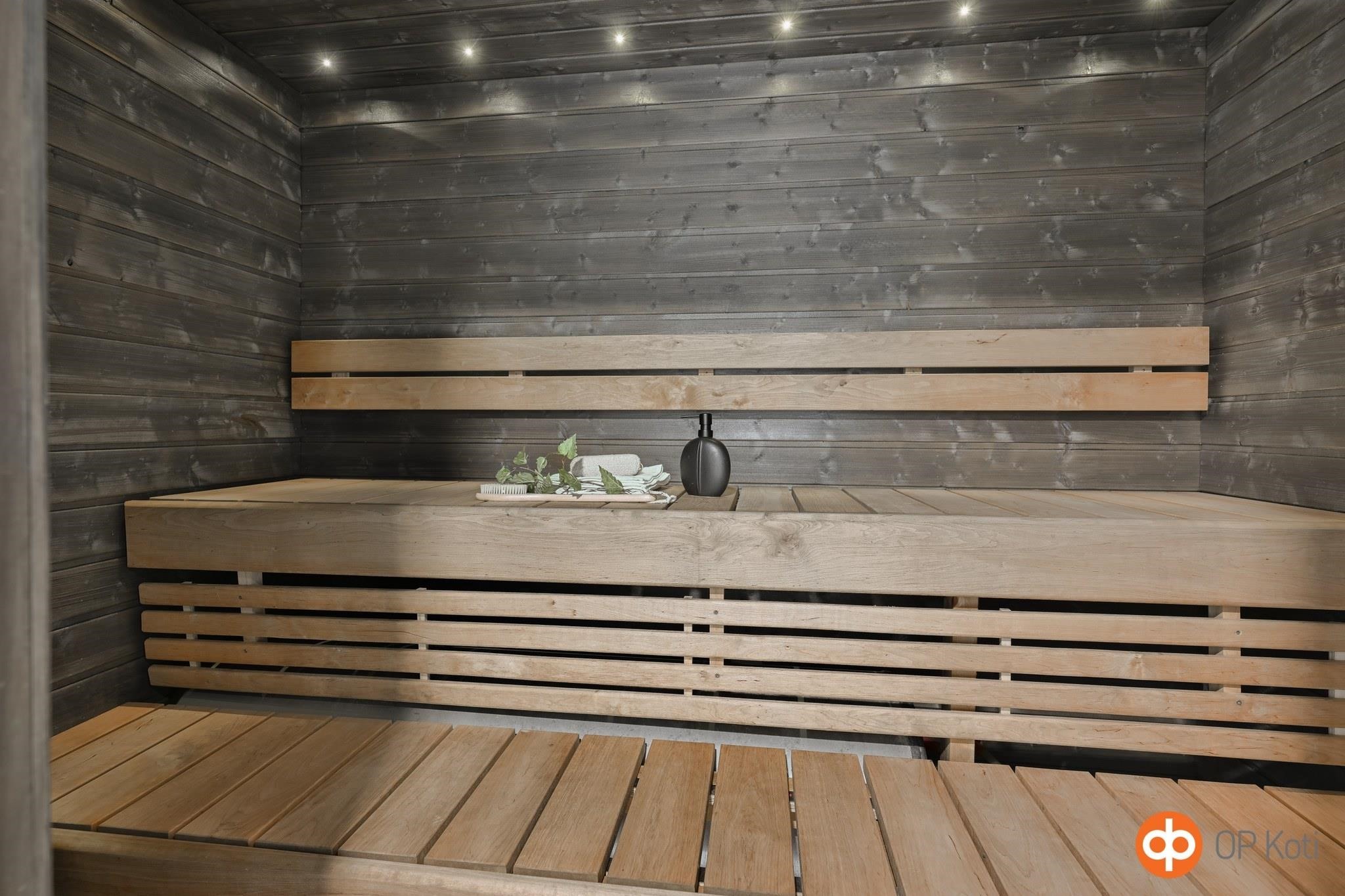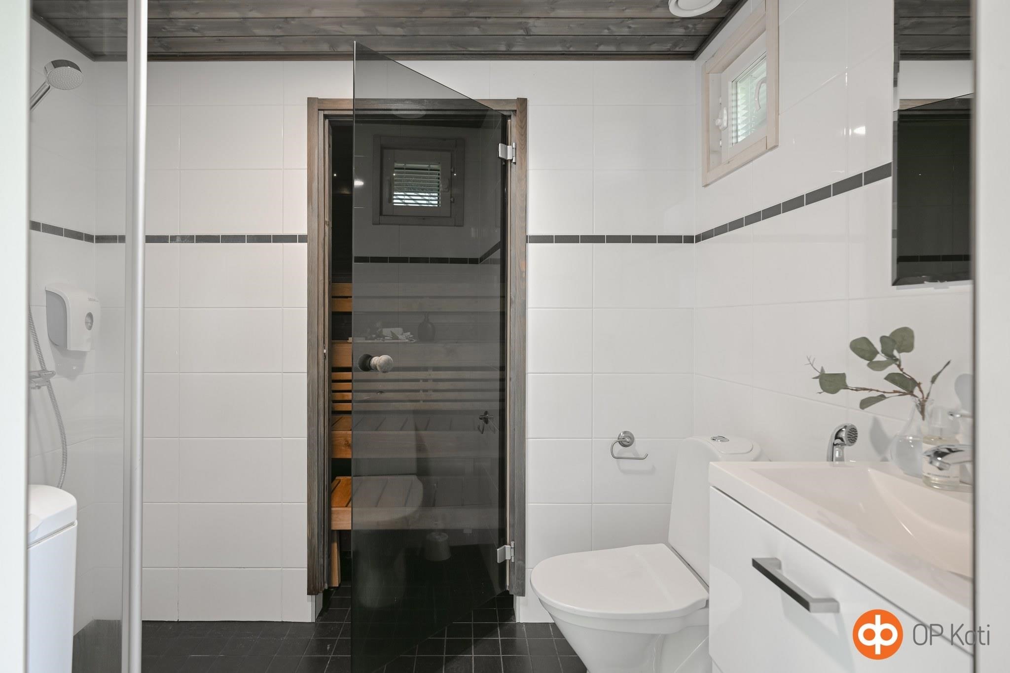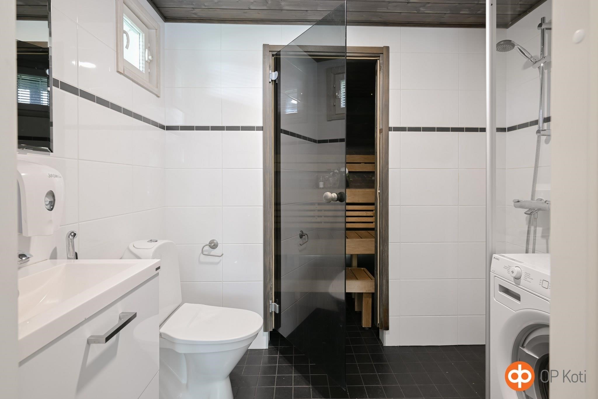 - Sauna, sähkökiuas, kylpyhuone, erillinen wc, suihku, suihkuseinä, peilit, allaskaappi, pesukoneliitäntä, lattialämmitys, kiinteät valaisimet.