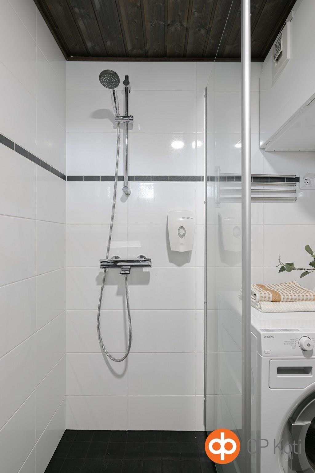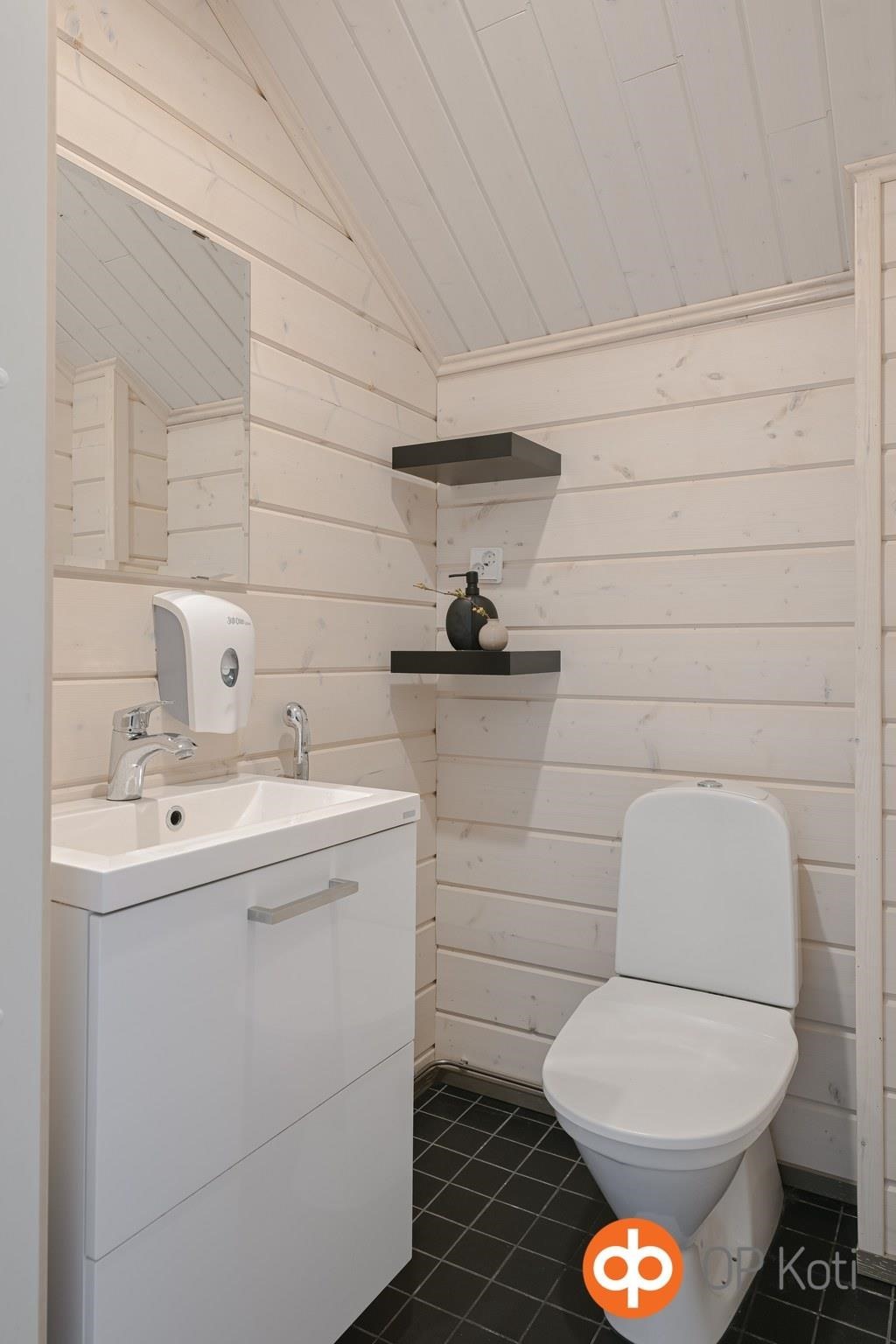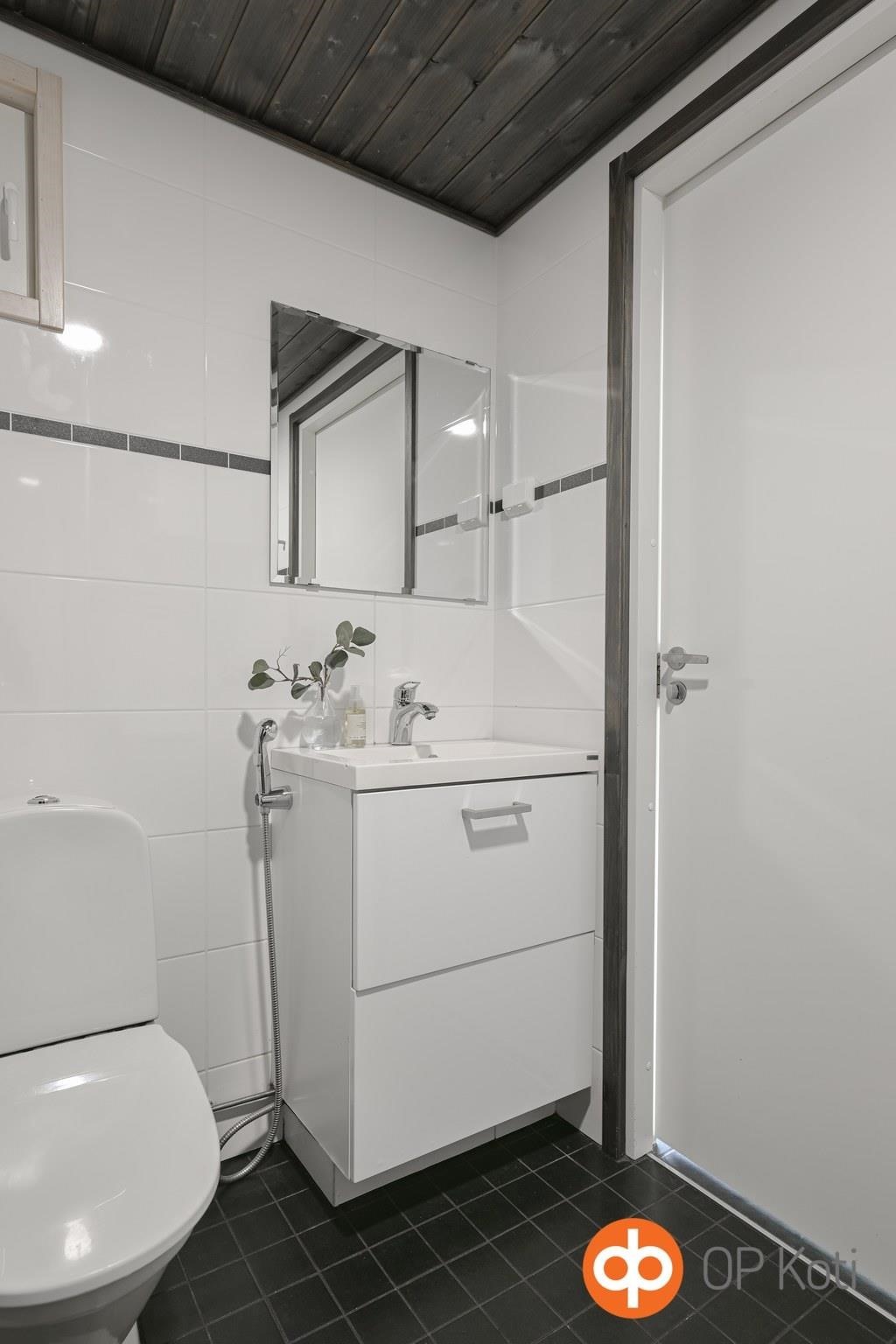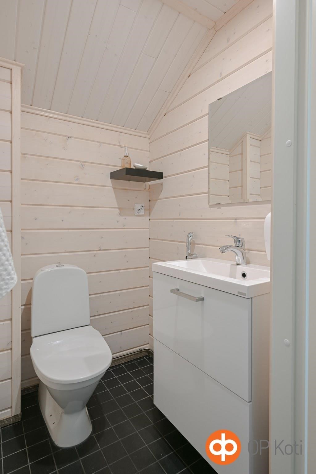 - Sauna, sähkökiuas, kylpyhuone, erillinen wc, suihku, suihkuseinä, peilit, allaskaappi, pesukoneliitäntä, lattialämmitys, kiinteät valaisimet.