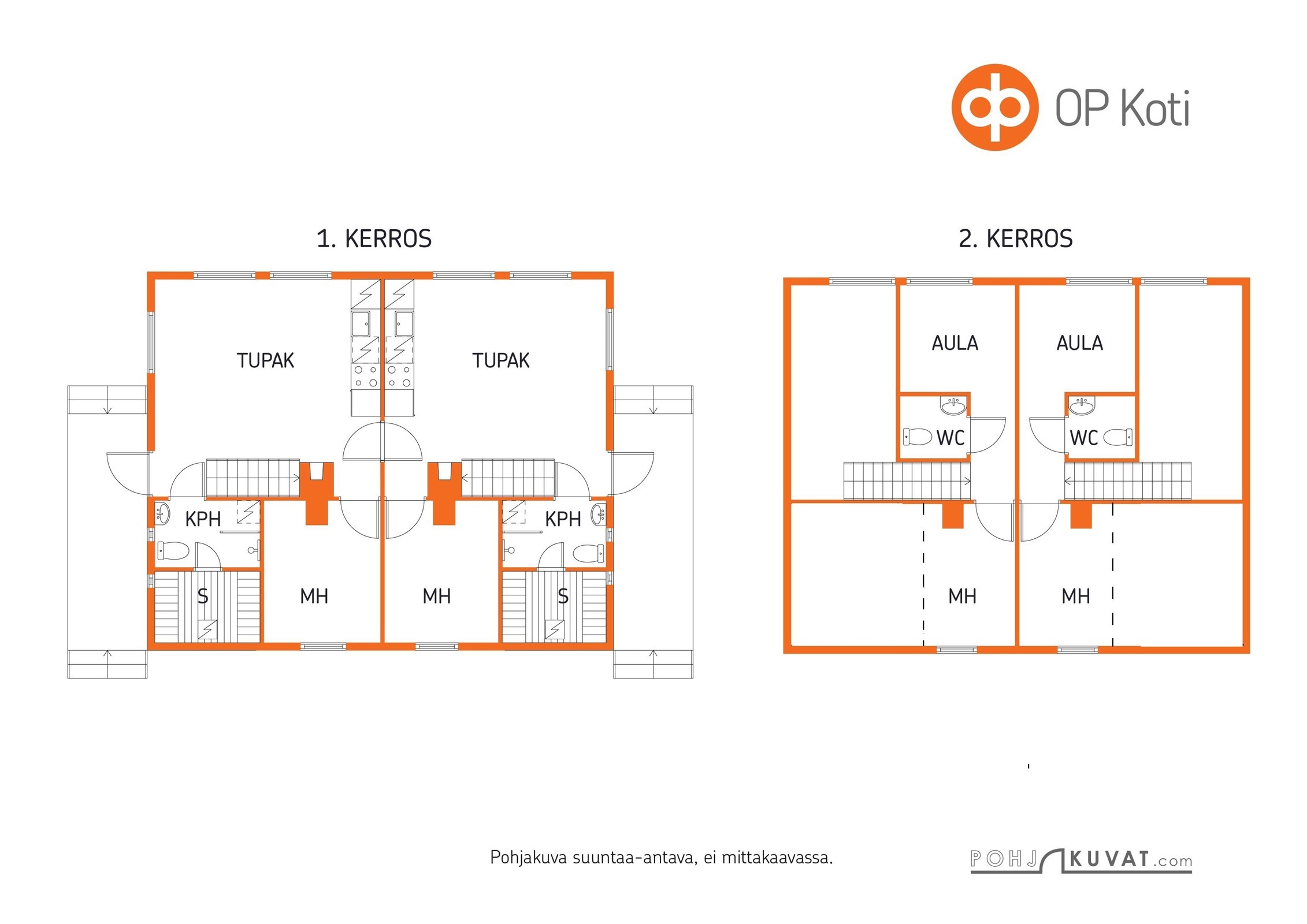 - 116 m2Pinta-alat rakennuspiirustuksista. Asuintilat per huoneisto alakerta 39m², yläkerta 19m²