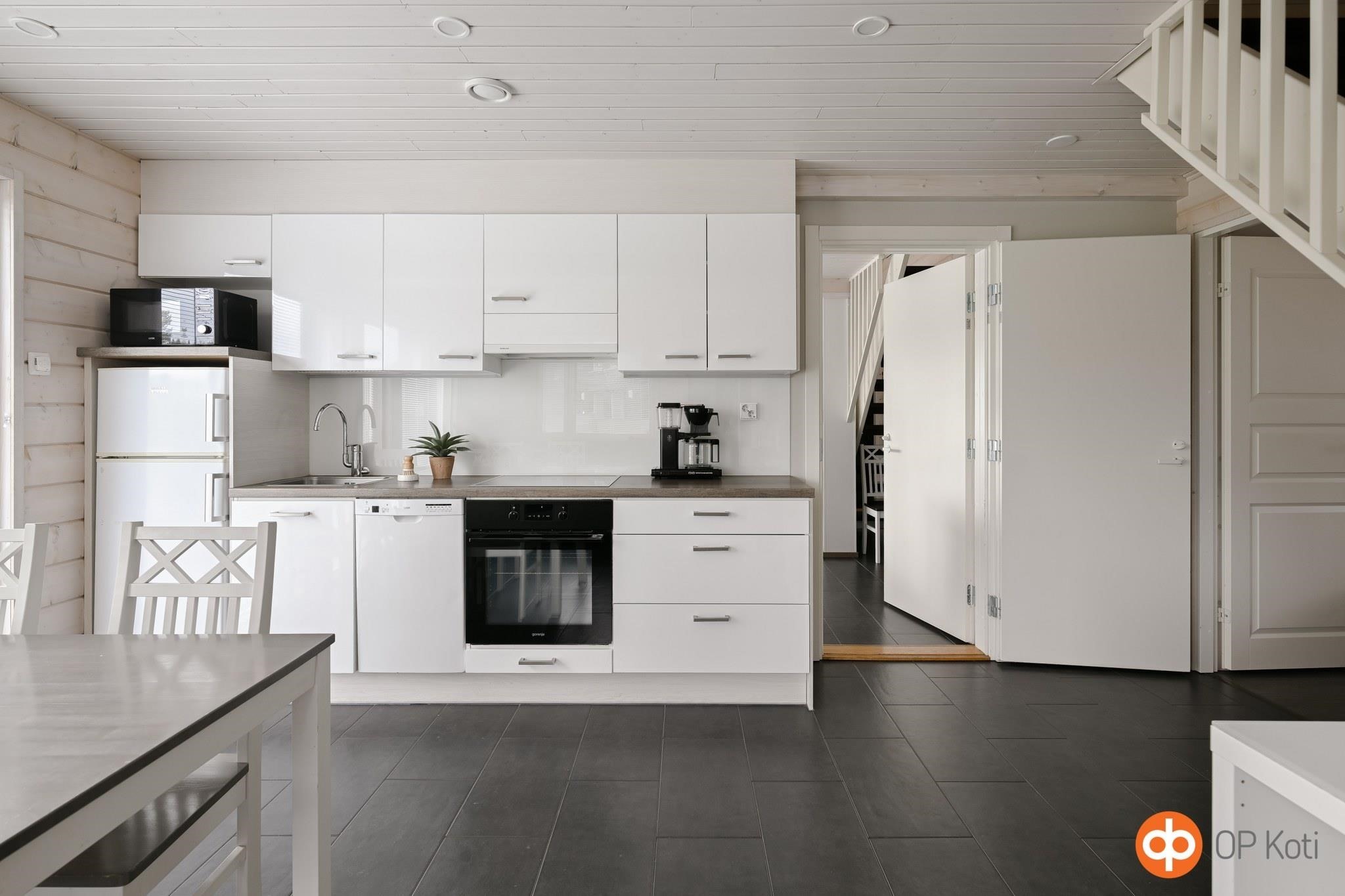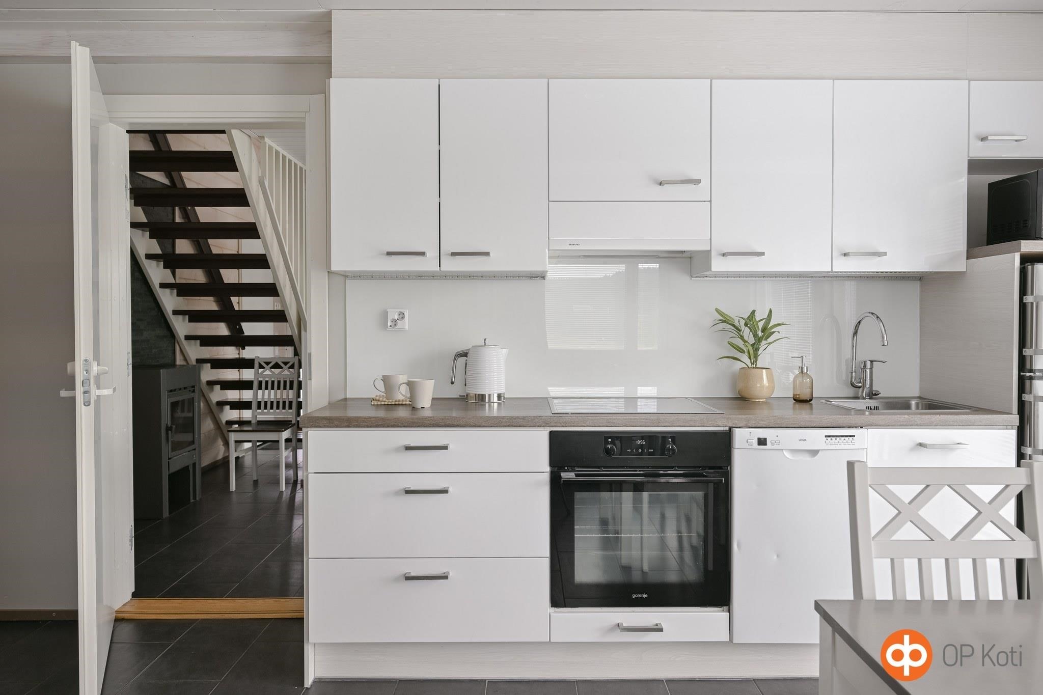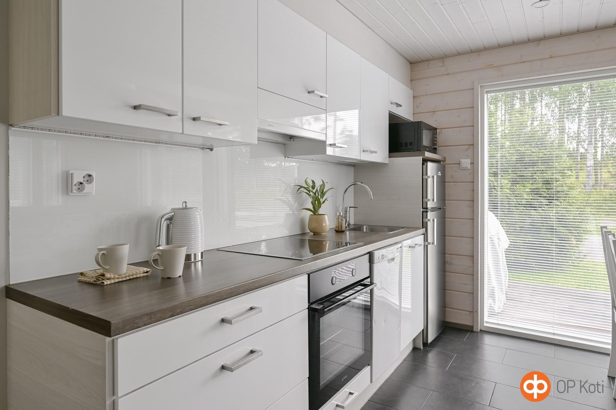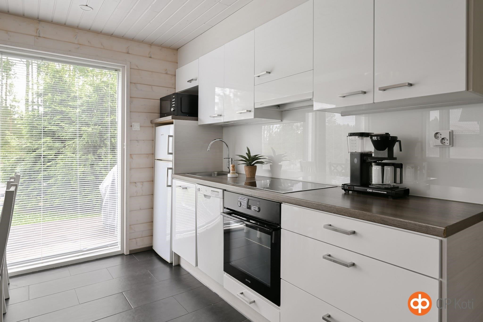 - Jenkkikaappi, erillisuuni, liesitaso keraaminen, liesituuletin, mikroaaltouuni, astianpesukone, kaapistot, kiinteät valaisimet.