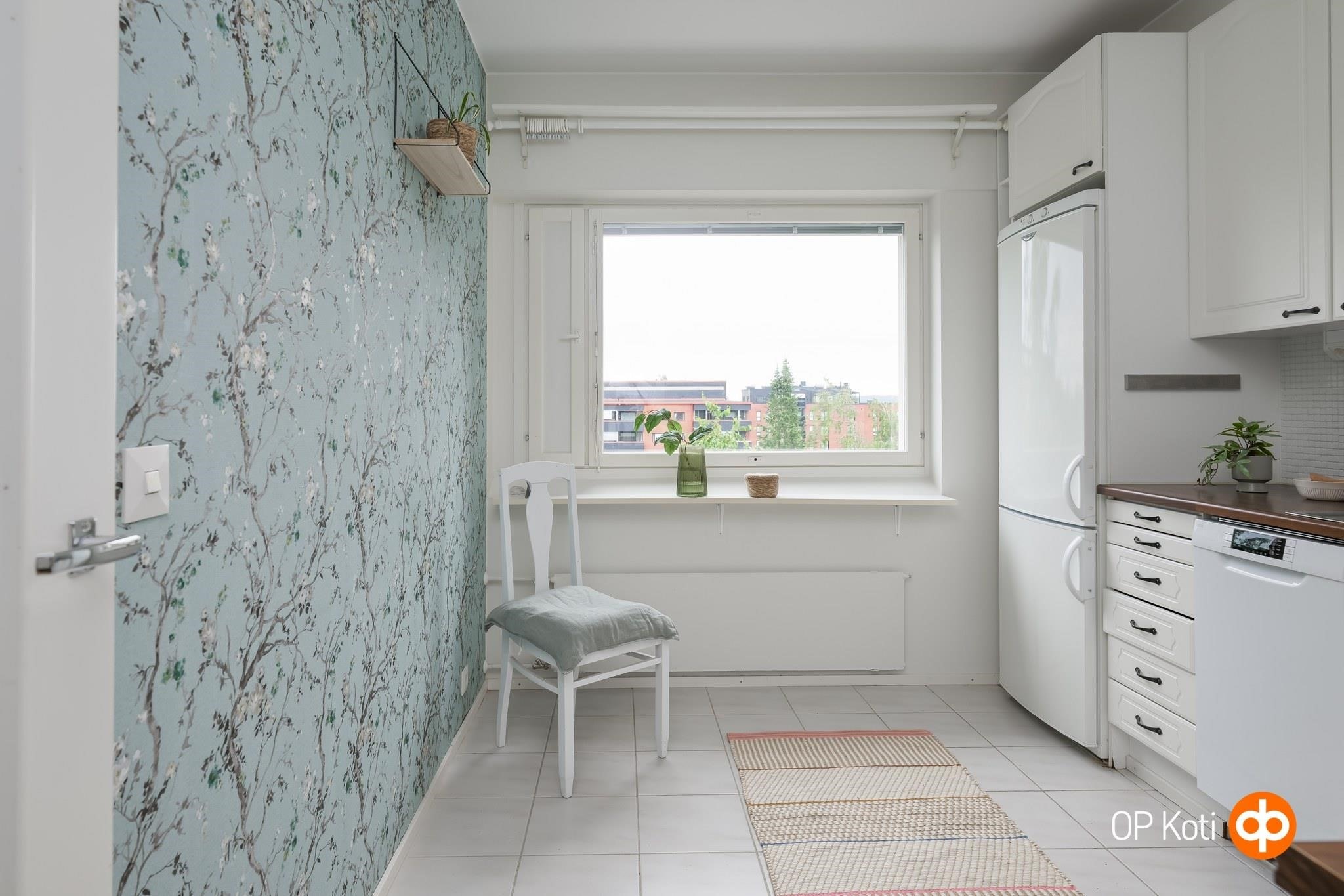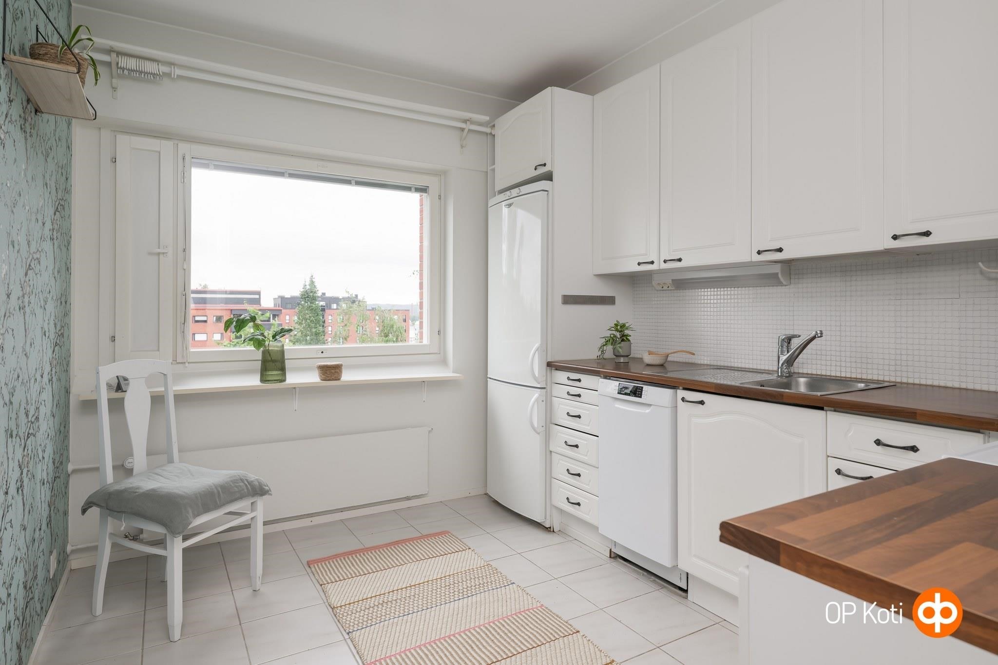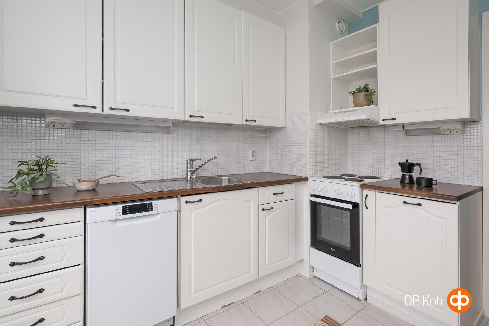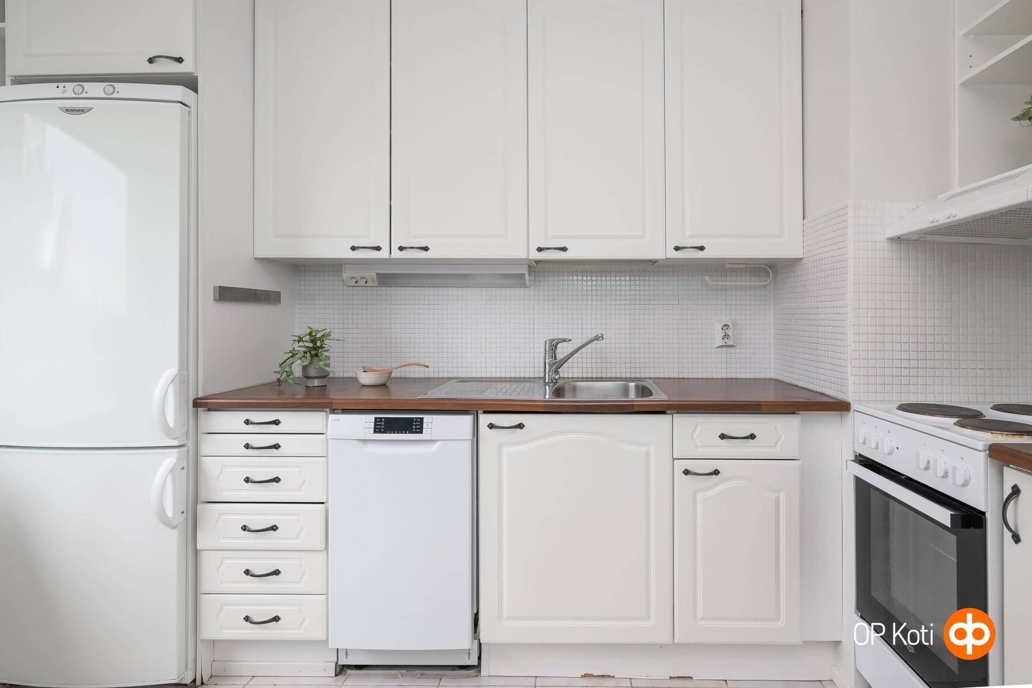 - Jääkaappipakastin, sähköliesi, liesituuletin, astianpesukone, kaapistot, kiinteät valaisimet.